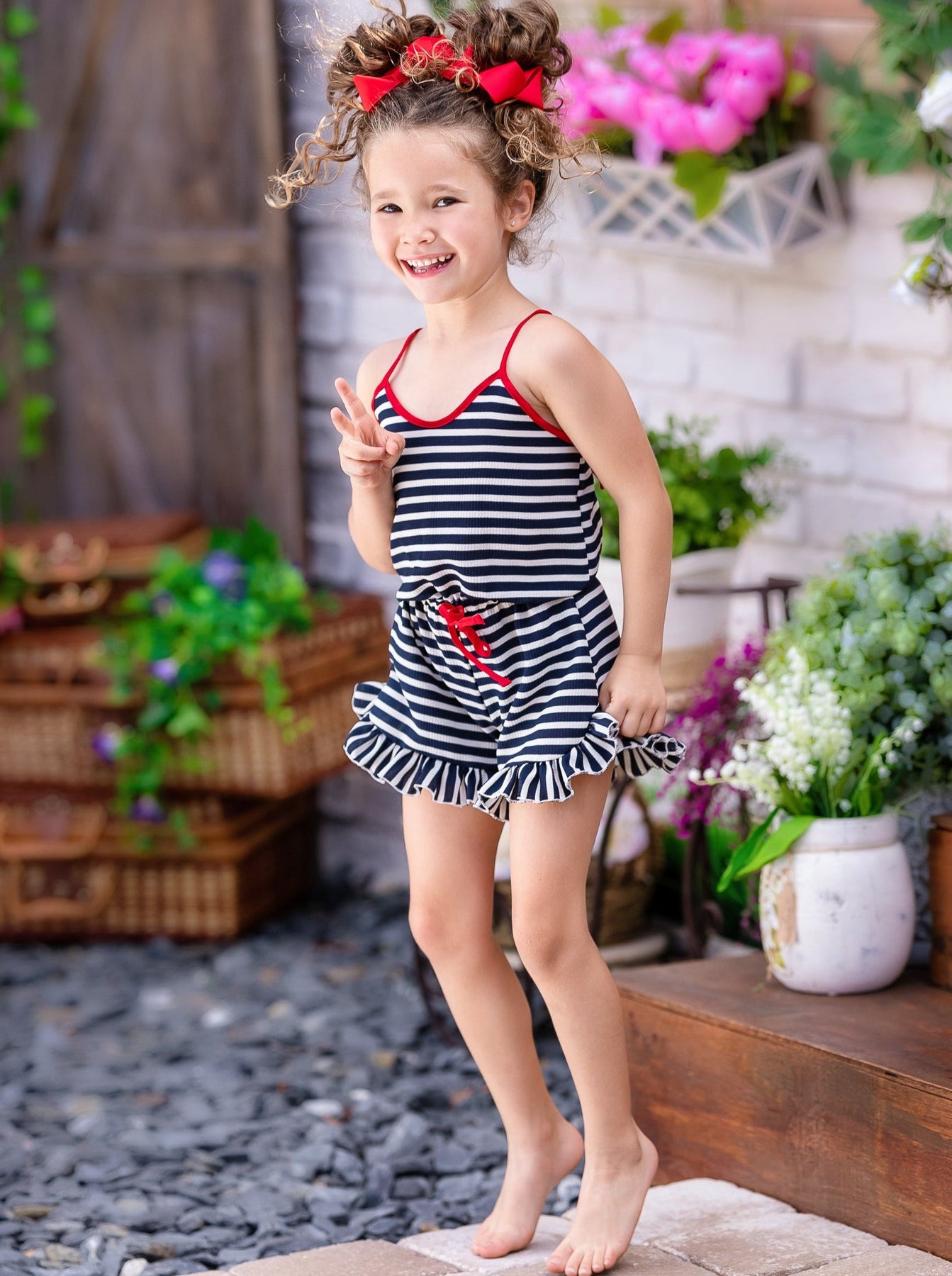 Sleeveless striped ruffle hem romper with built-in red drawstring
