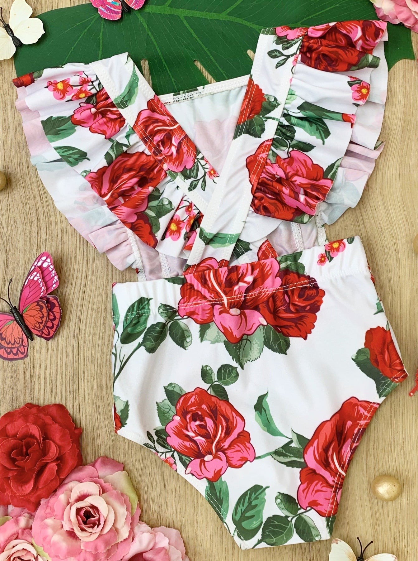 There's never a wrong time for roses--even in the water! Your sweet swimmer can take gorgeous blooms from poolside to beachside in our flutter sleeve, open-side one-piece. The high-quality material holds up after multiple wears. Your little girl will feel beachy keen!
