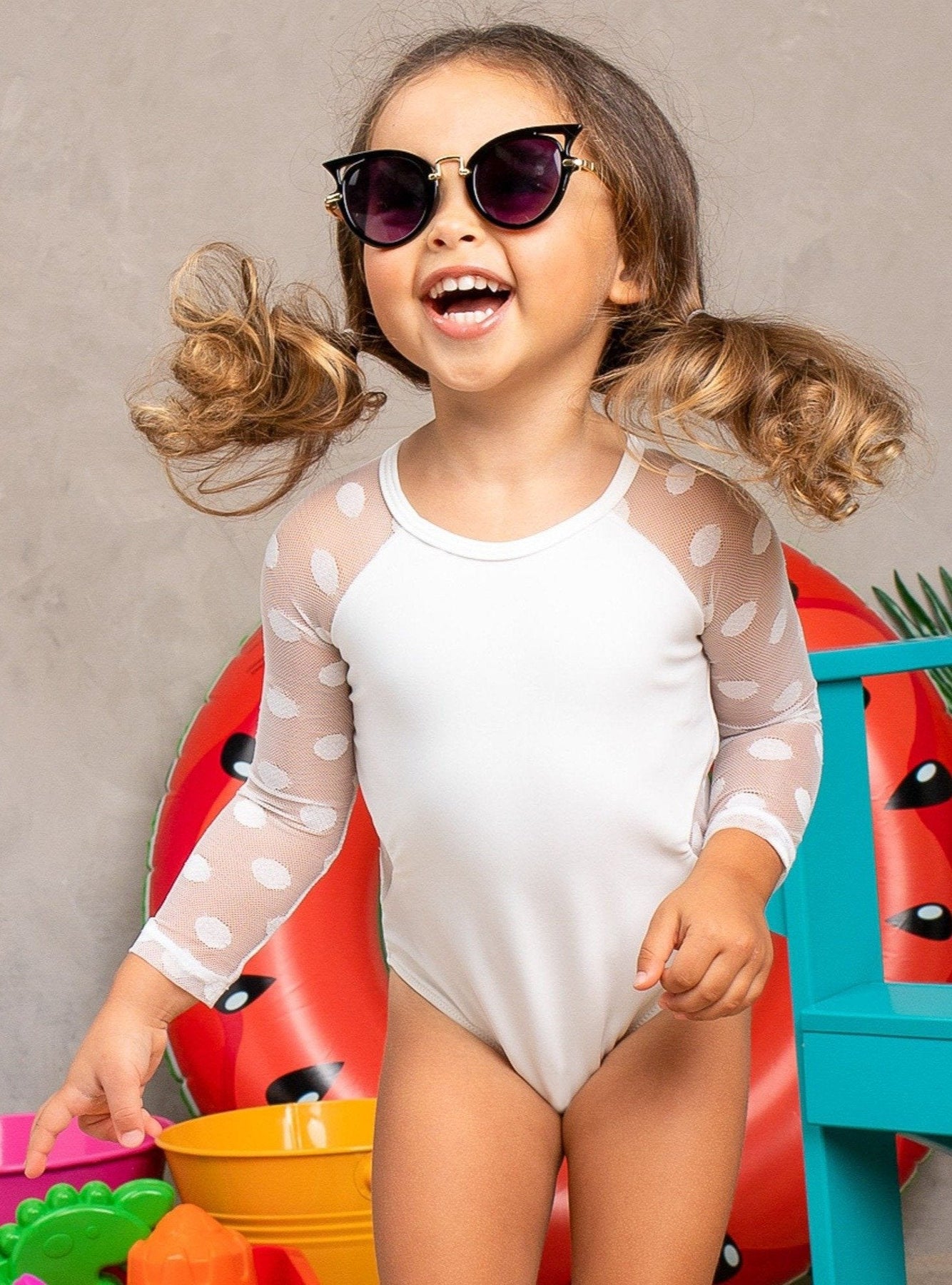 The one-piece swimsuit has long, tulle polka dot rashguard sleeves