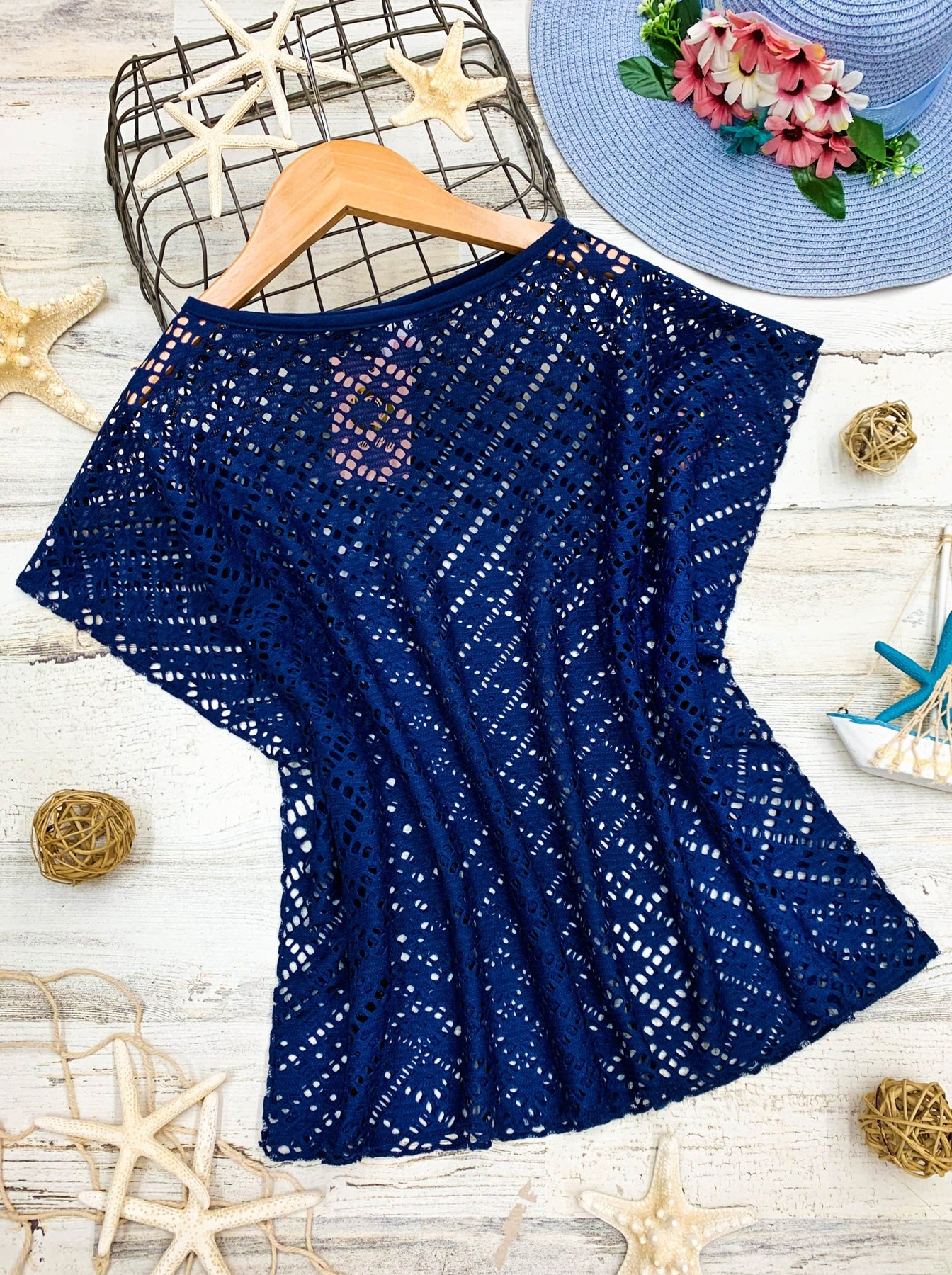 Crochet kaftan cover-up features sheer fabric and ruffled edges