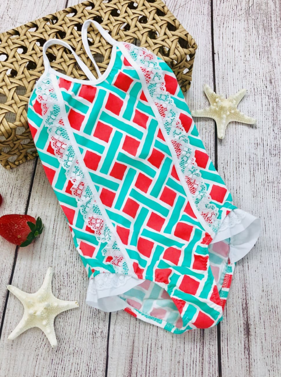 There will be no boring swimsuits on our watch! Give your little girl something unique to splash in with this geometric, lacey one-piece bathing suit! Colorful, chic, and cute as can be, she's sure to make a splash with all her friends!