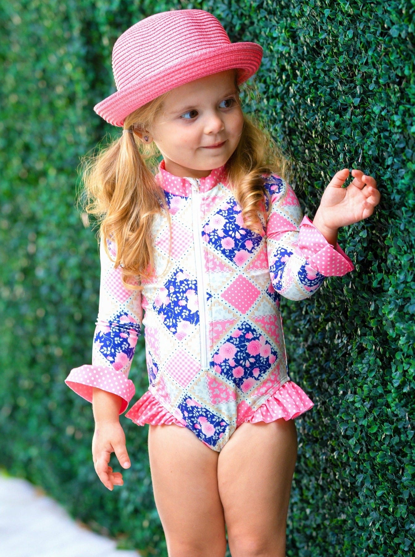 Cute Toddler Swimwear | Girls Pink Floral Patchwork One Piece Swimsuit