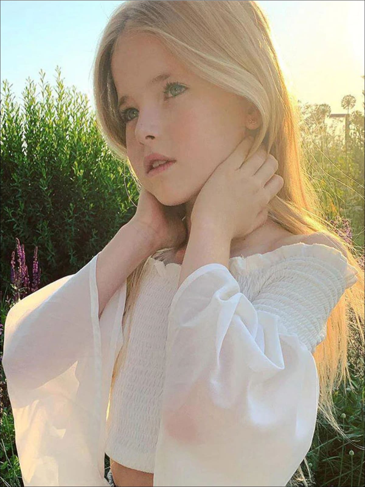 Little Girls Resort Wear | Ruched Belle Sleeve Top & Denim Skirt Set