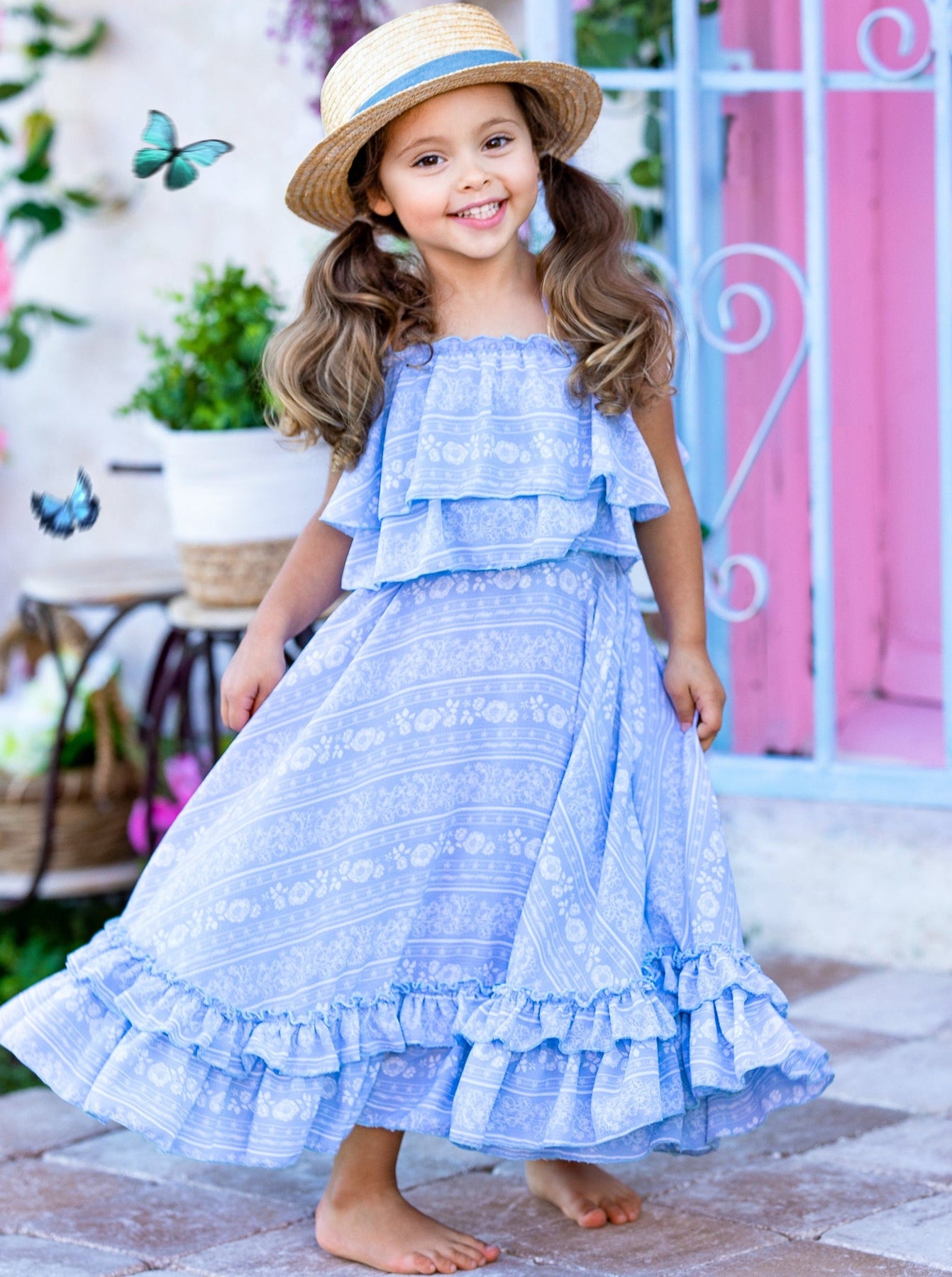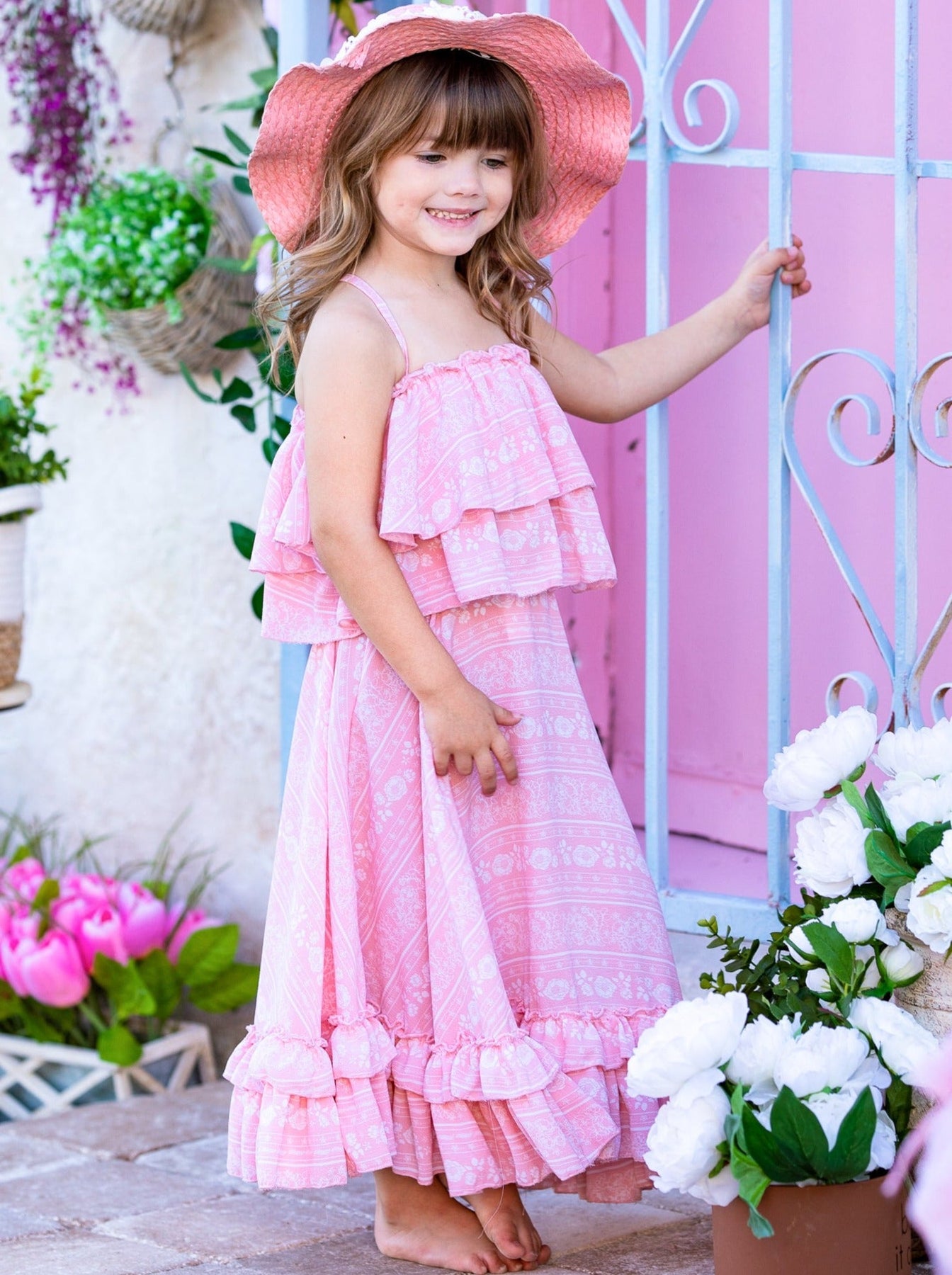 Put a spring in her step, a smile on her face, and this fashionable ruffle skirt set in her closet! Covered in a chic floral design, the double-ruffle cami top and maxi skirt are versatile enough for mommy day trips or parties with her friends. Guaranteed to be her next favorite summer 'fit!