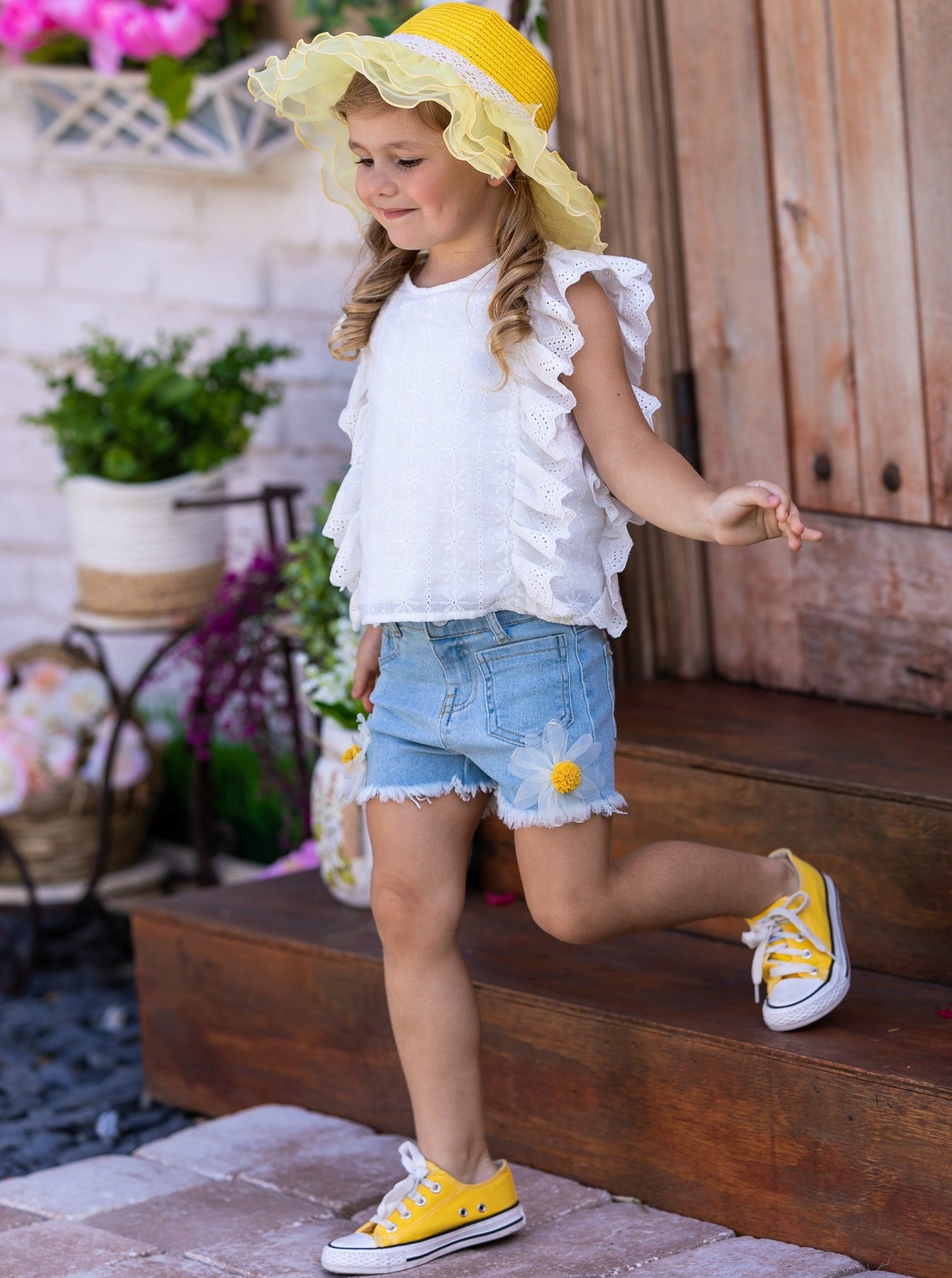 This eyelet ruffle top and denim short set screams Spring is adorable daisy applique and a lightweight design to keep her looking her best all season long. Blue skies, sunshine, a pretty girl's outfit, and everything's fine!