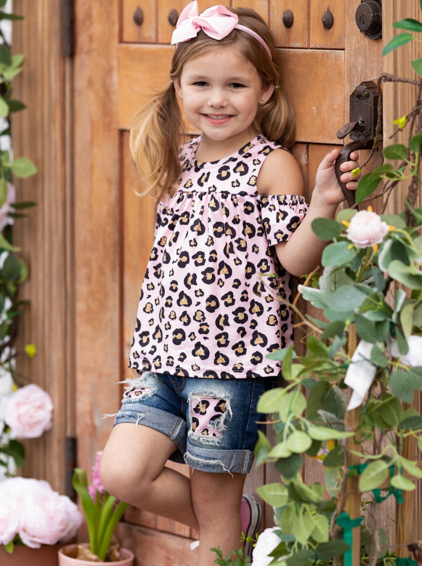 Cold-shoulder short sleeve pink leopard print top and matching patched denim shorts with cuffed hem