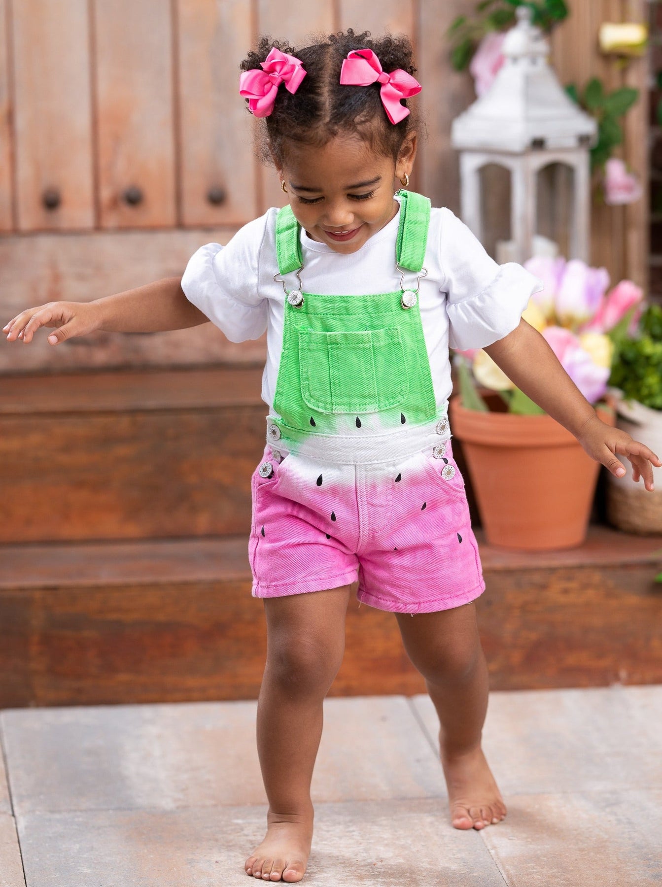 Looking for some adorable watermelon-themed fashion to dress your baby girl in? Look no further than this ruffle sleeve top and overall shorts with watercolor gradience to resemble a watermelon slice complete with black seeds.