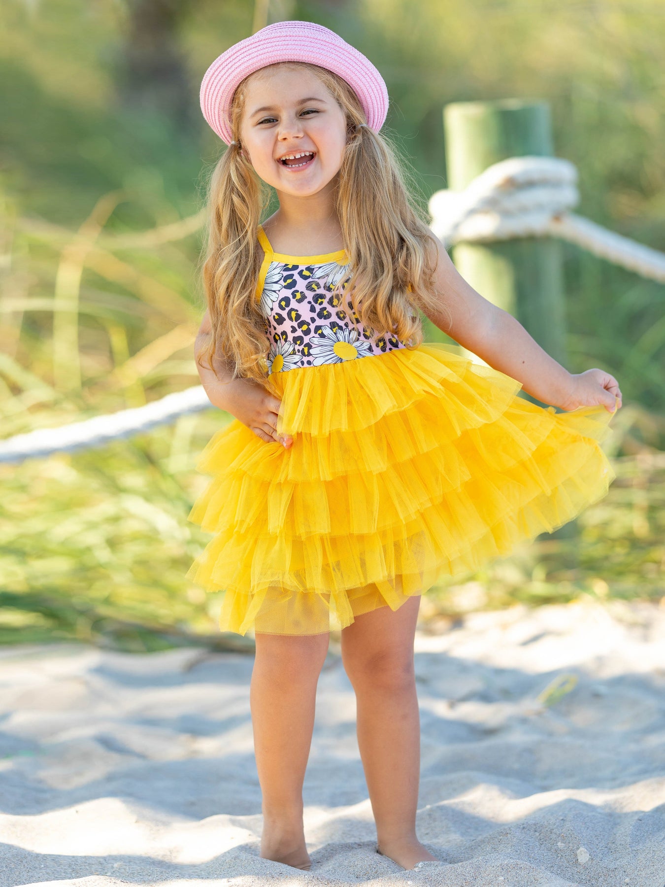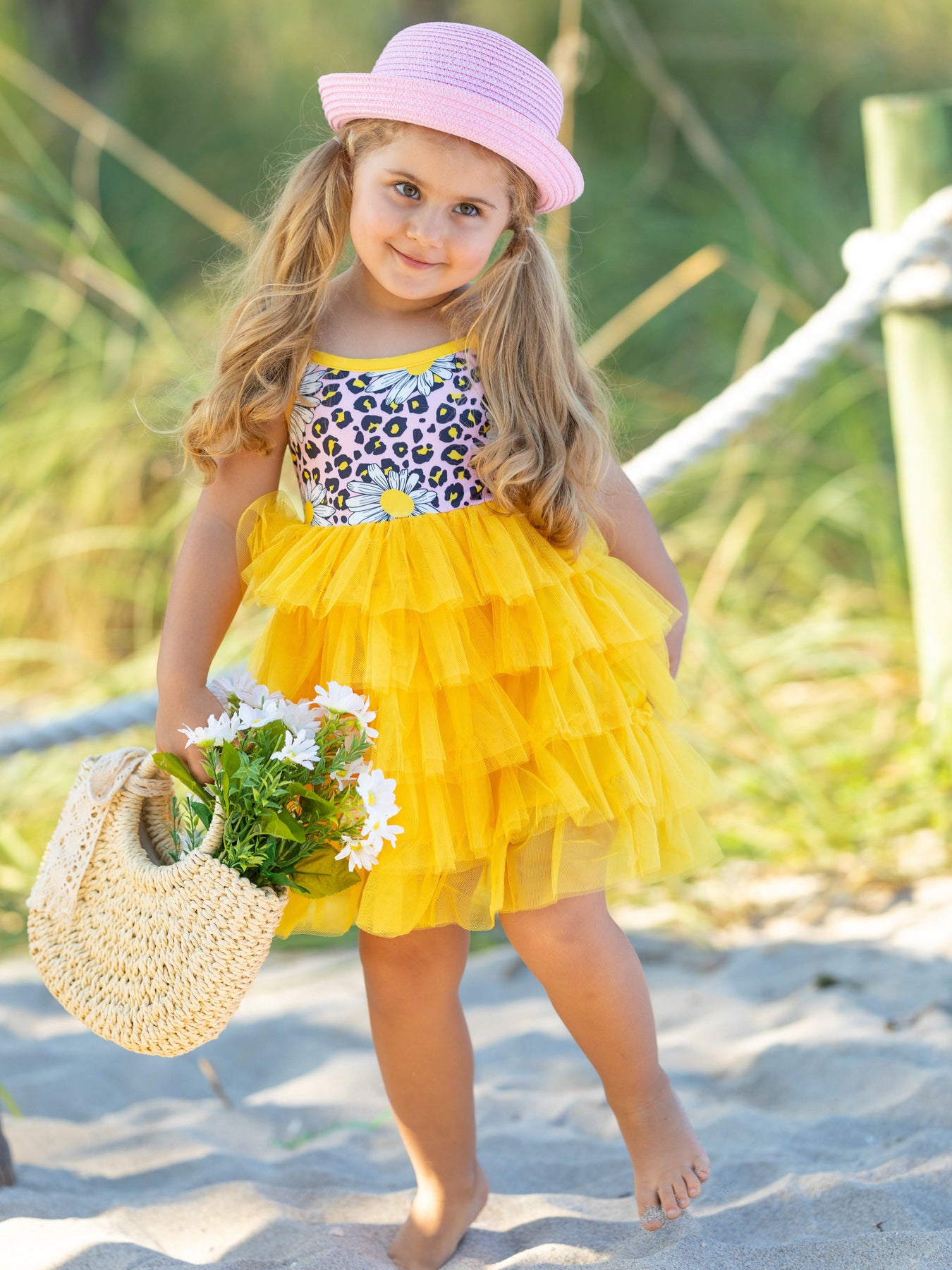 Sleeveless dress with a leopard print daisy bodice and yellow tiered ruffled skirt