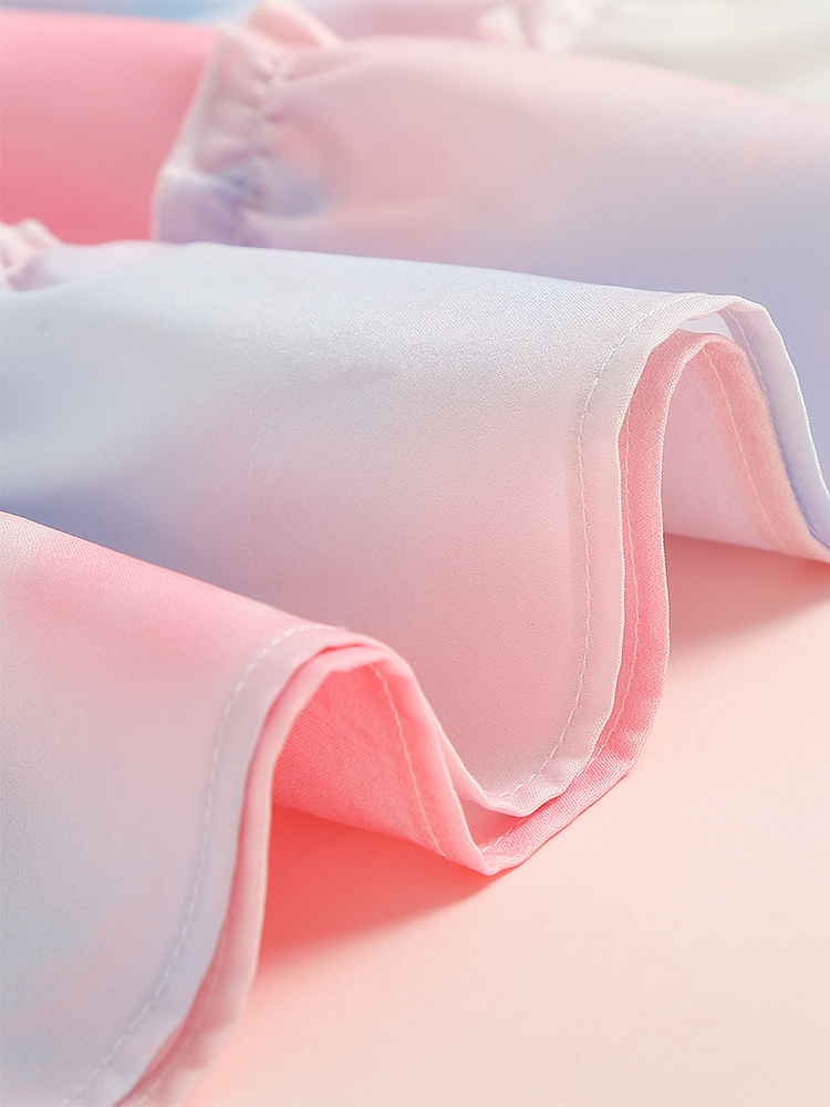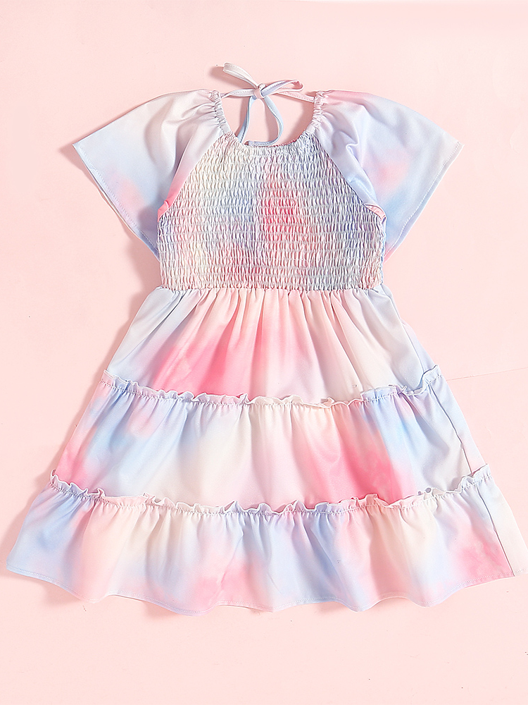 • Flutter-sleeve pastel tye-dye ruffle dress with fitted smock bodice, adjustable tie in back, and elastic waistband