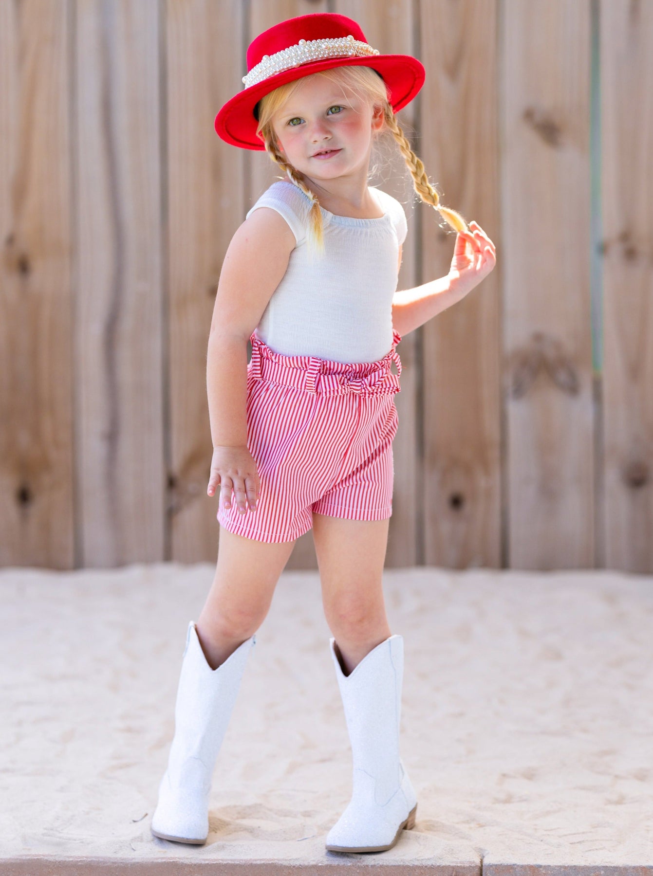 • Trendy set alert! Your favorite little fashionista will look even more fabulous in our paperbag shorts set. The belted striped shorts are complemented by a white smocked top. The perfect pairing for her spring and summer days!