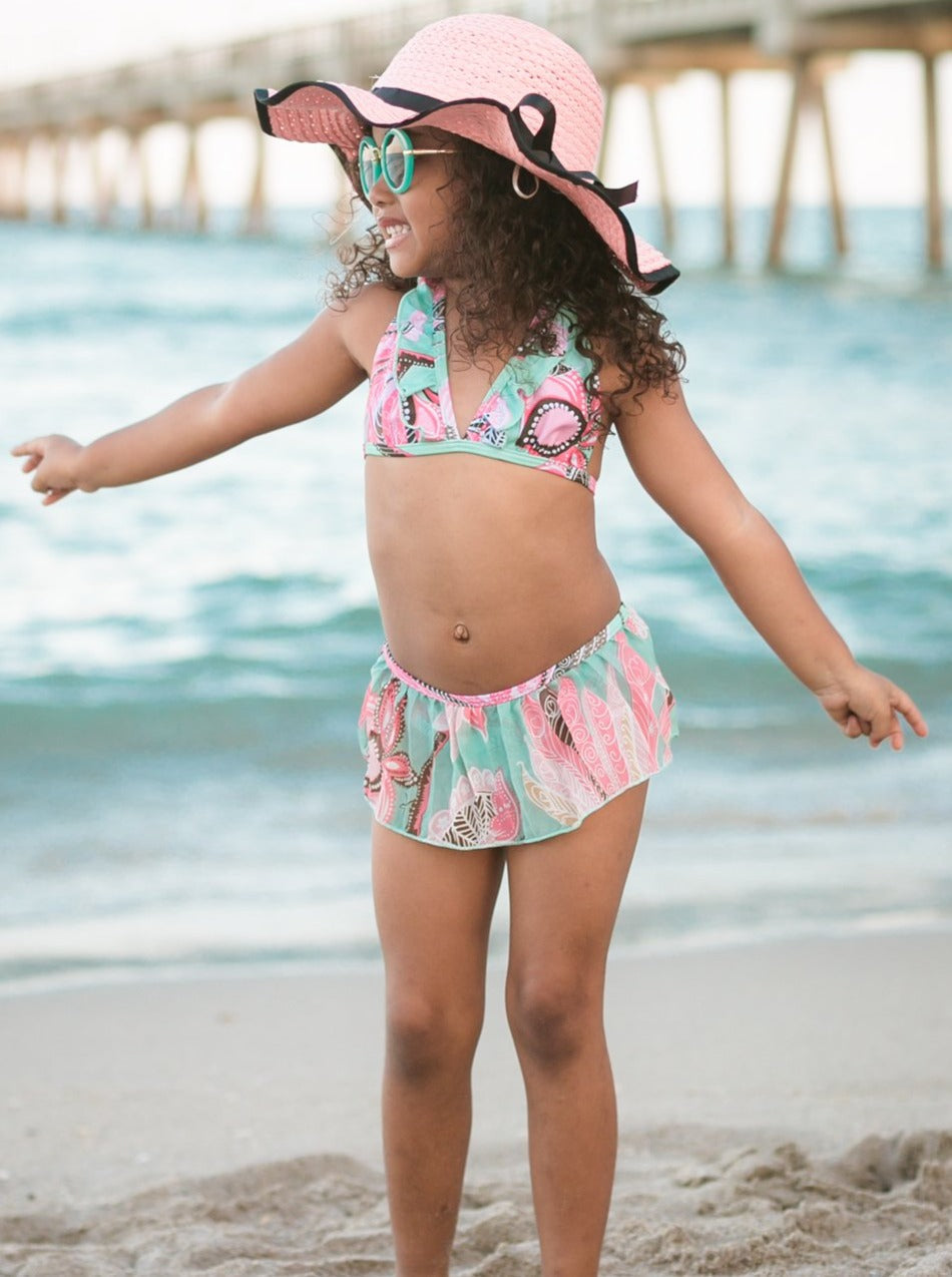Girls Aqua Floral Skirted Bikini With Matching Cover Up - Girls Two Piece Swimsuit