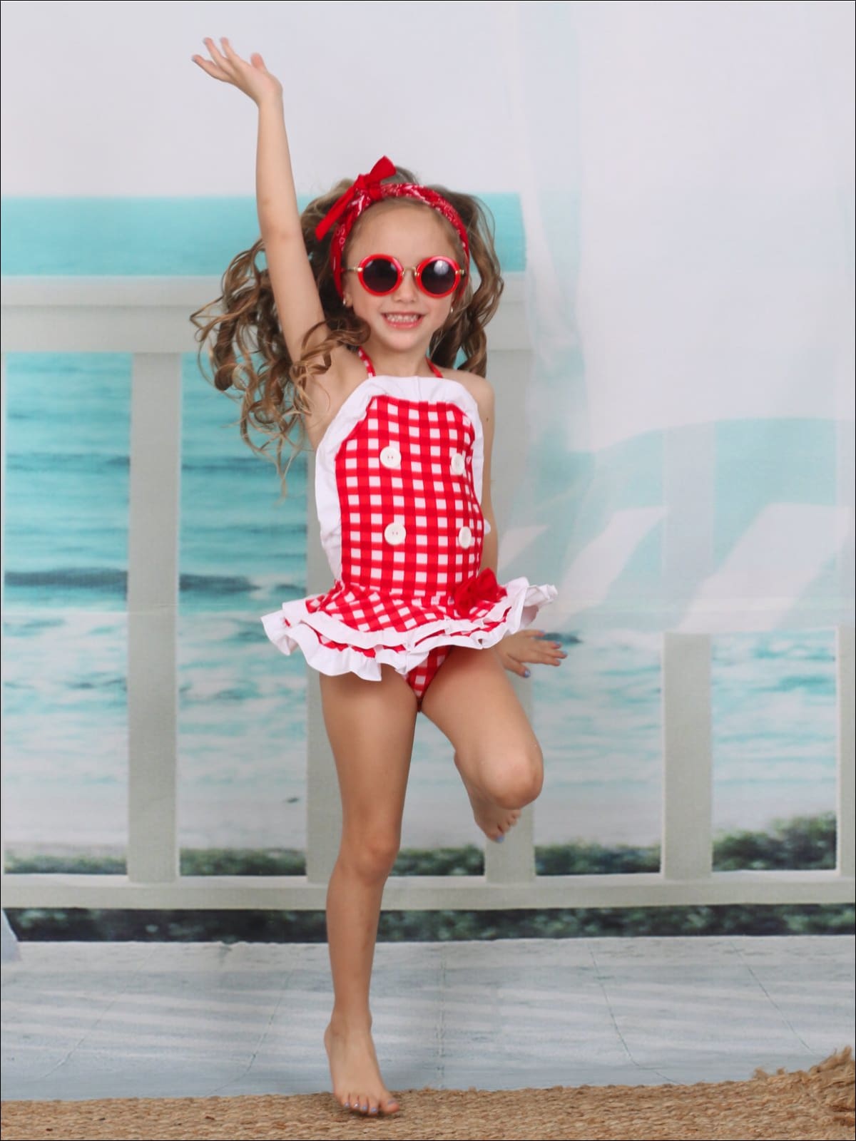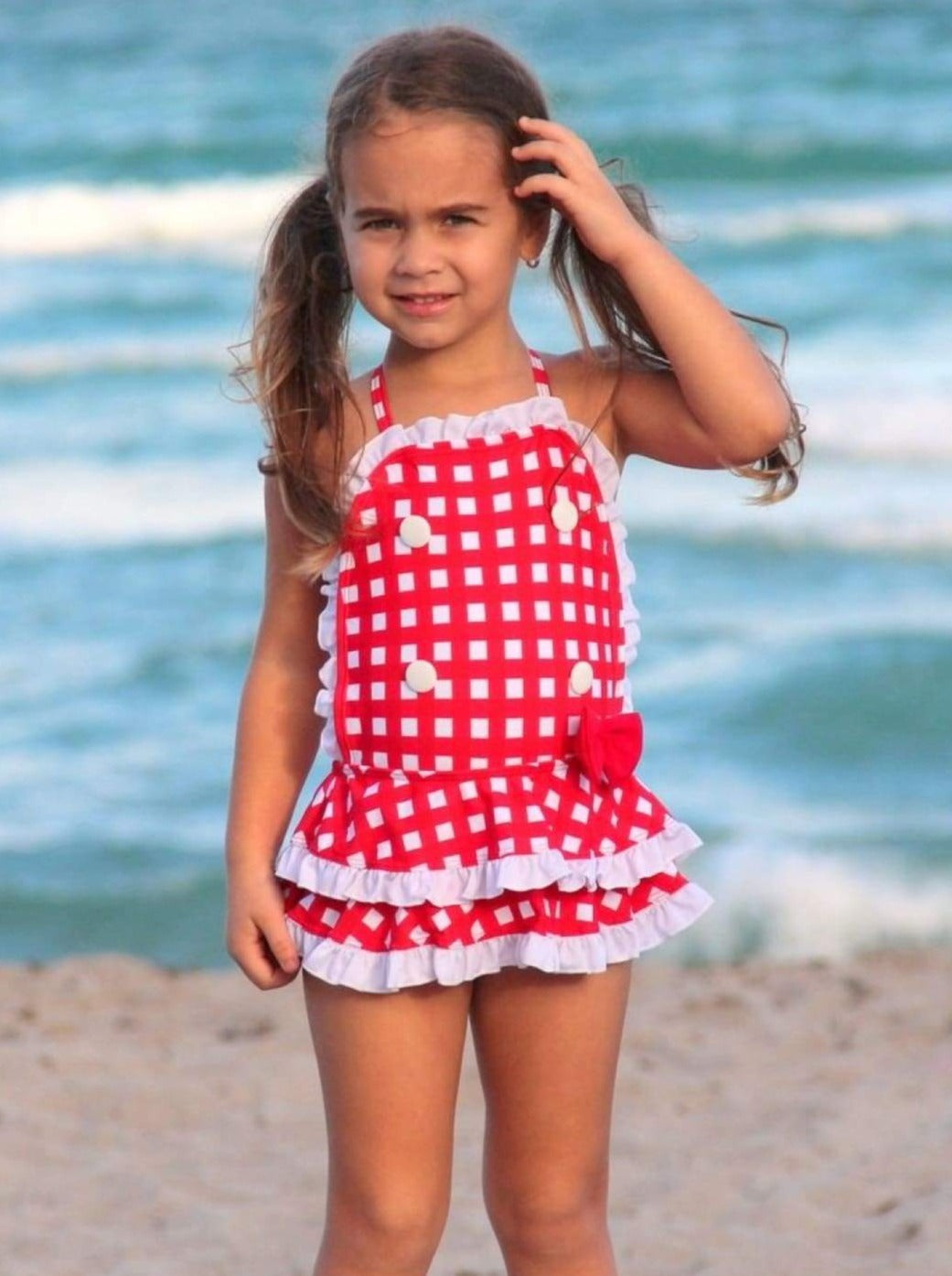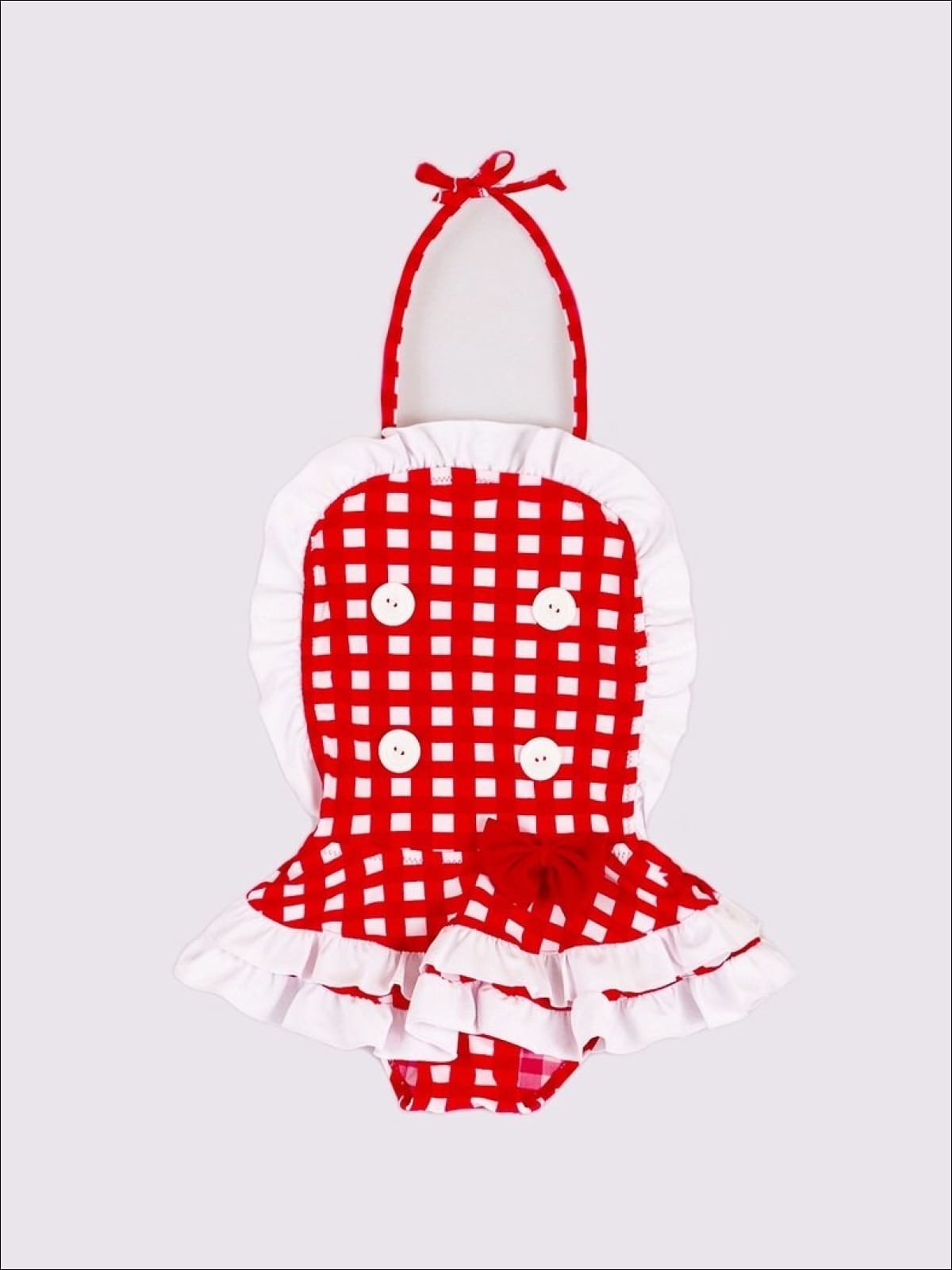 Your little beach babe will look cute as a button in this checkered, ruffled one piece adorned with four buttons and a bow! We think she'll agree once she's riding the waves in style!