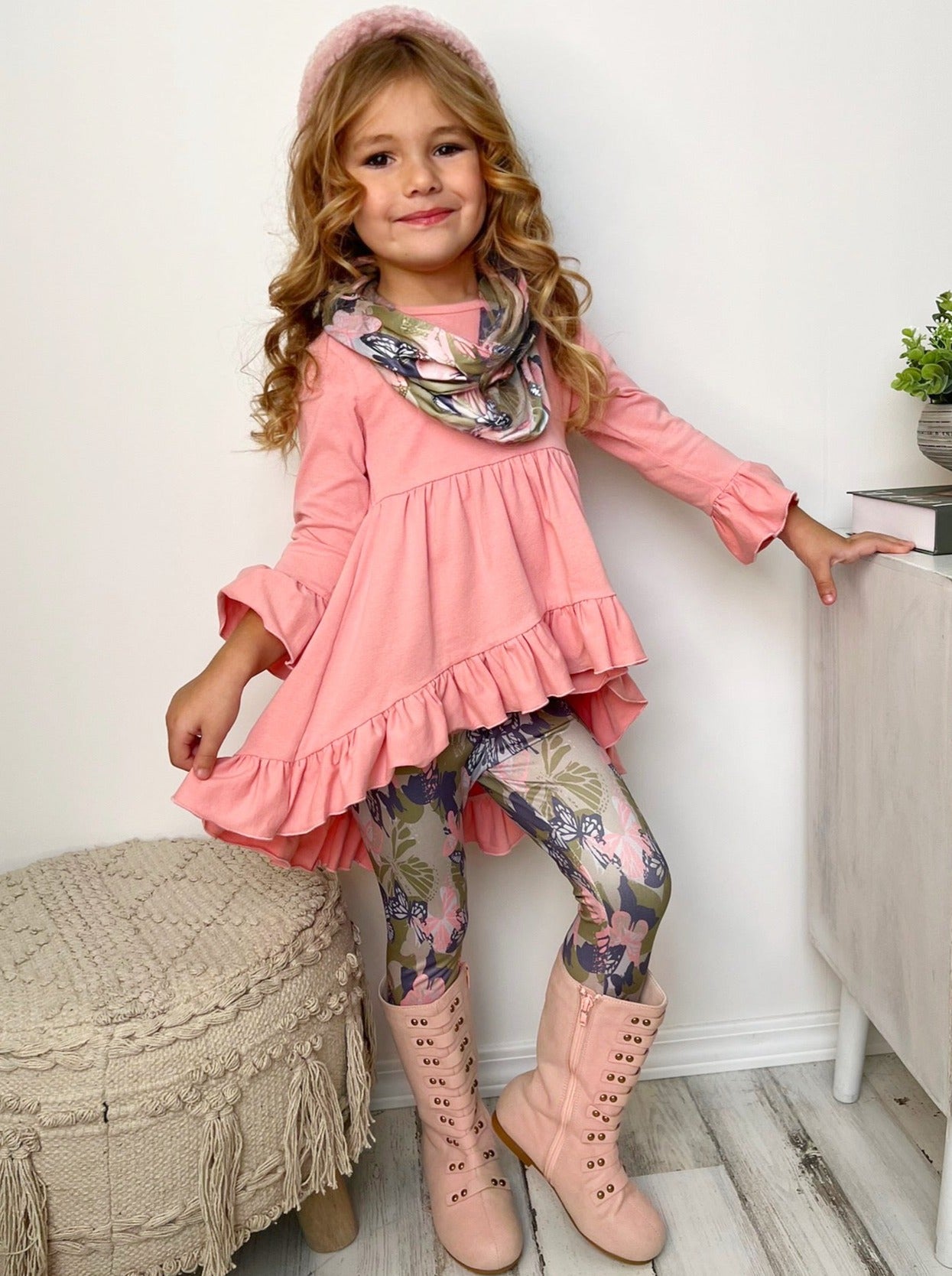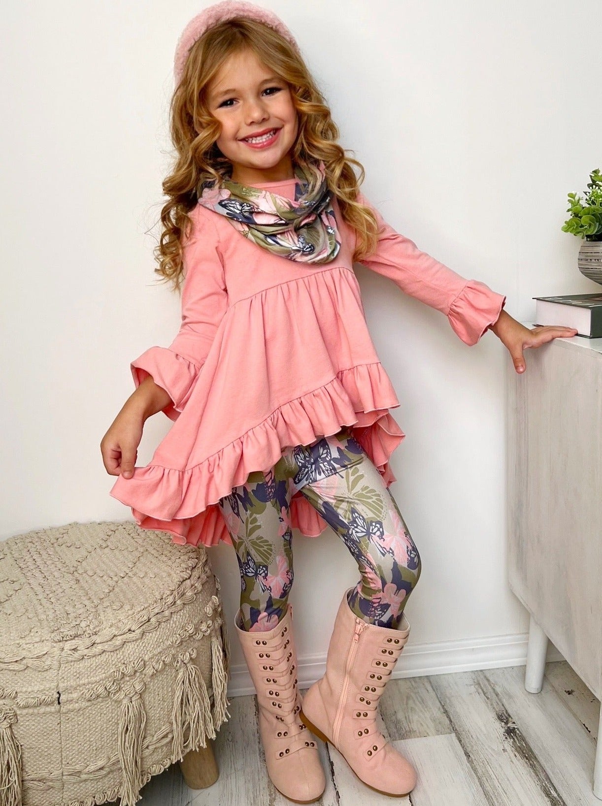 Keep it chic and unique with our camo butterfly three-piece legging set! The flowy ruffle tunic, matching leggings and scarf, and festive design makes getting dressed easy and looking cute effortless.