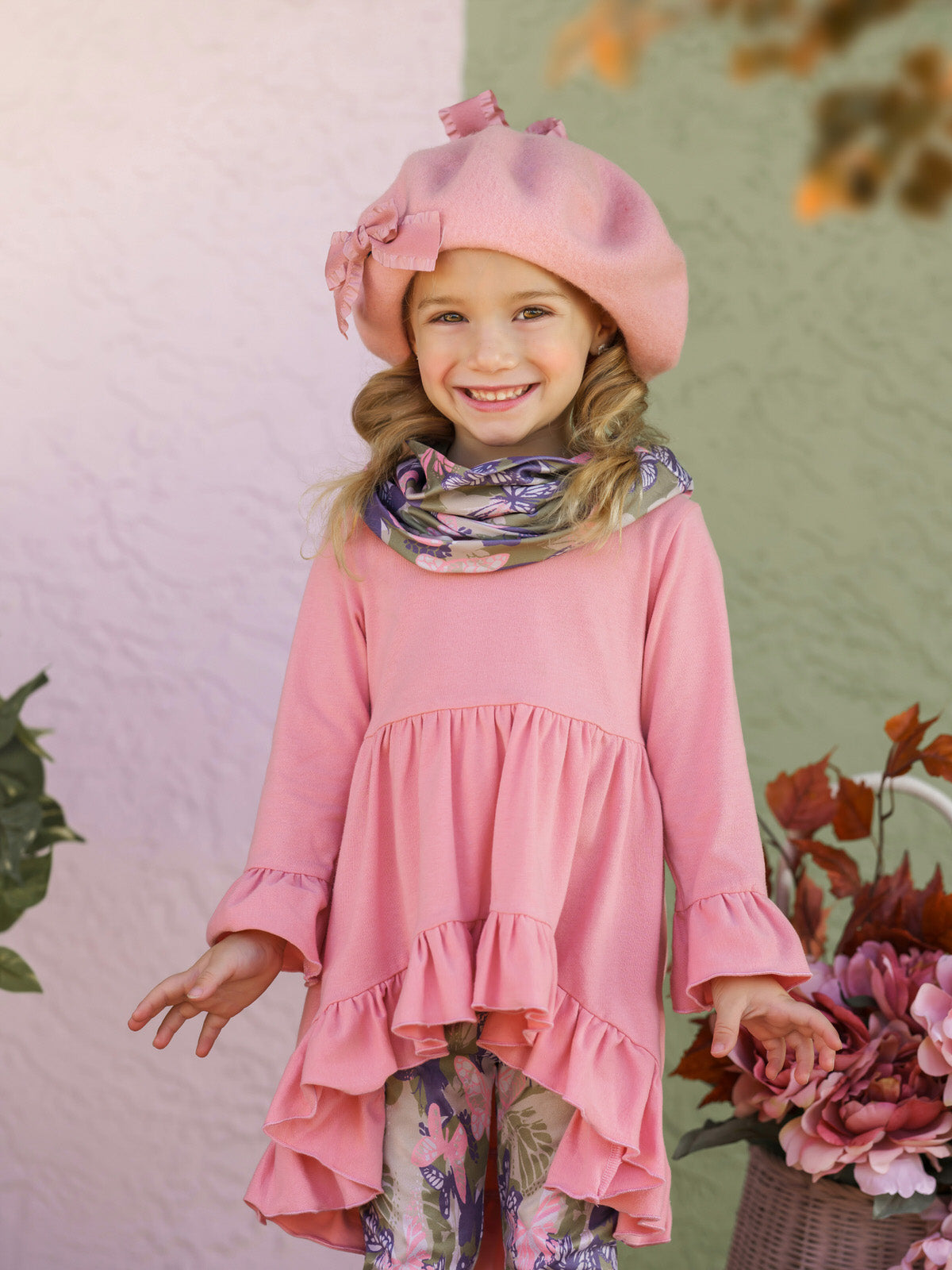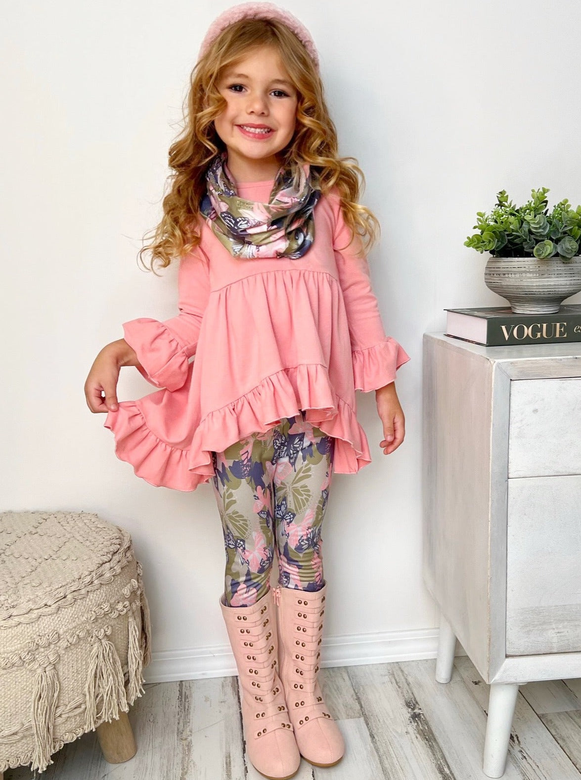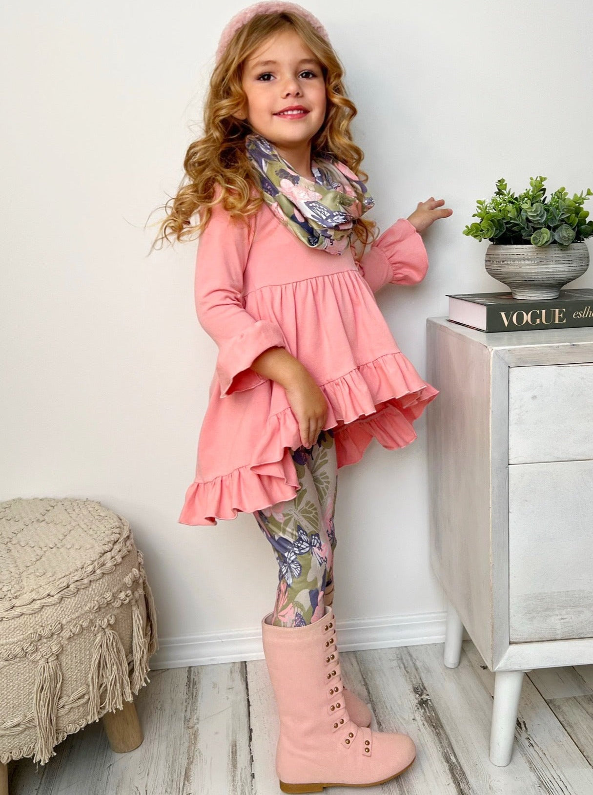 Long-sleeve hi-lo tunic with ruffle cuffs and trim, camo/butterfly print graphic pattern leggings, and matching infinity wrap scarf.