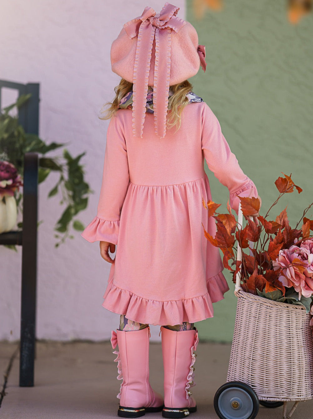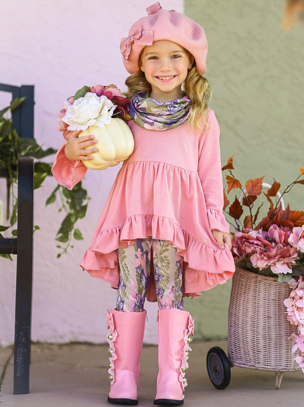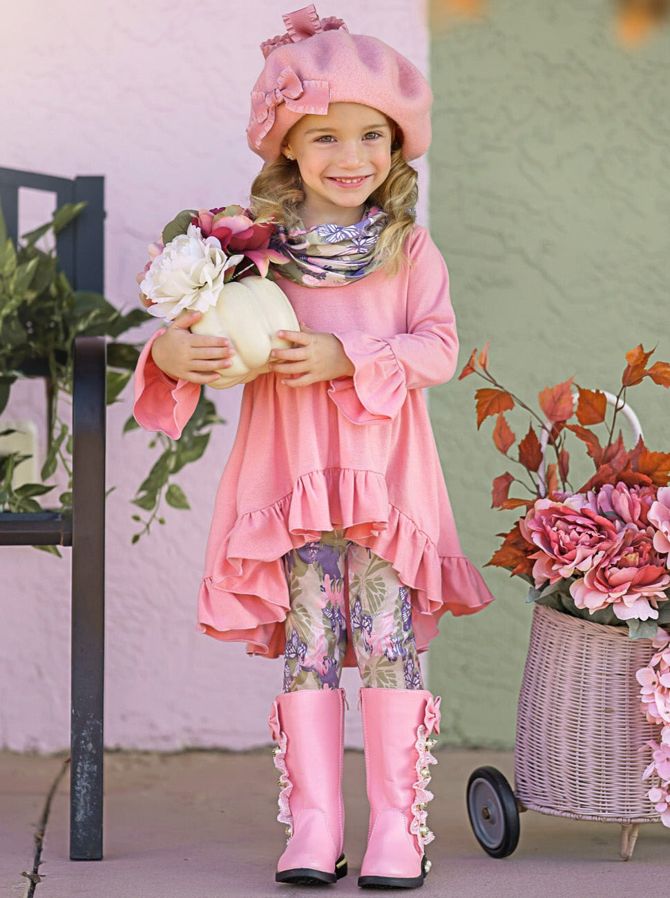 Long-sleeve hi-lo tunic with ruffle cuffs and trim, camo/butterfly print graphic pattern leggings, and matching infinity wrap scarf.