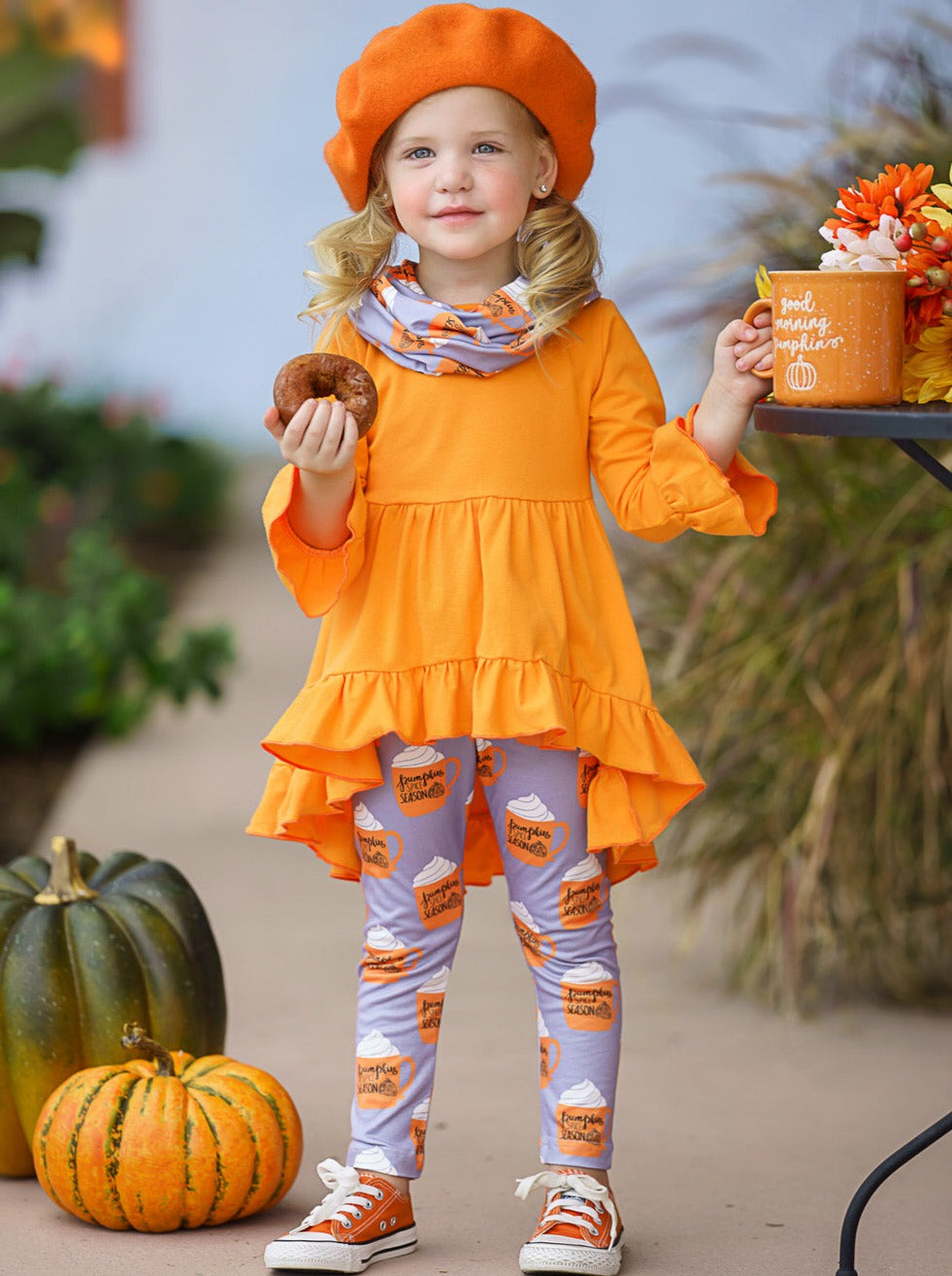 • Long-sleeve hi-lo tunic with ruffle cuffs and trim, pumpkin spice graphic pattern leggings, and matching infinity wrap scarf.