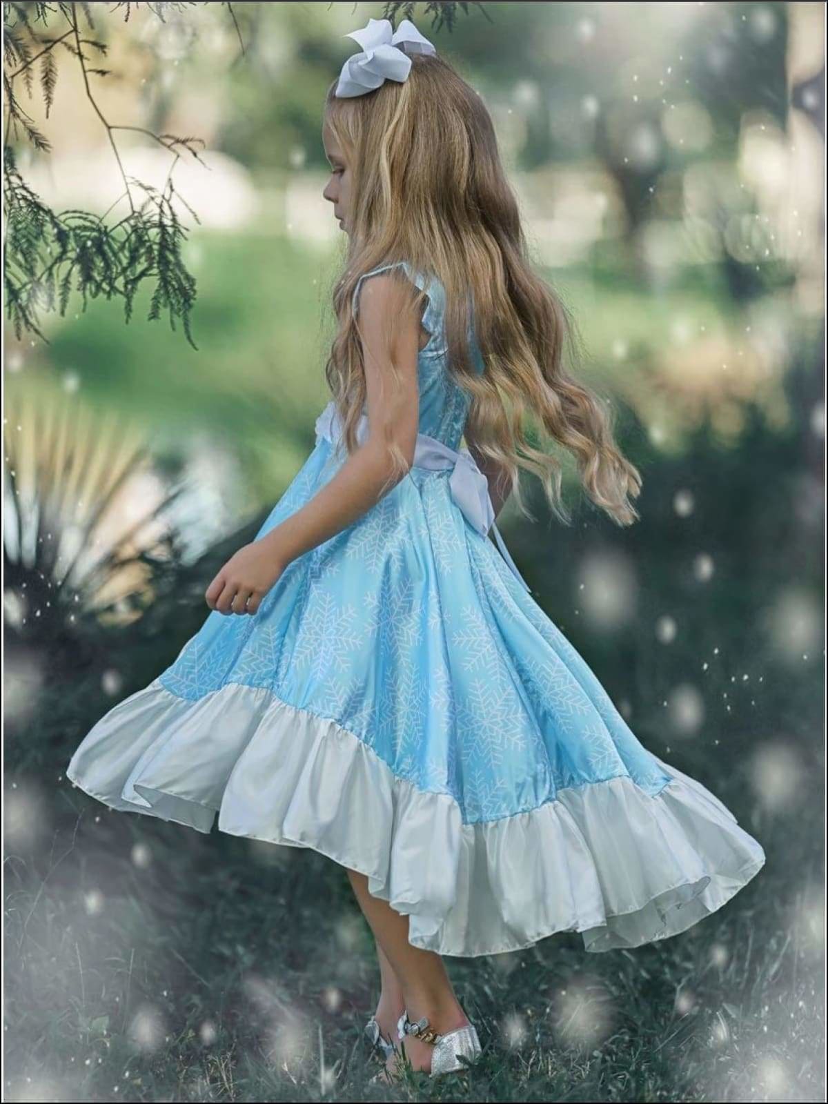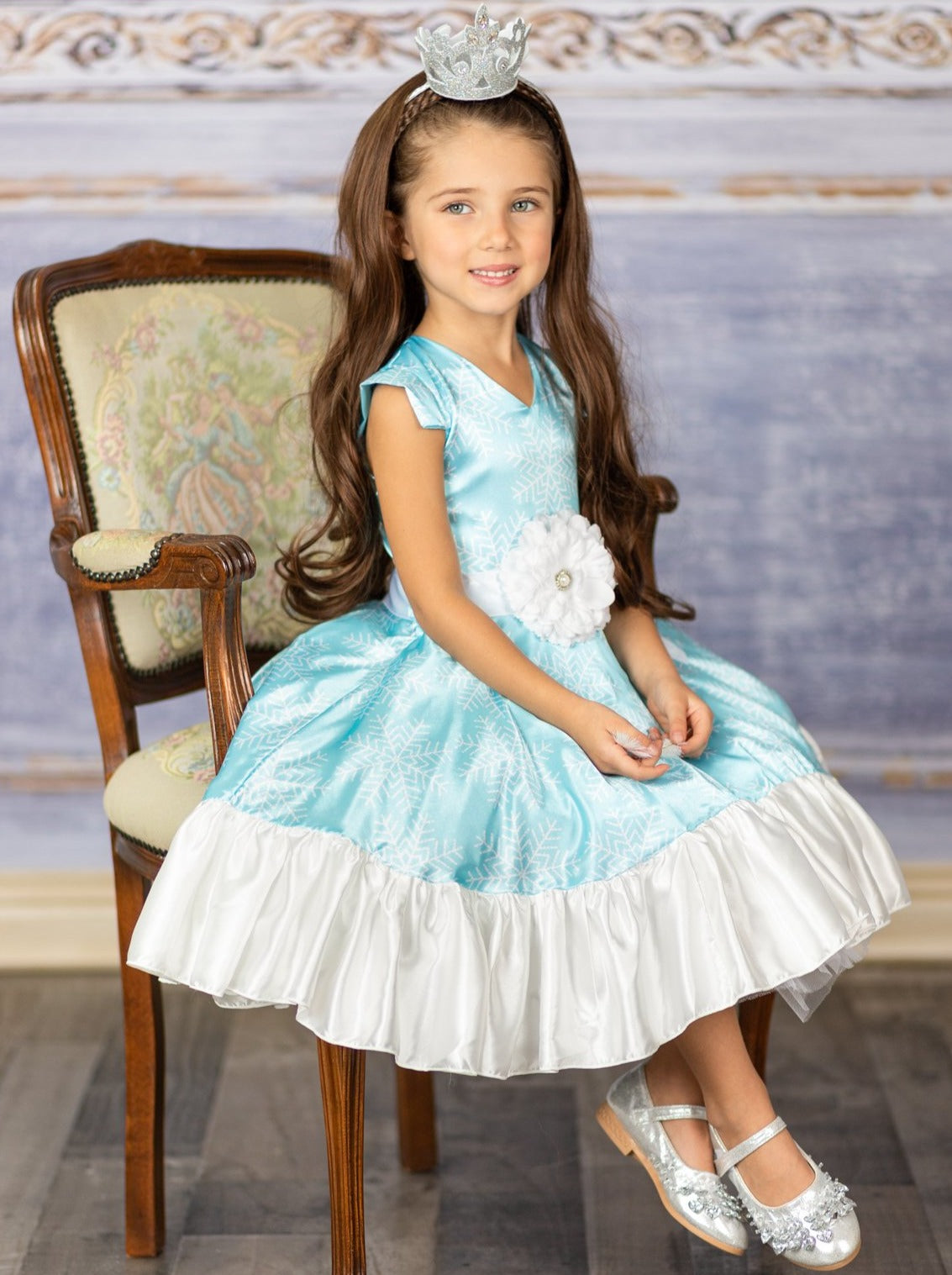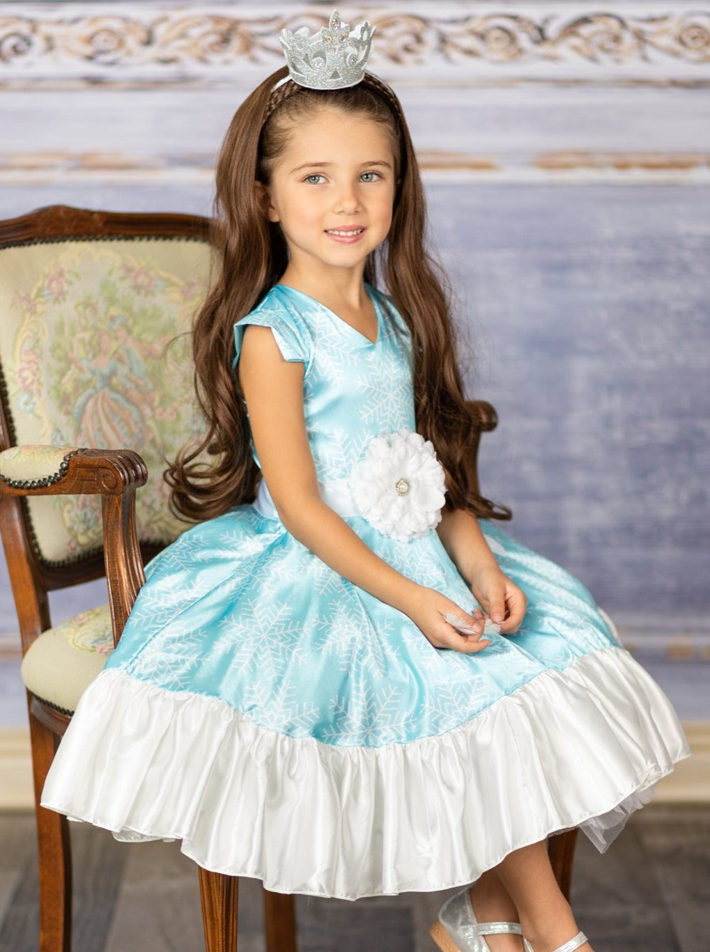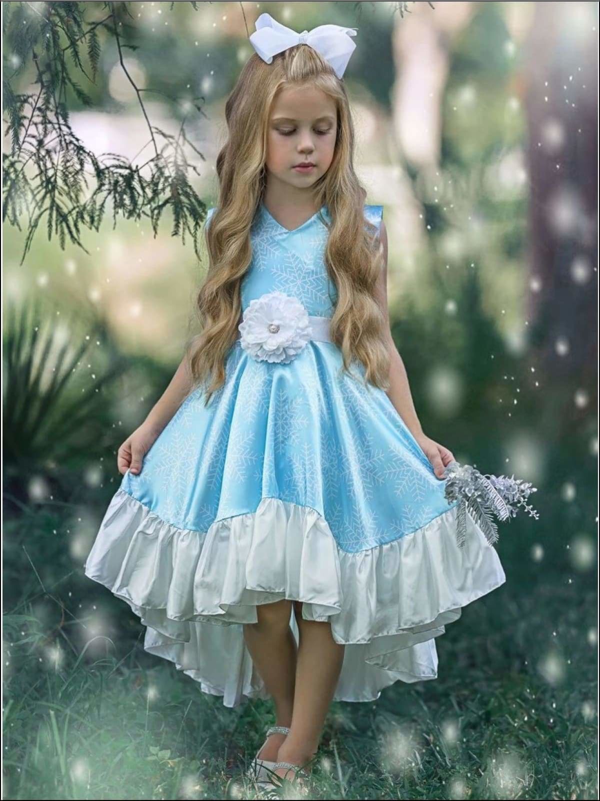 - Dress adorned with satin flower sash