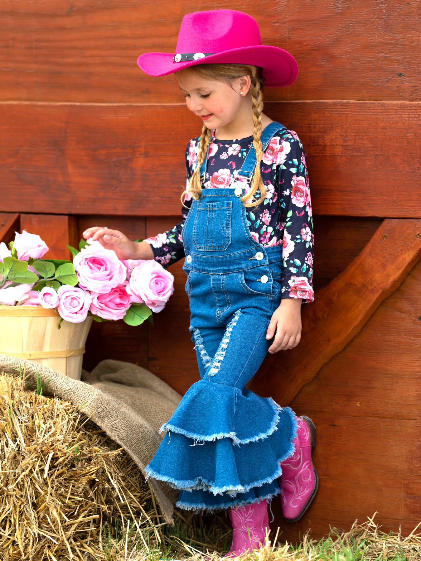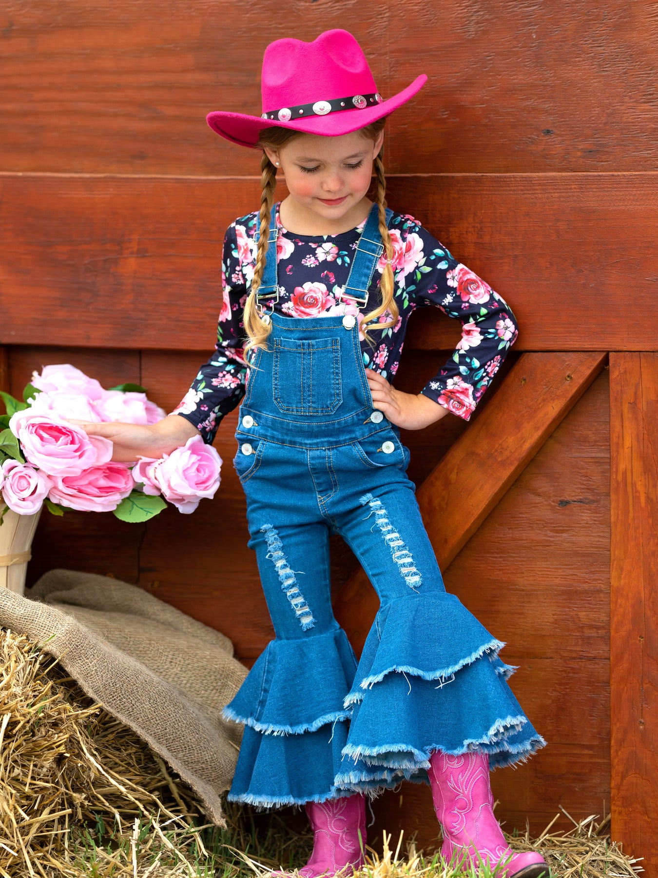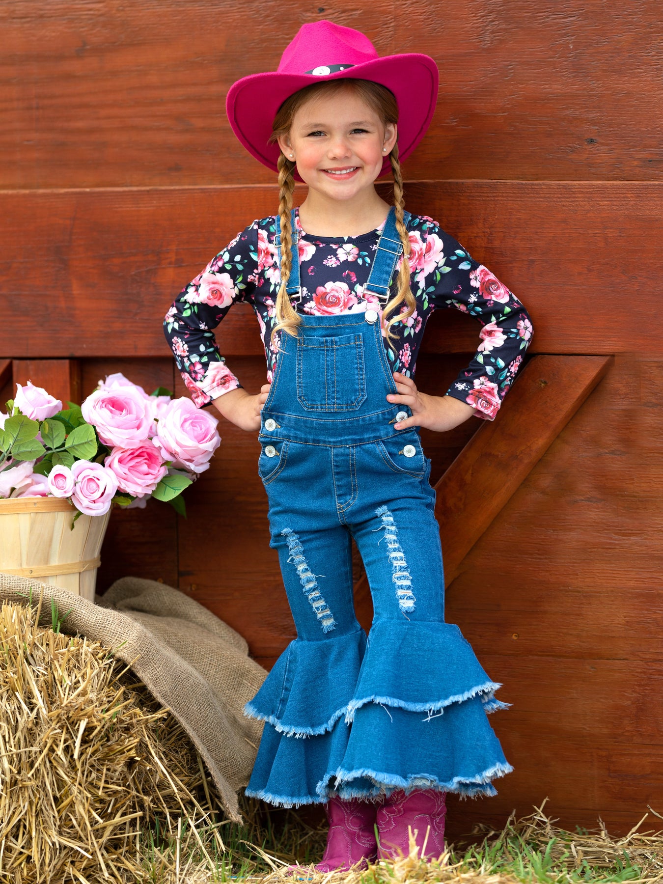 • Your little girl will love our flared denim overall set. Stylish, sassy, and so cute with pretty florals and distressed accents.