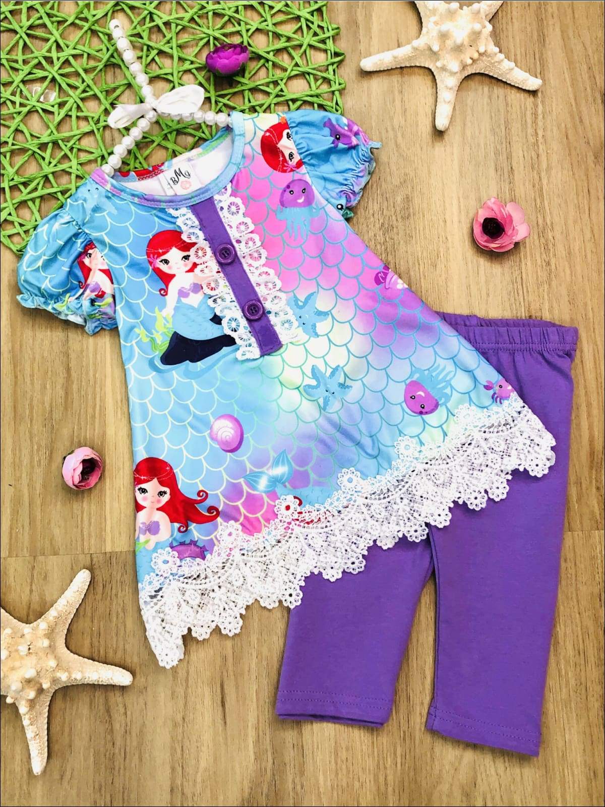 Girls Mermaid Print Lace Tunic & Capri Legging Set