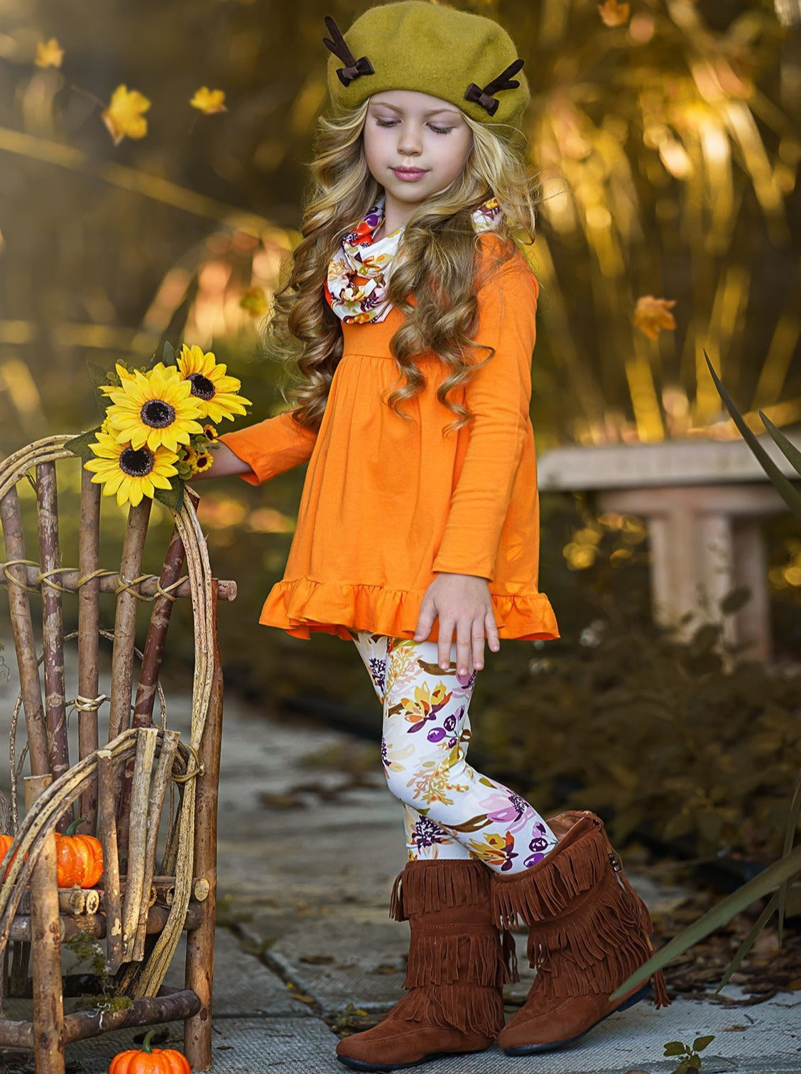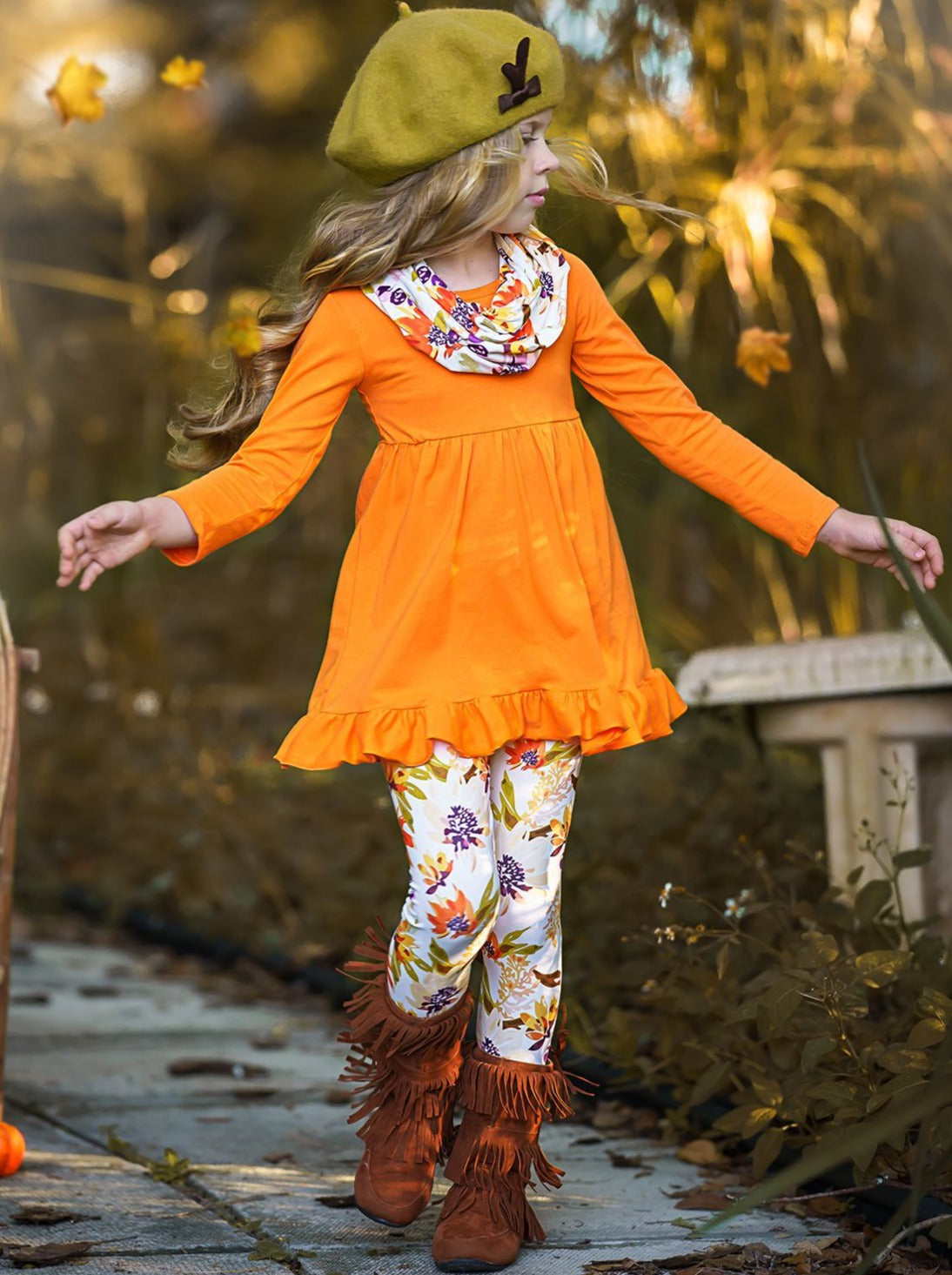 Long-sleeve tunic with ruffle hem, fall floral print leggings, and matching infinity wrap skirt