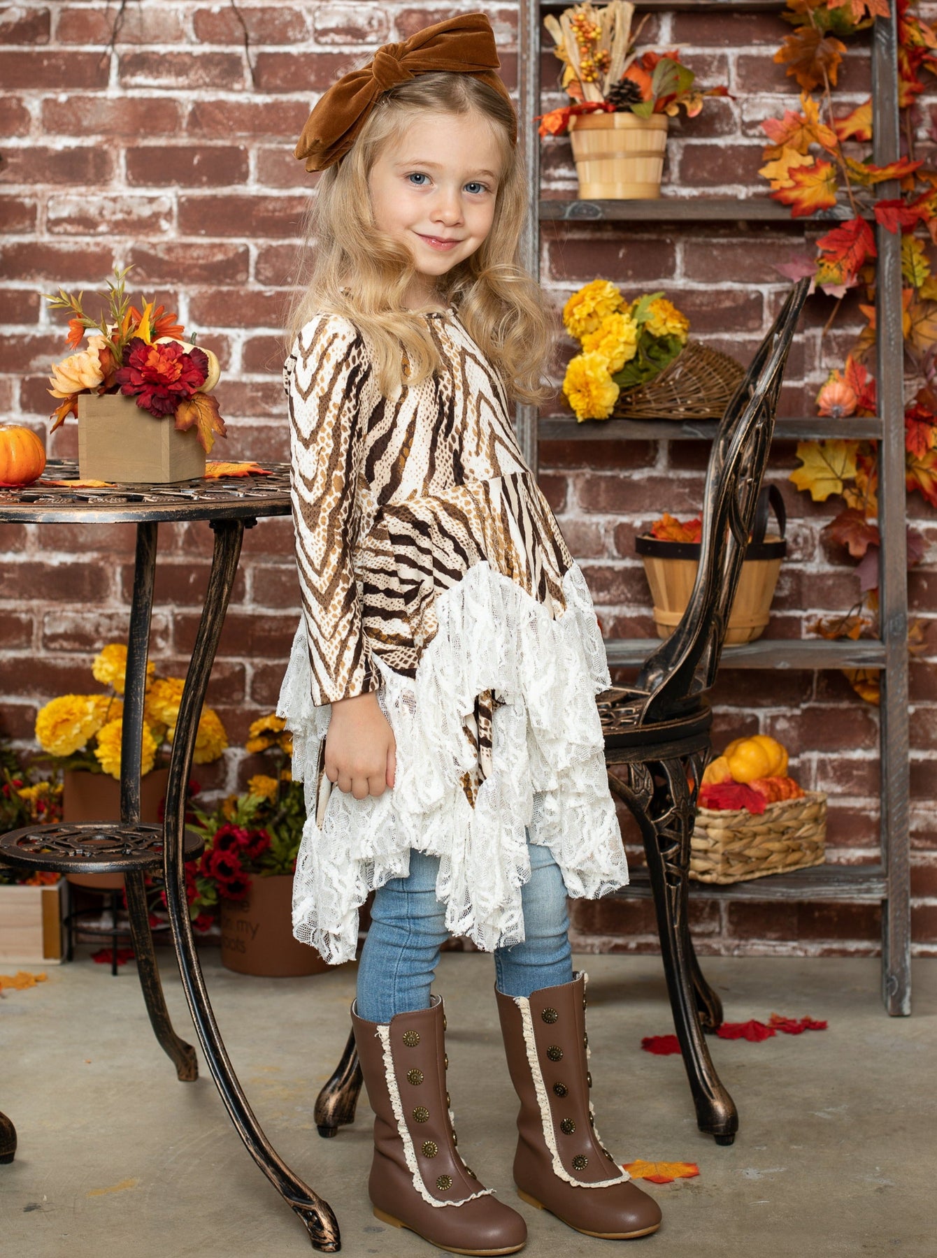 Delight budding fashion mavens with this darling set that features a trend-savvy handkerchief tunic. Lace details add a delicate and charming touch to your girl's look!