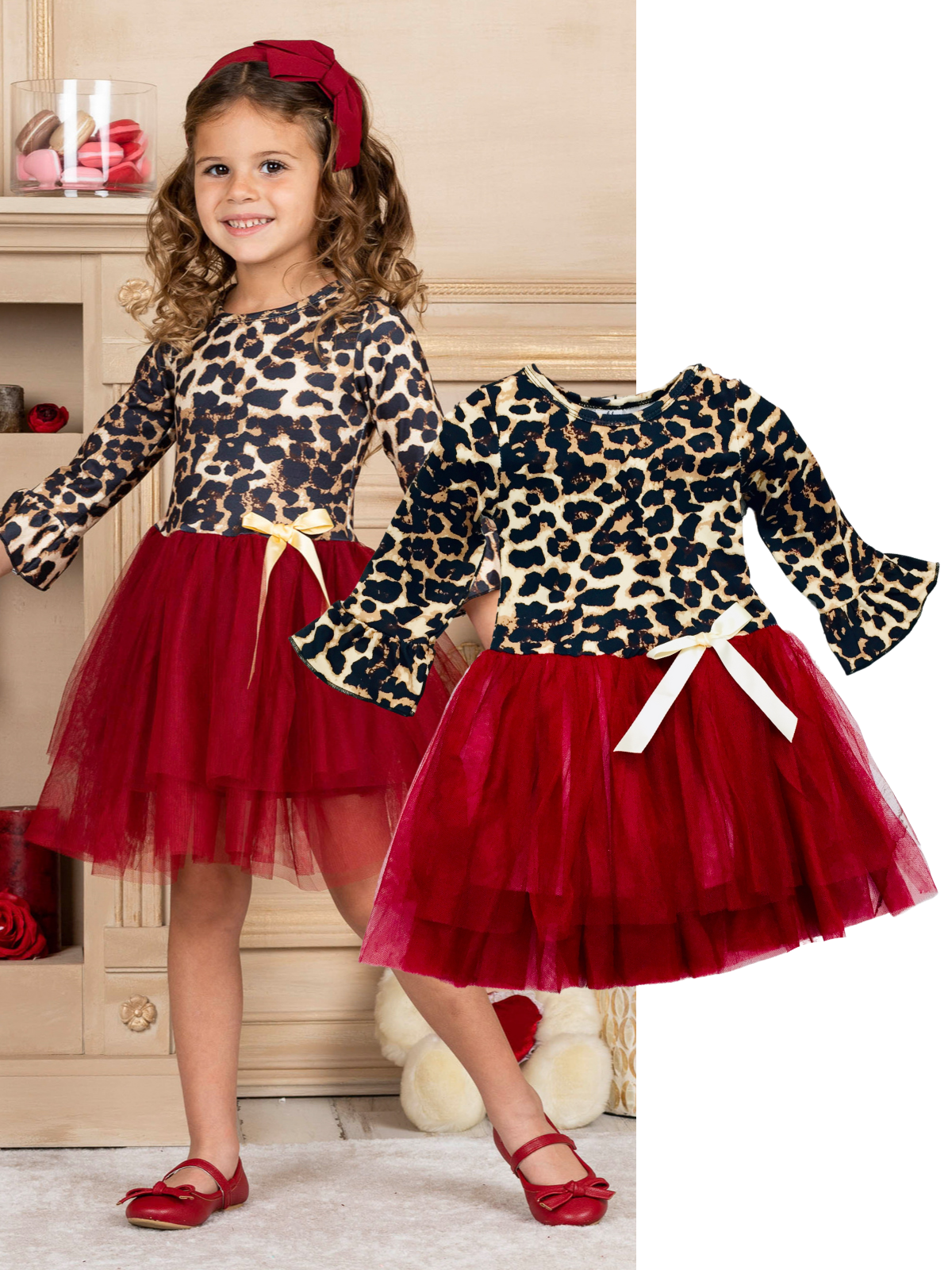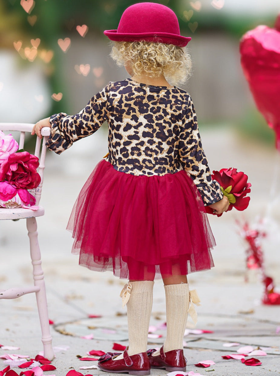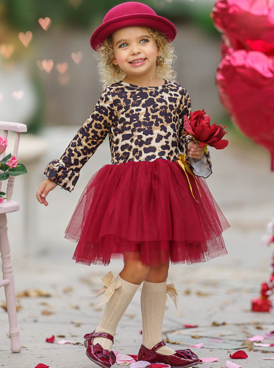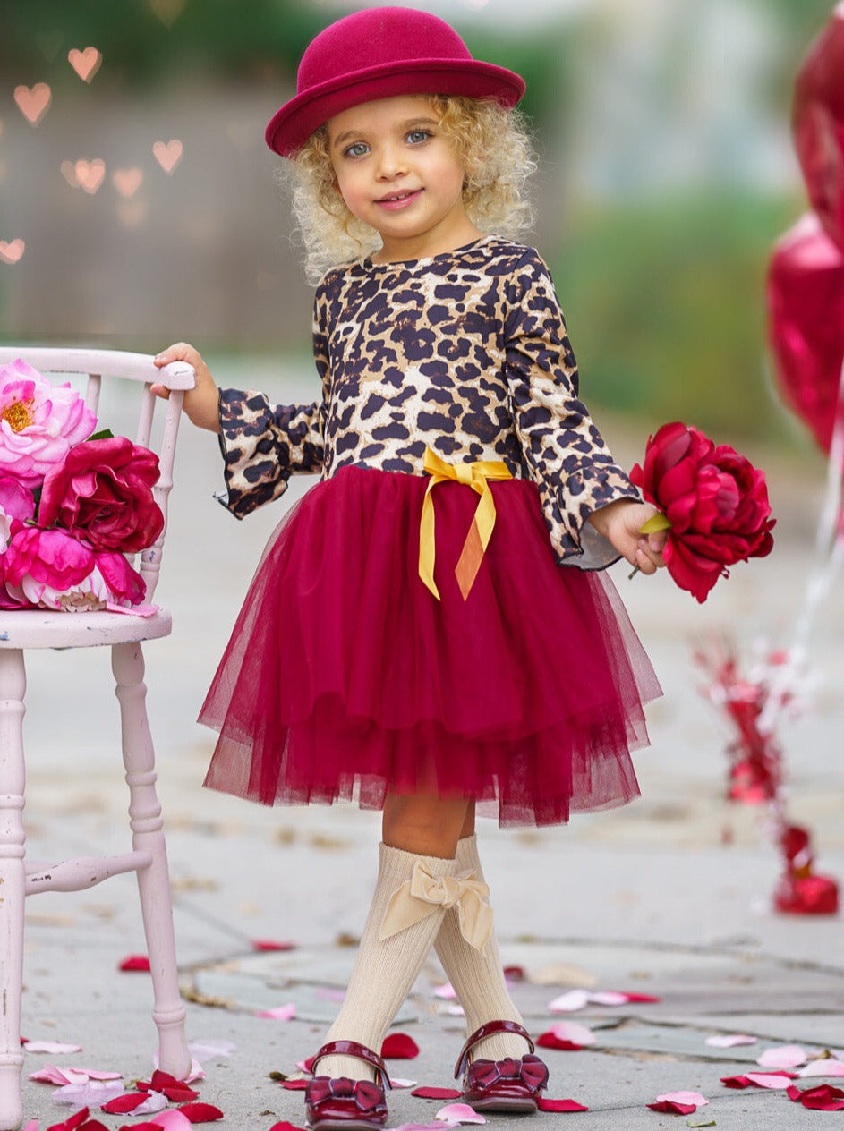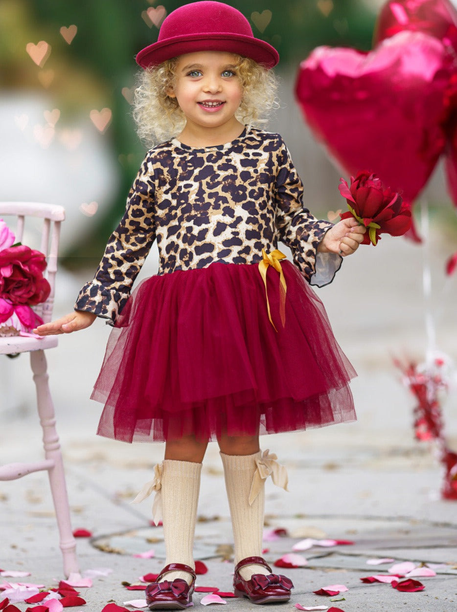 - The dress features a leopard print bodice with 3/4 length ruffle sleeves, a burgundy layered-tulle tutu skirt, and a satin bow accent