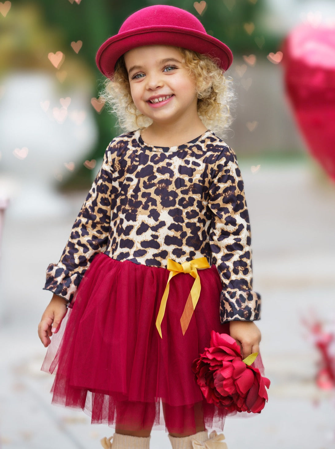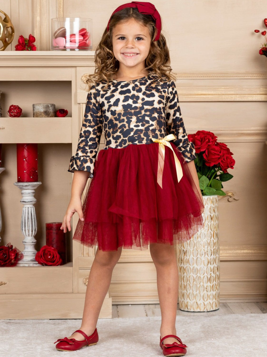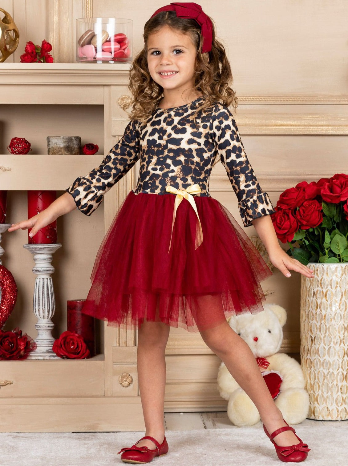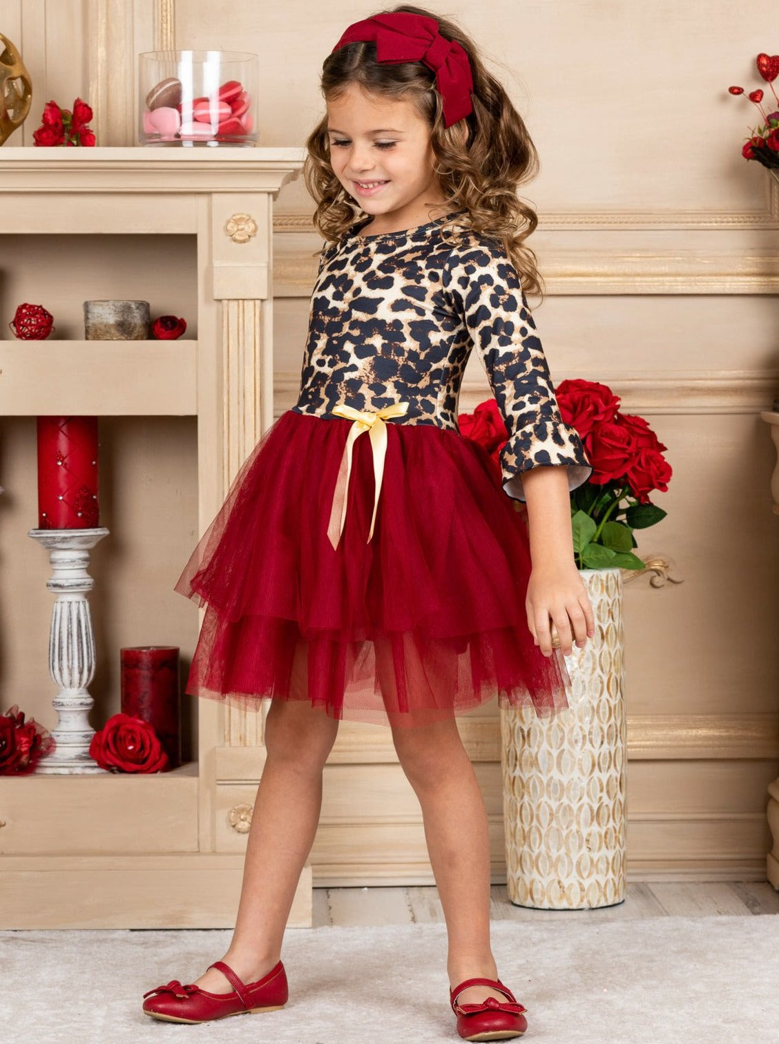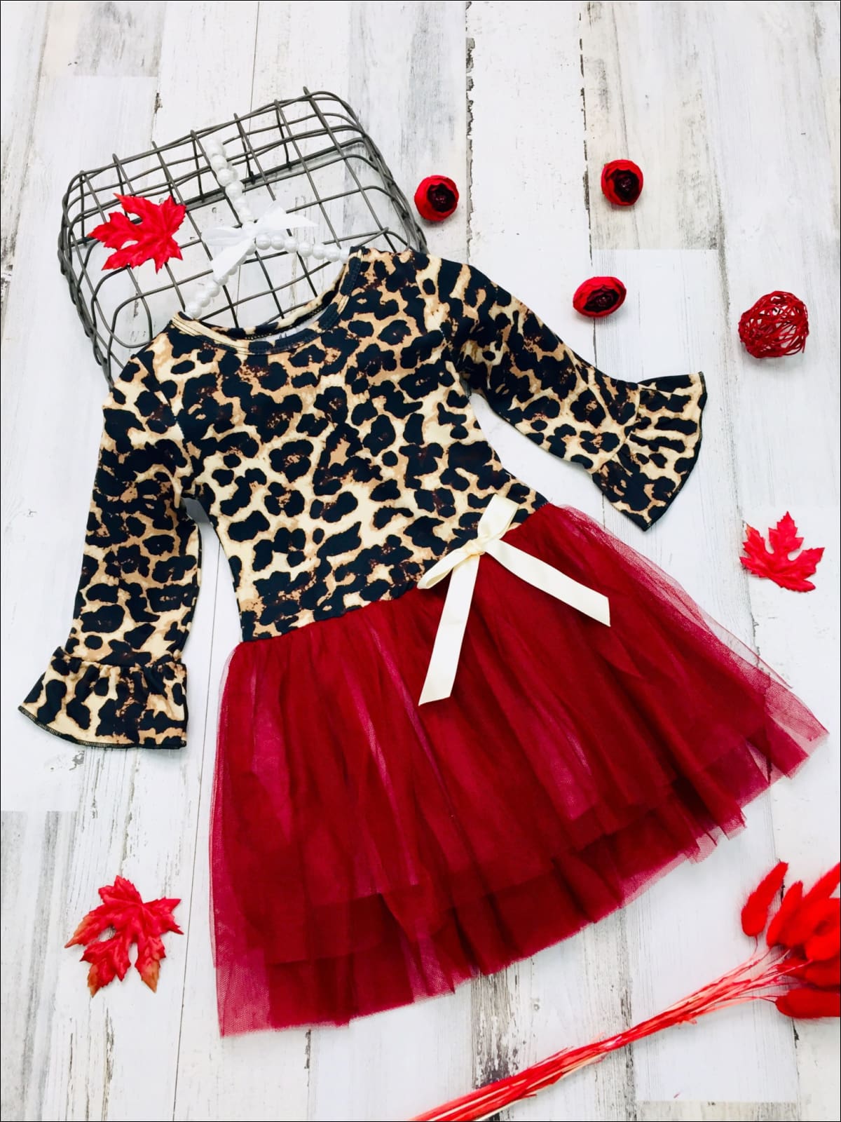 - The dress features a leopard print bodice with 3/4 length ruffle sleeves, a burgundy layered-tulle tutu skirt, and a satin bow accent