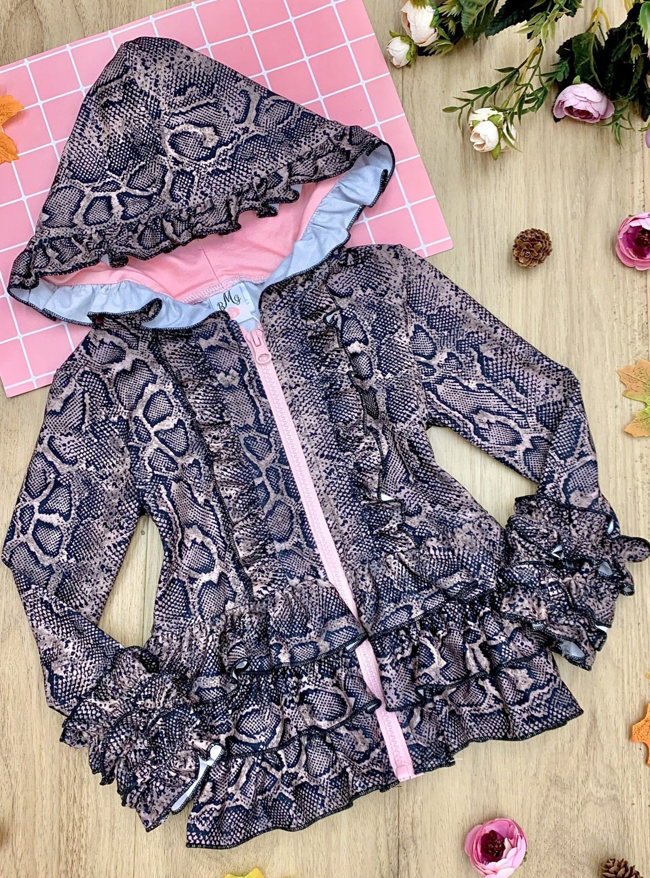 - Cardigan features an animal print (snake or leopard), tiered ruffles, a zipper down the middle and a hood
