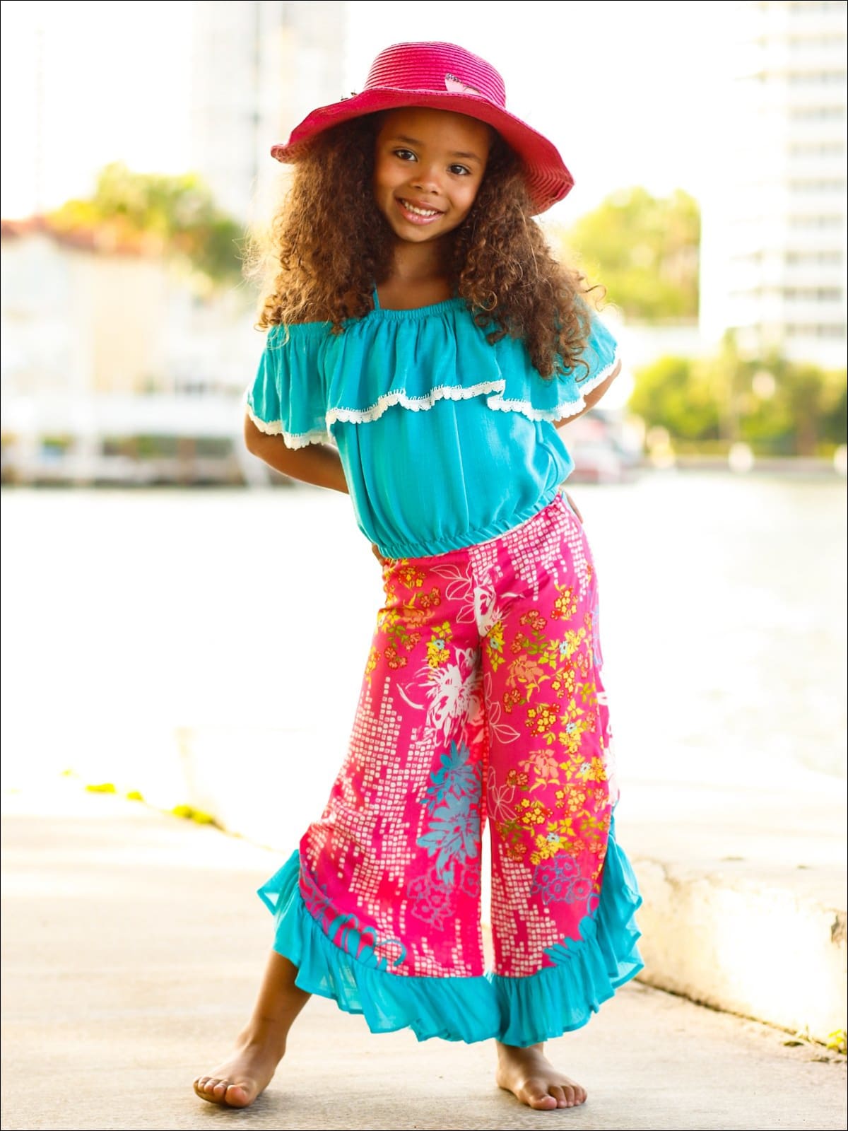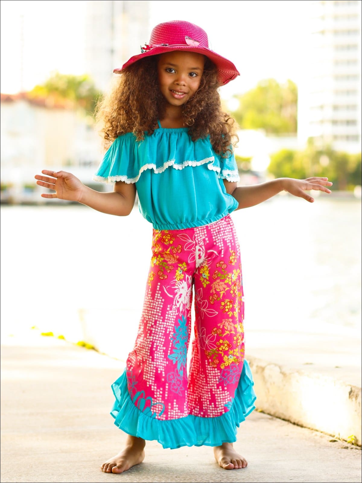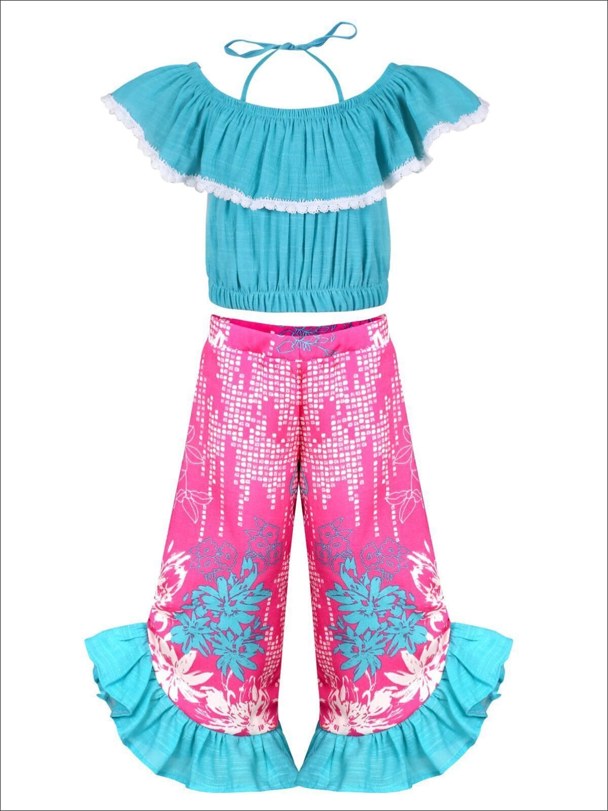 Girls Off the Shoulder Trimmed Ruffle Halter Neck Top & Floral Ruffled Palazzo Pants Set - Turquoise / 2T/3T - Girls Spring Casual Set
