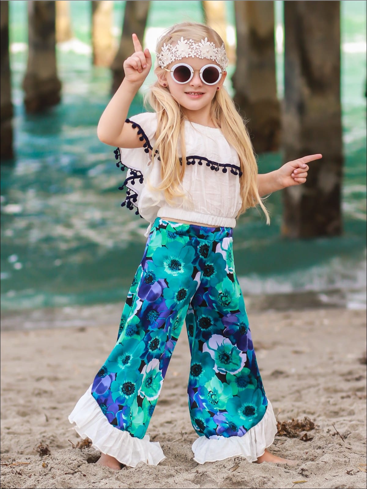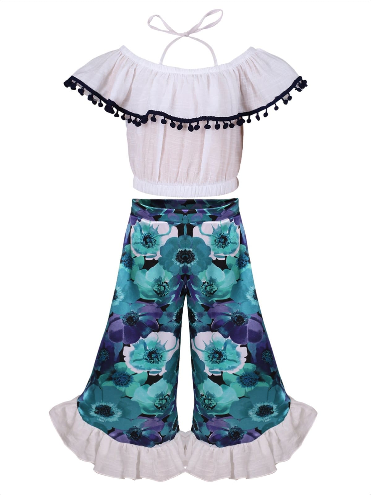 Girls Off the Shoulder Trimmed Ruffle Halter Neck Top & Floral Ruffled Palazzo Pants Set - Girls Spring Casual Set