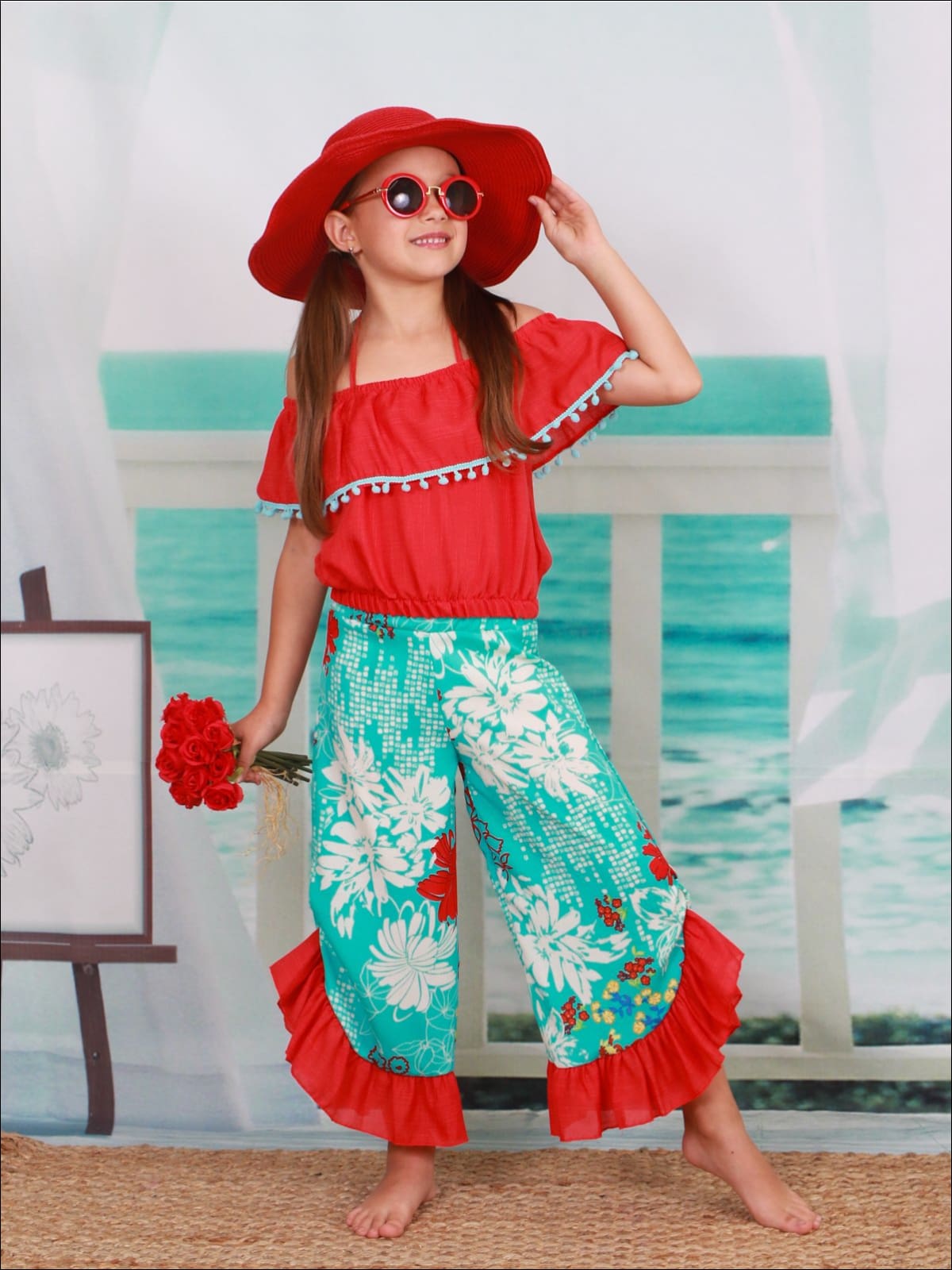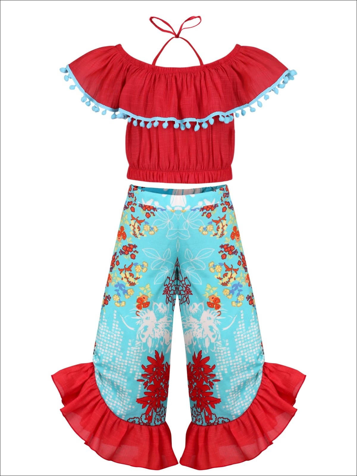 Girls Off the Shoulder Trimmed Ruffle Halter Neck Top & Floral Ruffled Palazzo Pants Set - Red / 2T/3T - Girls Spring Casual Set