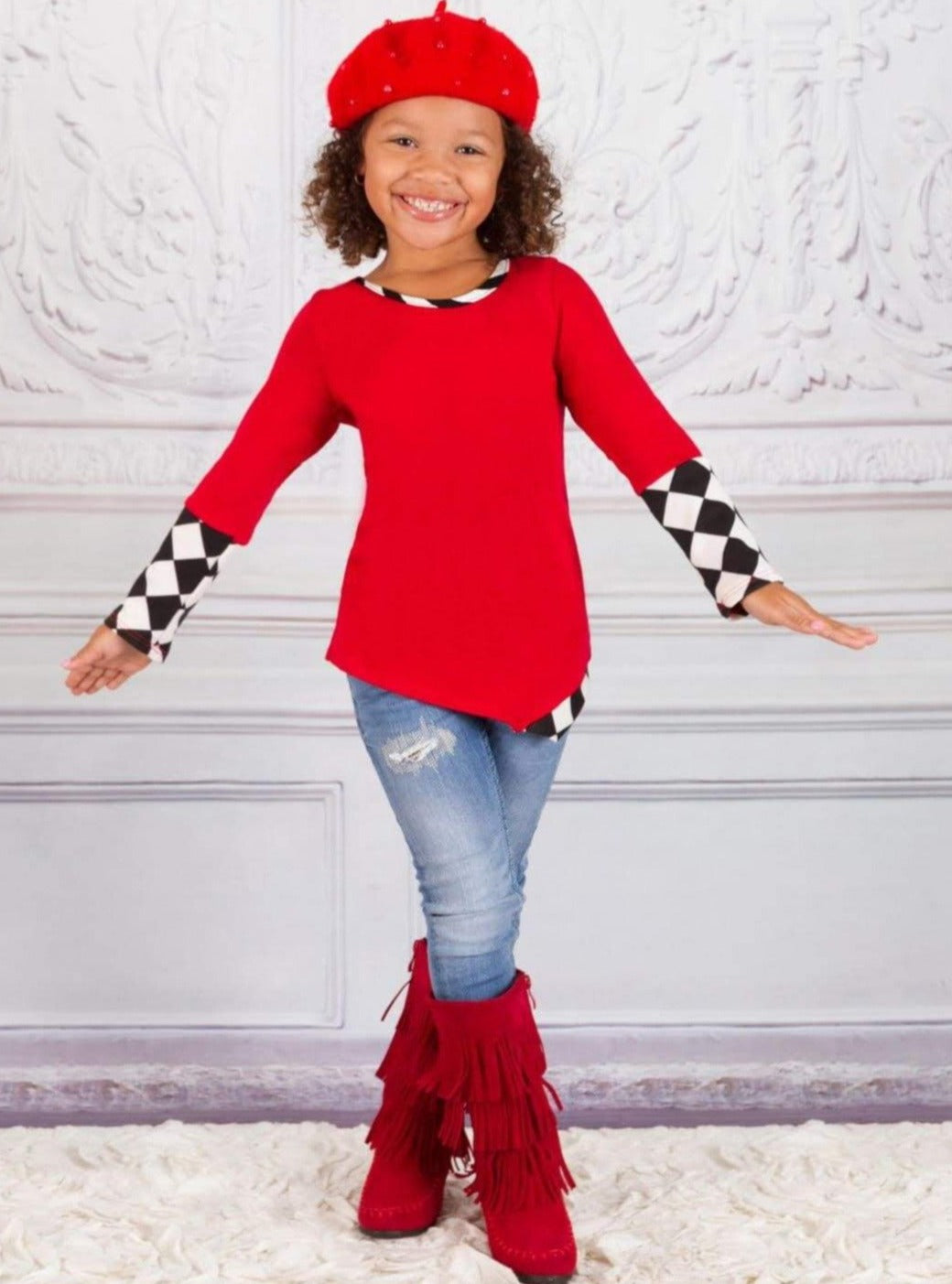 This festive tunic with harlequin print details makes a charming addition to your little lady's wardrobe. With soft fabric and cuffed sleeves, it is the perfect top to pair with any bottom for a complete look!
