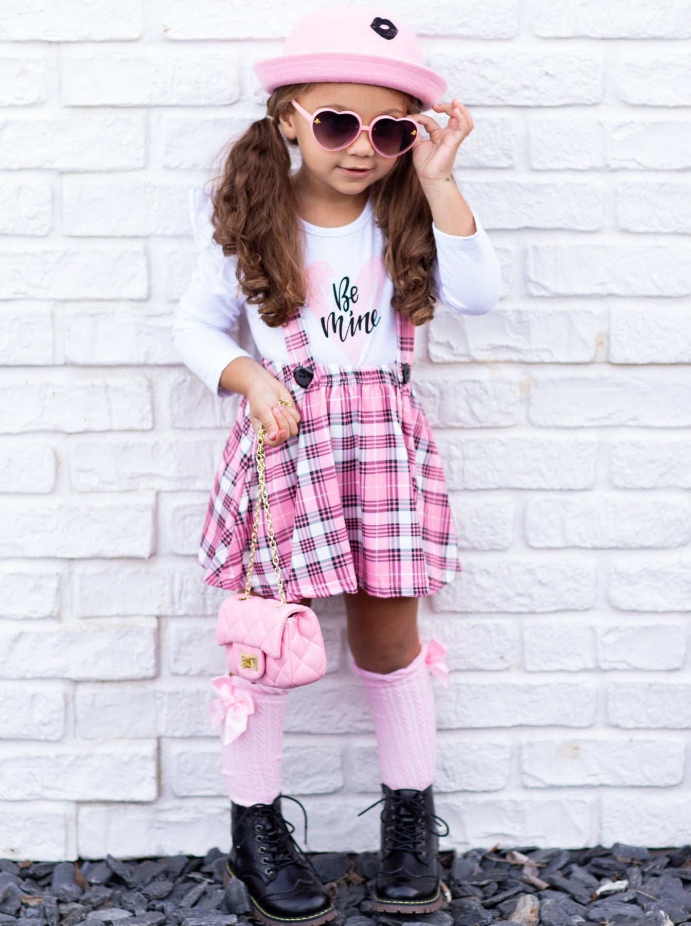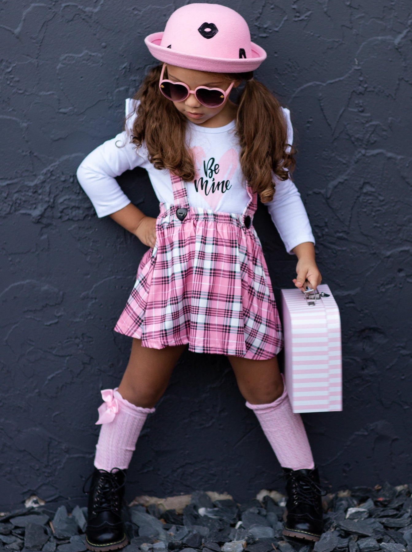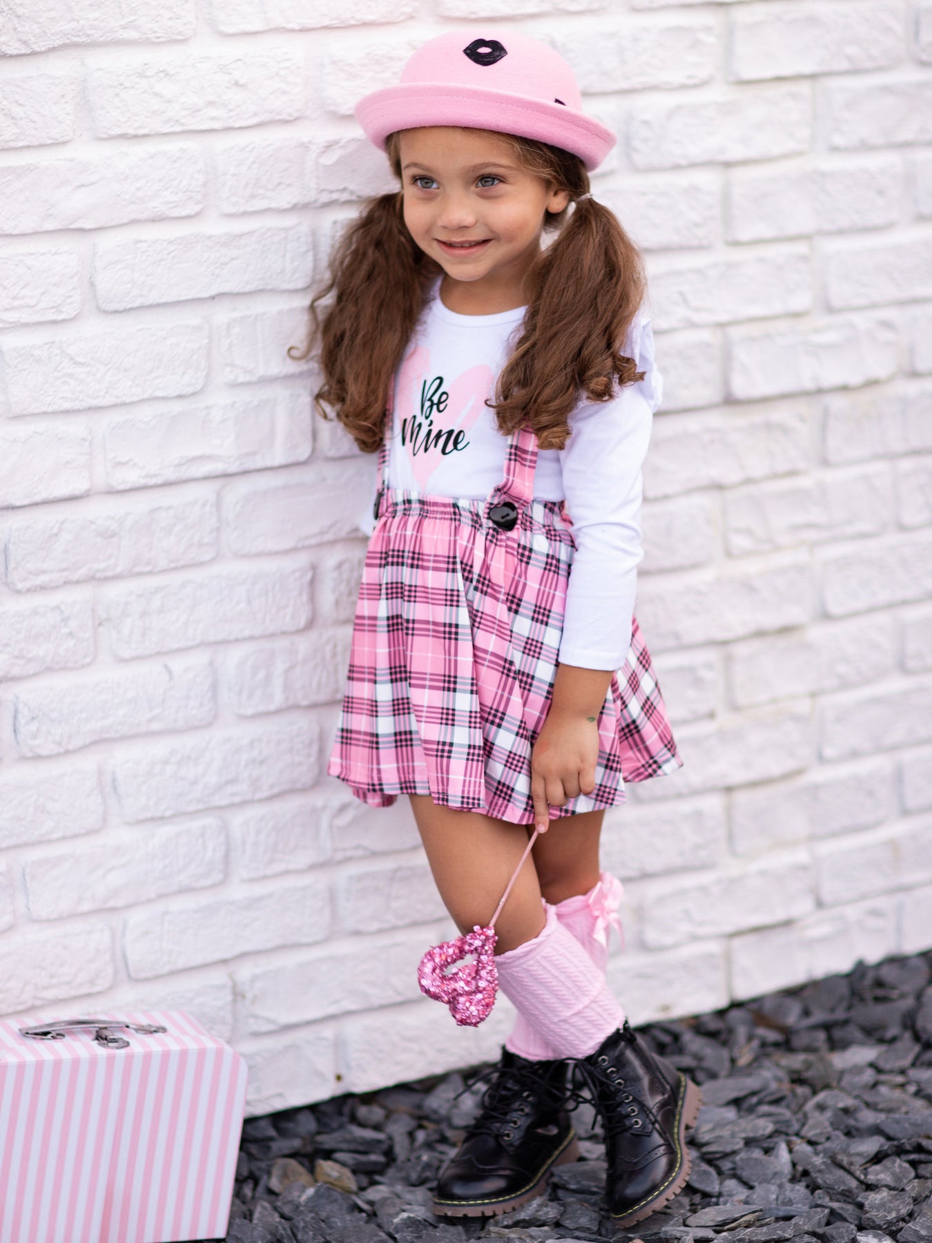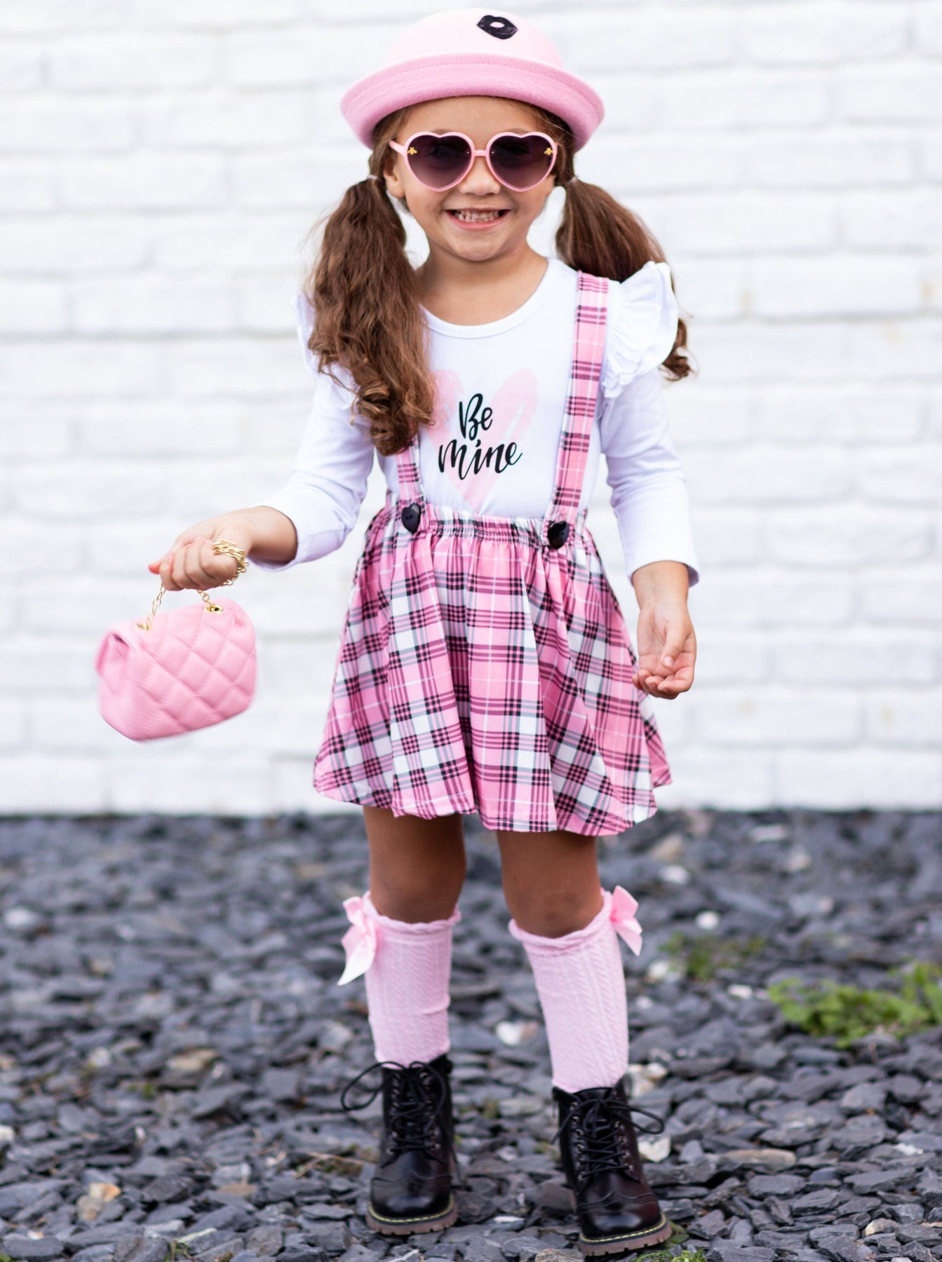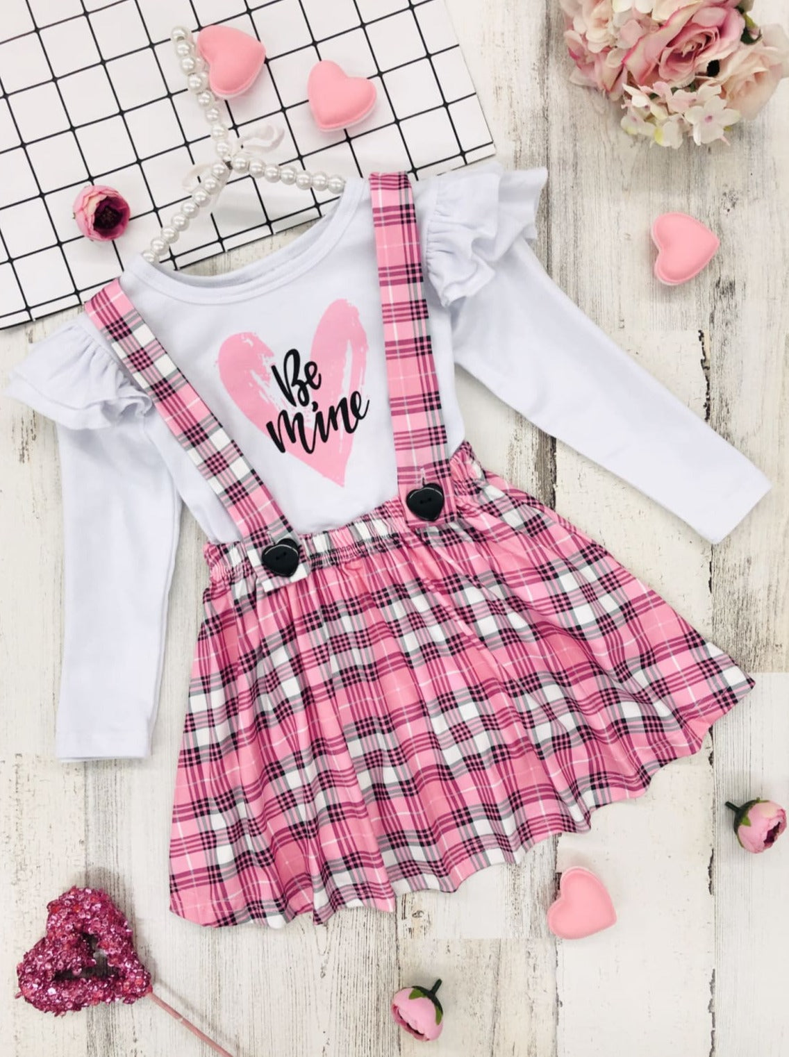 - Long-sleeve ruffle shoulder top with "Be Mine" heart graphic and plaid suspender skit with button details