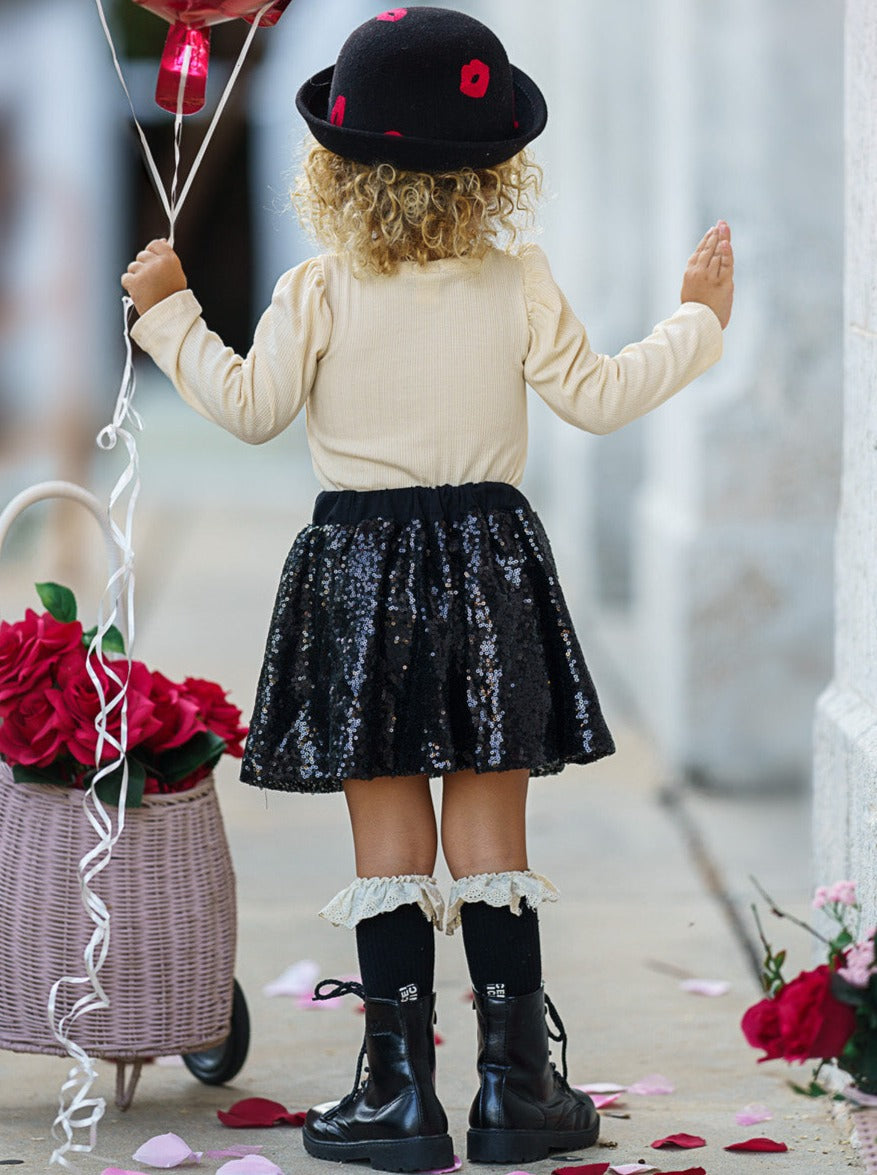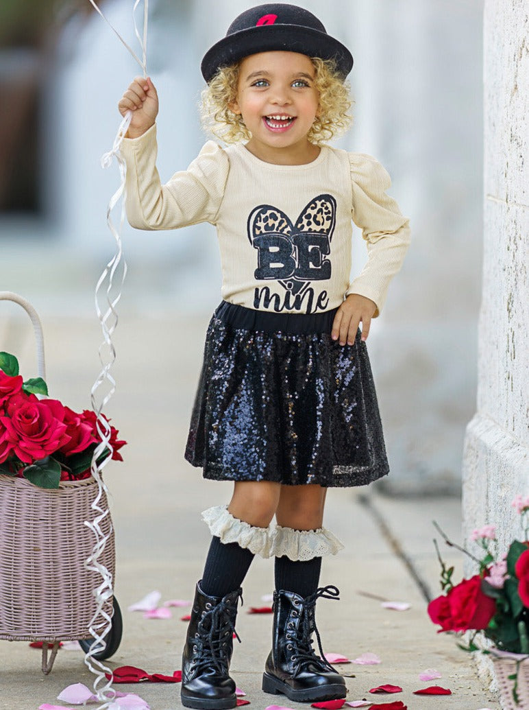 • This lovable girls' skirt set has sparkling Valentine's vibes. A "Be Mine" print top ties together with the cutest sequin skirt and makes the whole set fun and glittery for the perfect V-Day glam that's chic and unique.