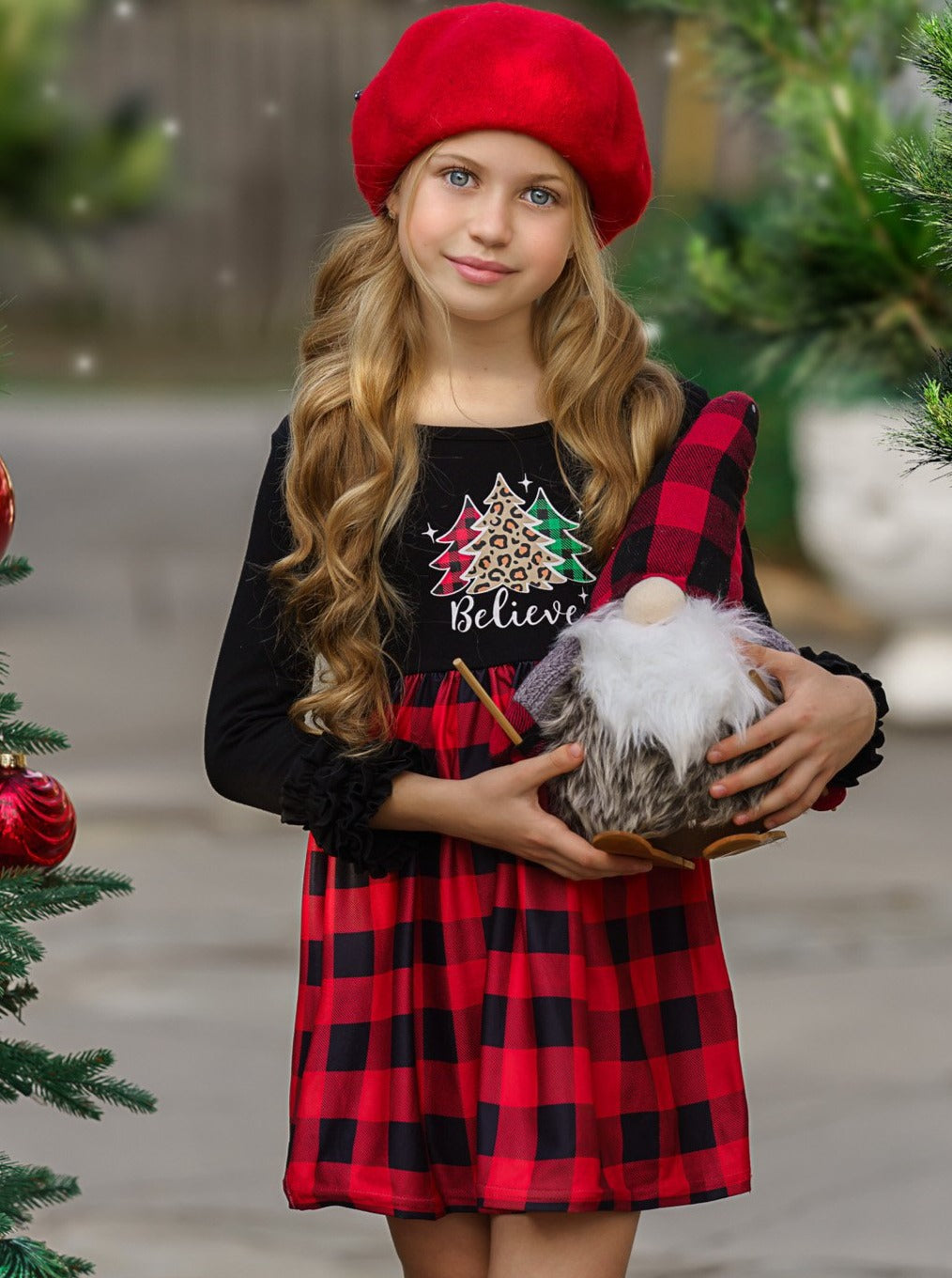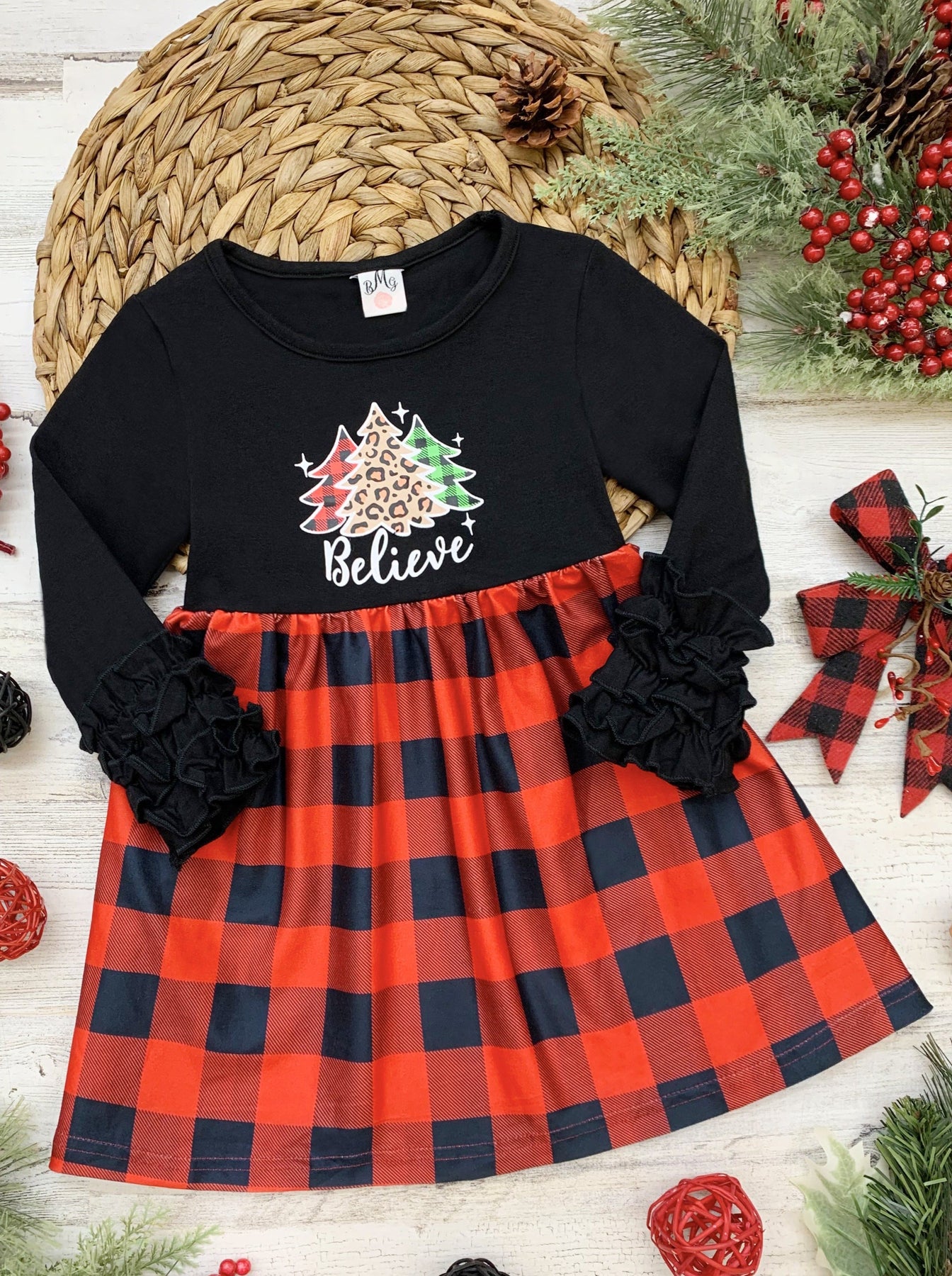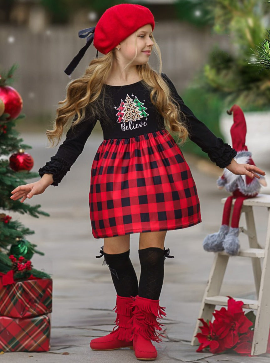 • The long-sleeved dress with ruffled sleeves features a "Believe" and Christmas trees graphics and a plaid skirt