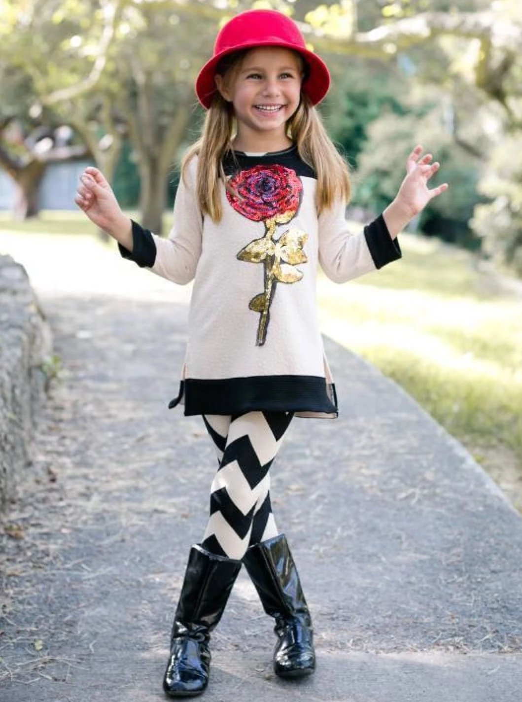 • Every girl loves roses and sequin. Now your fashionista can have them both in this pre-styled zigzag leggings set. So adorable and chic!