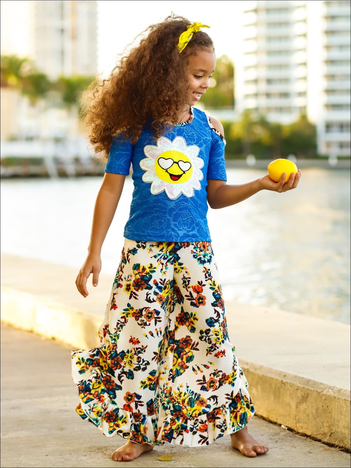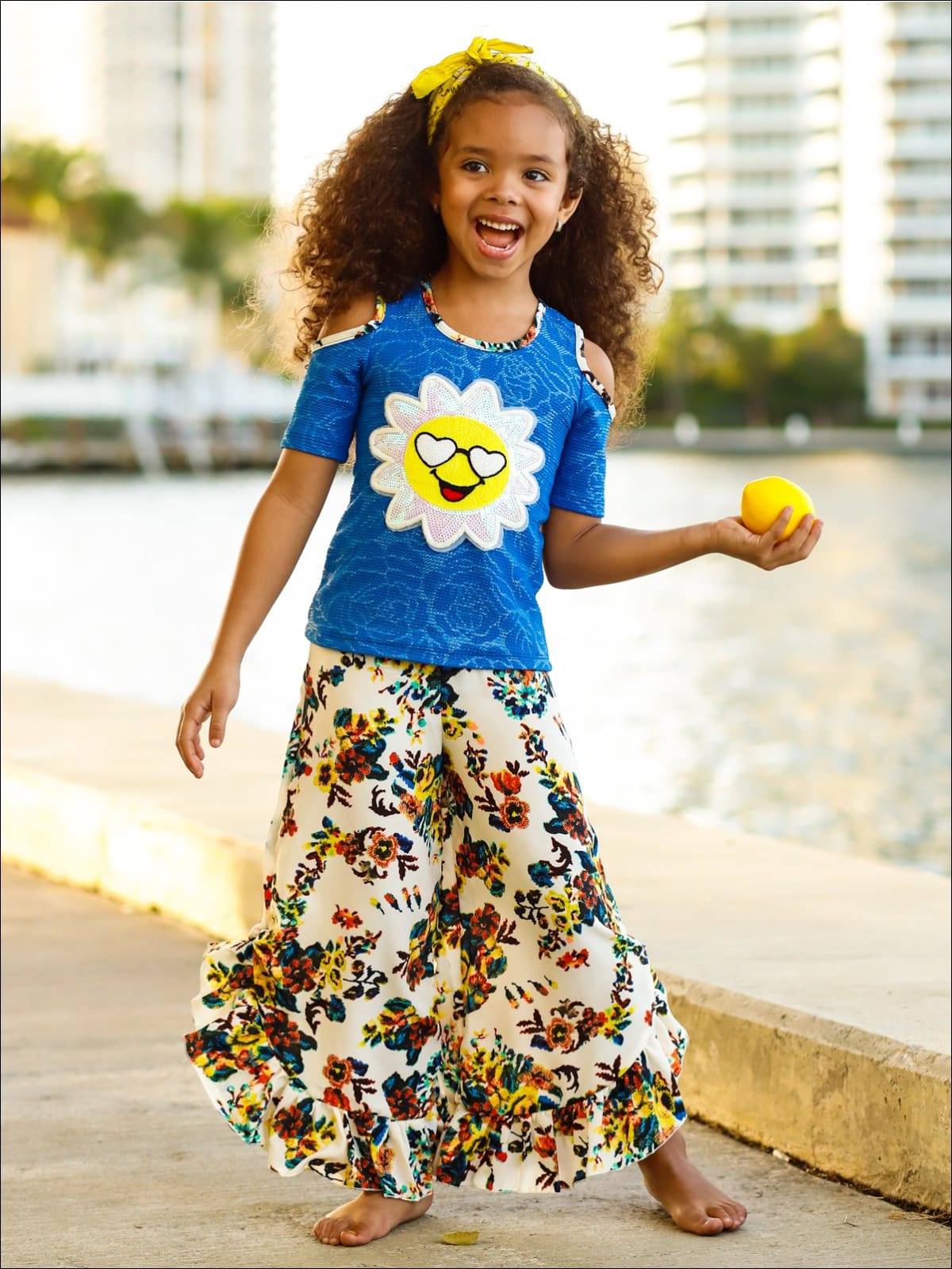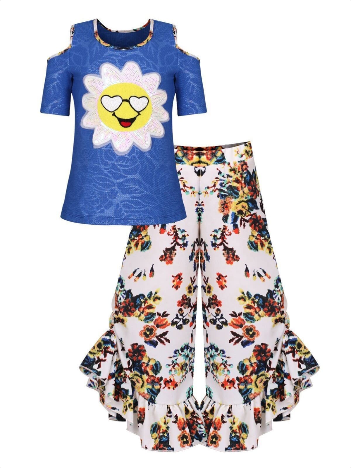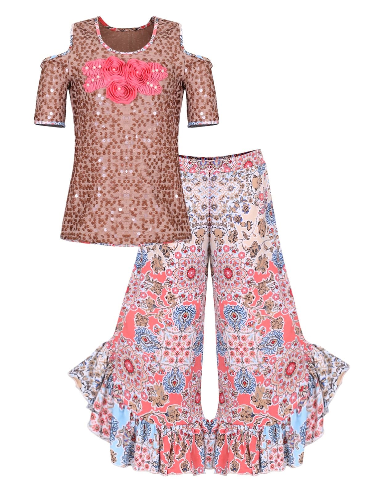Girls Trimmed Cold Shoulder Top & Ruffled Palazzo Pants Set