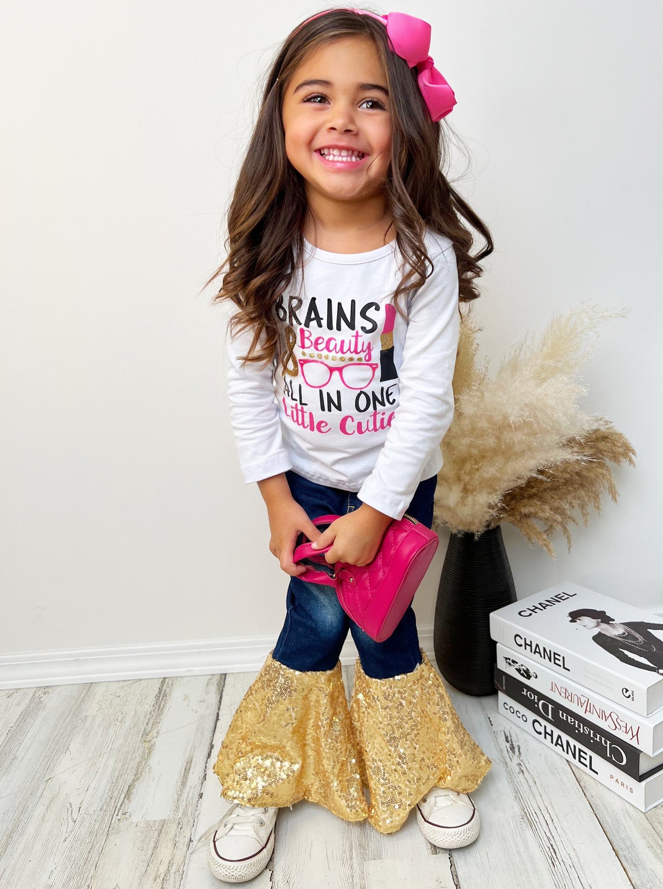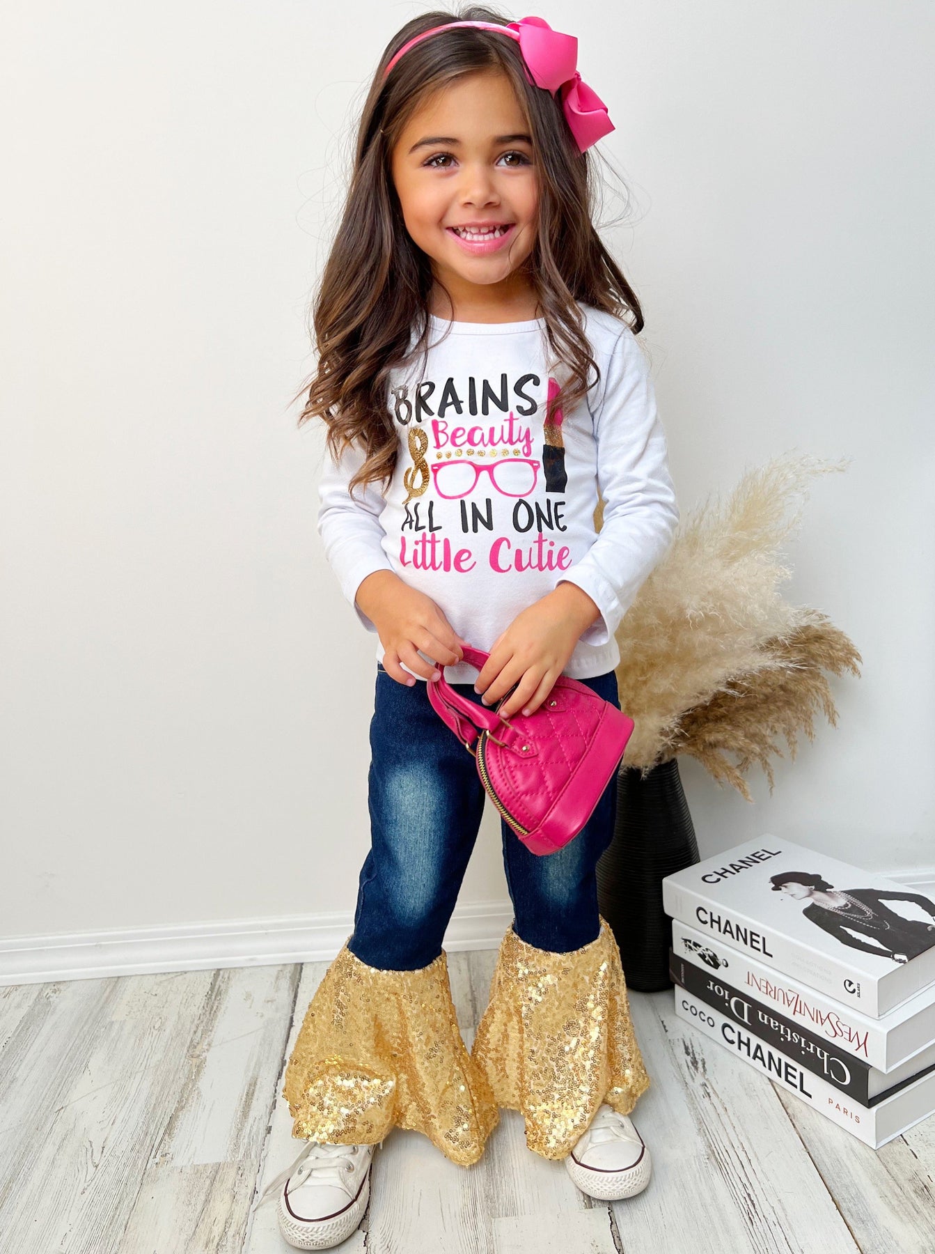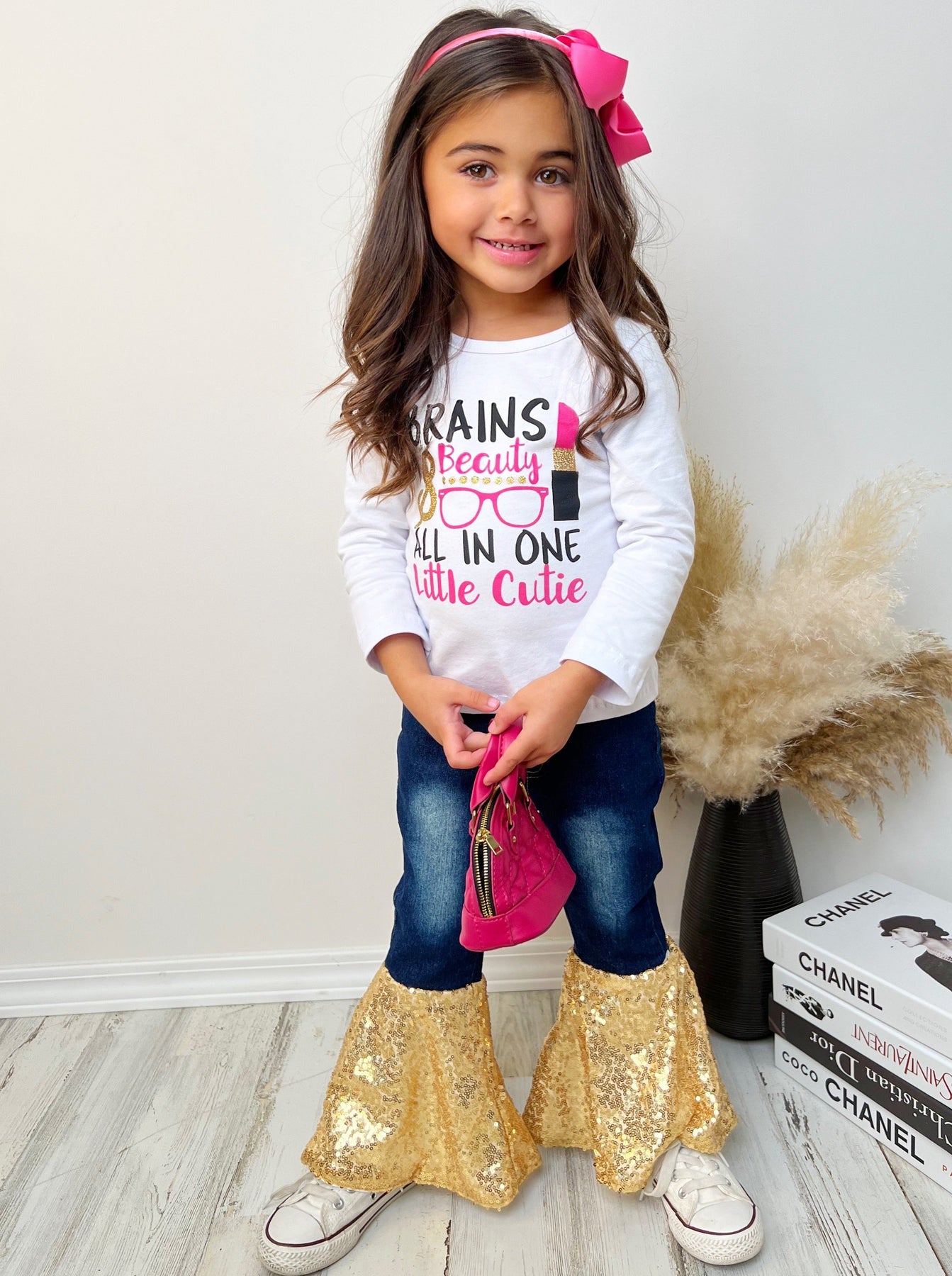• Your little girl will love this sparkly sequin bell-bottom jean set. We know your cutie has brains and beauty, but does she have an outfit that's as amazing as she is at showing it?