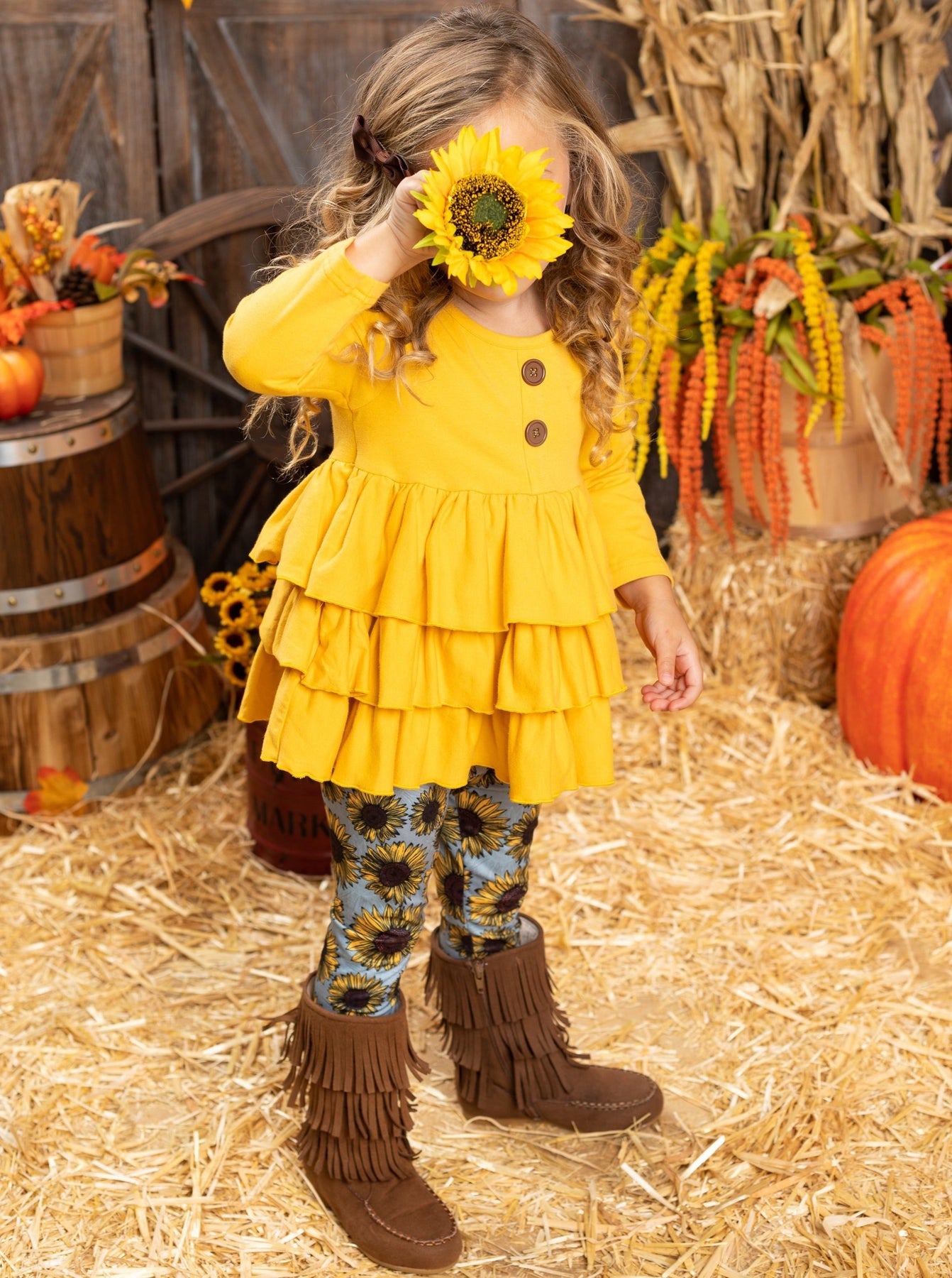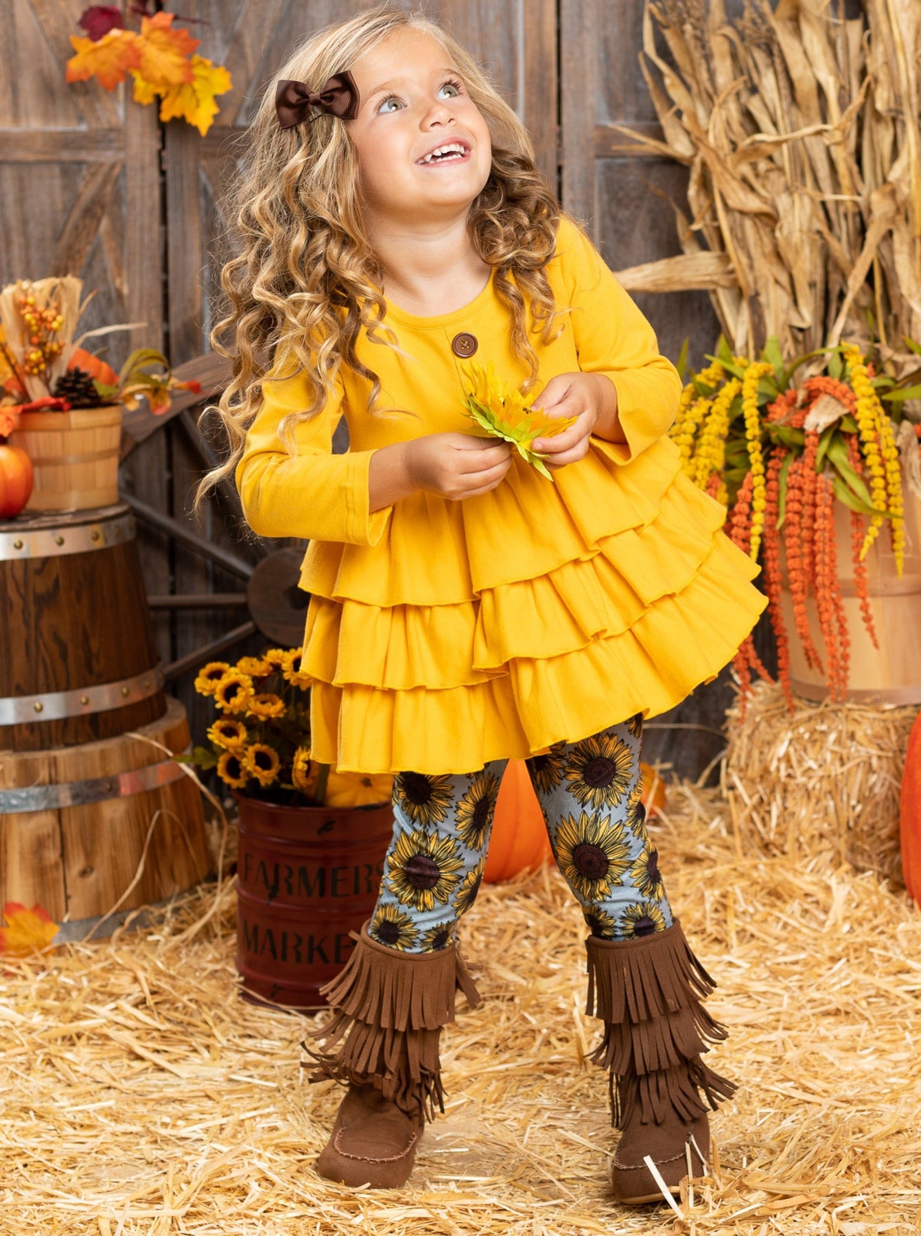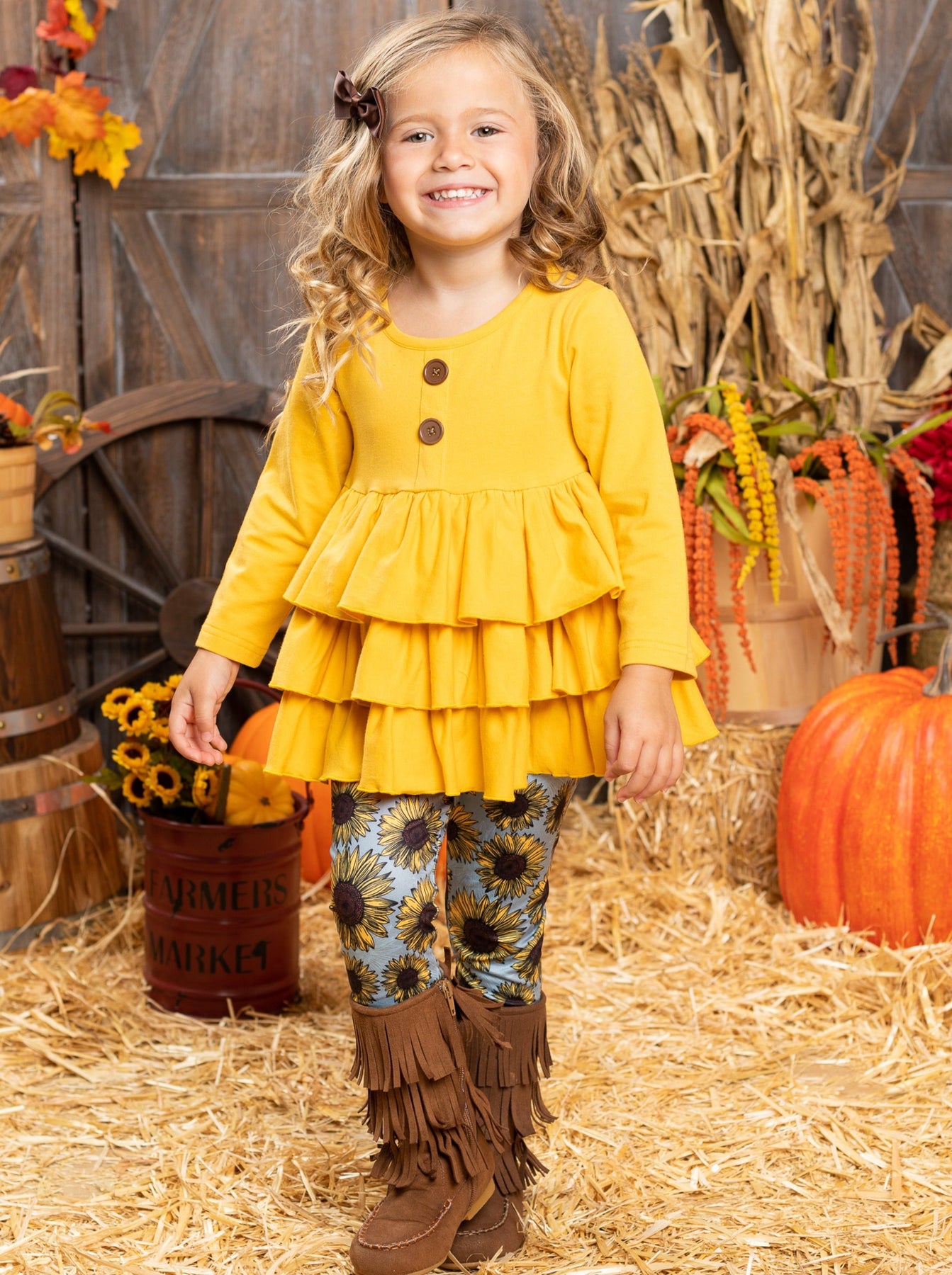 Long-sleeve tunic with faux buttons, tiered ruffle skirt, and sunflower print leggings