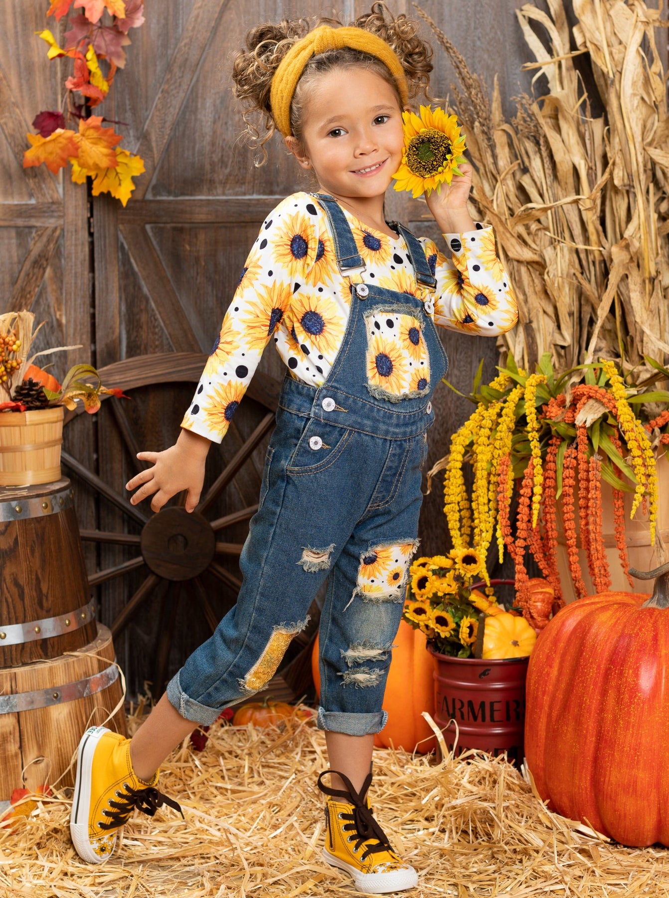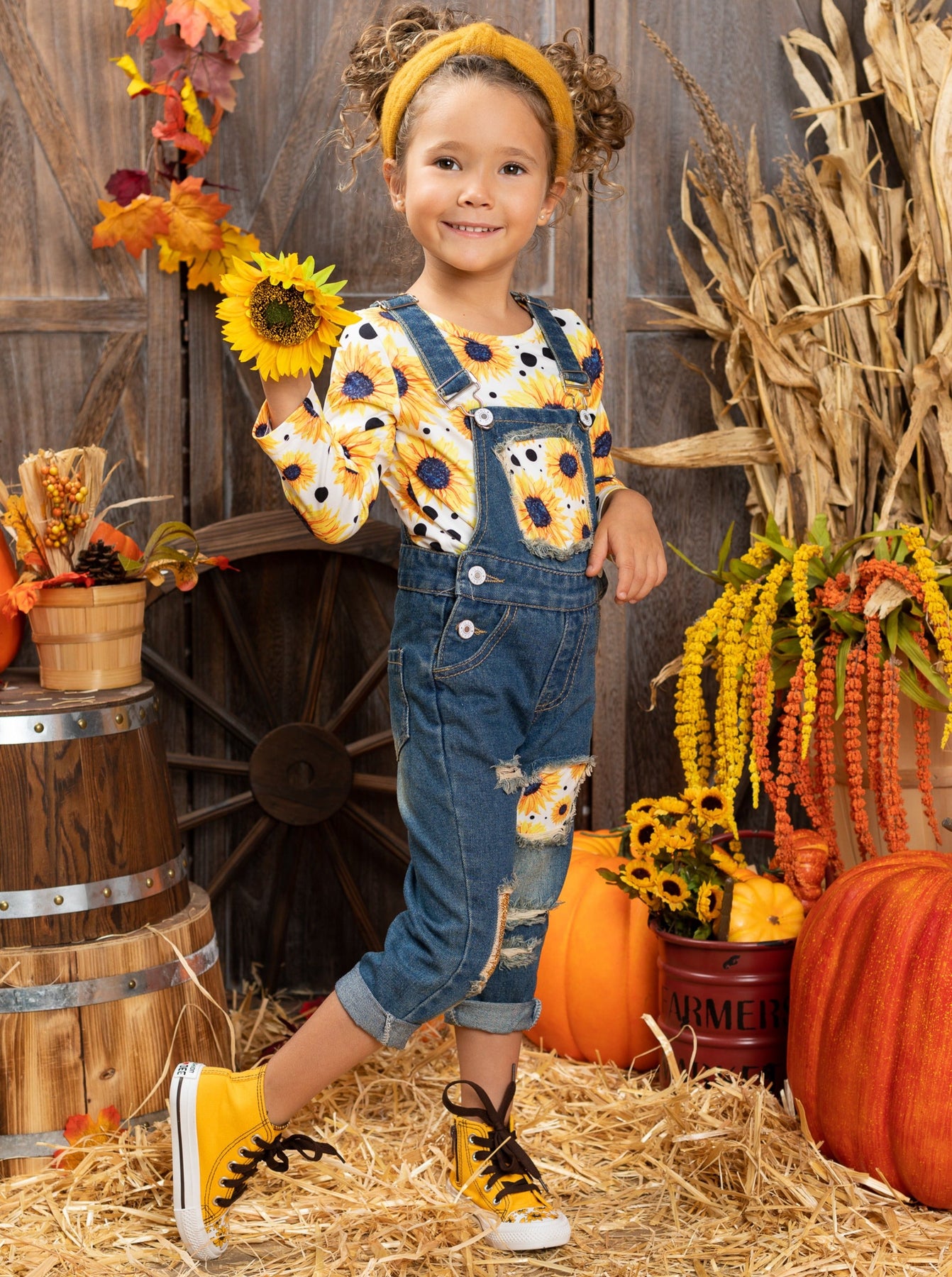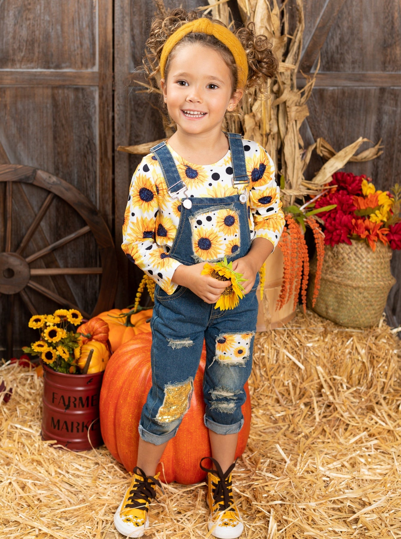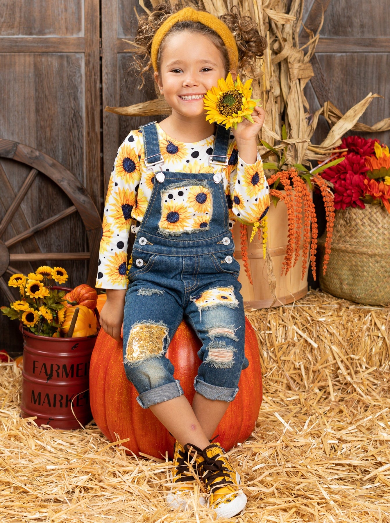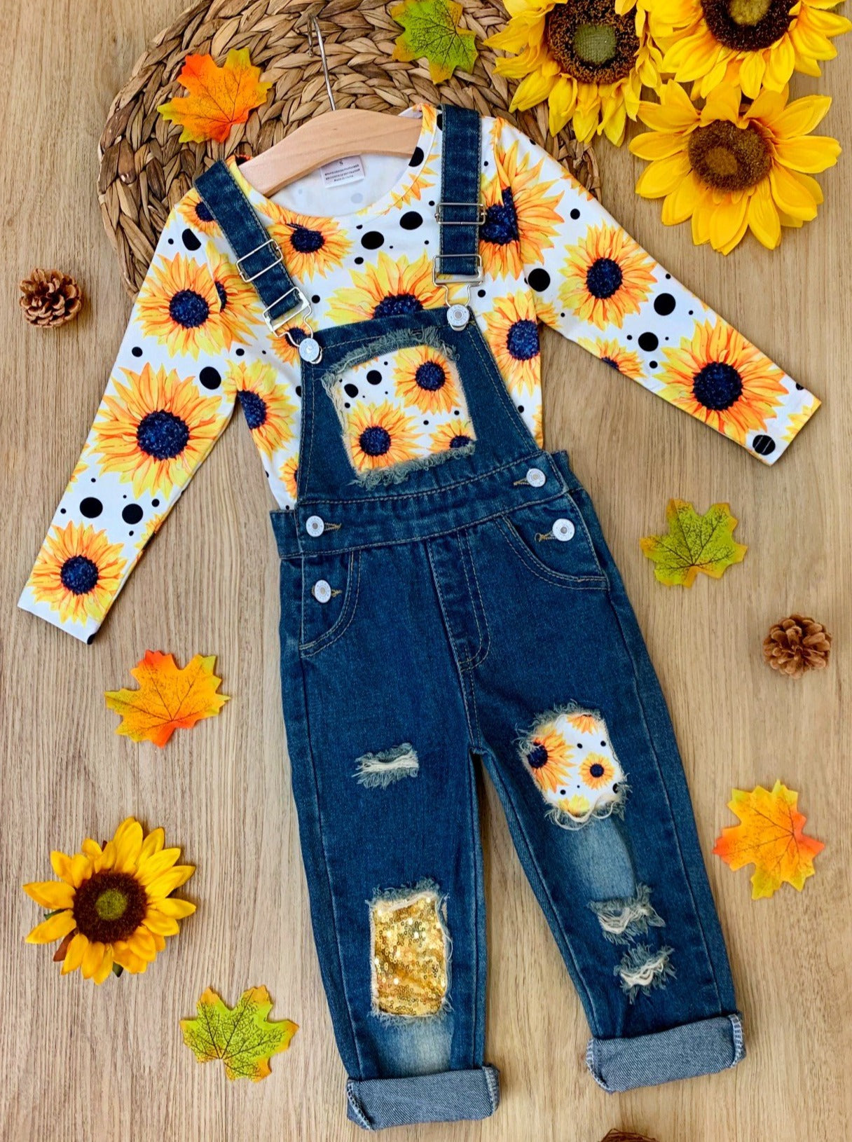 Long-sleeved sunflower print top and sequin patched denim overalls with adjustable shoulder straps and cuffed hems