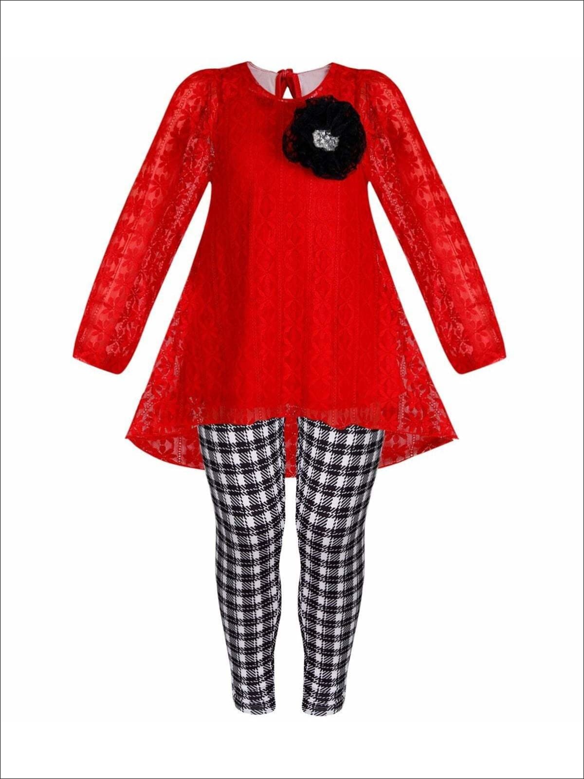 Girls Red Lace Long Sleeve Hi-Lo Tunic & Plaid Legging Set