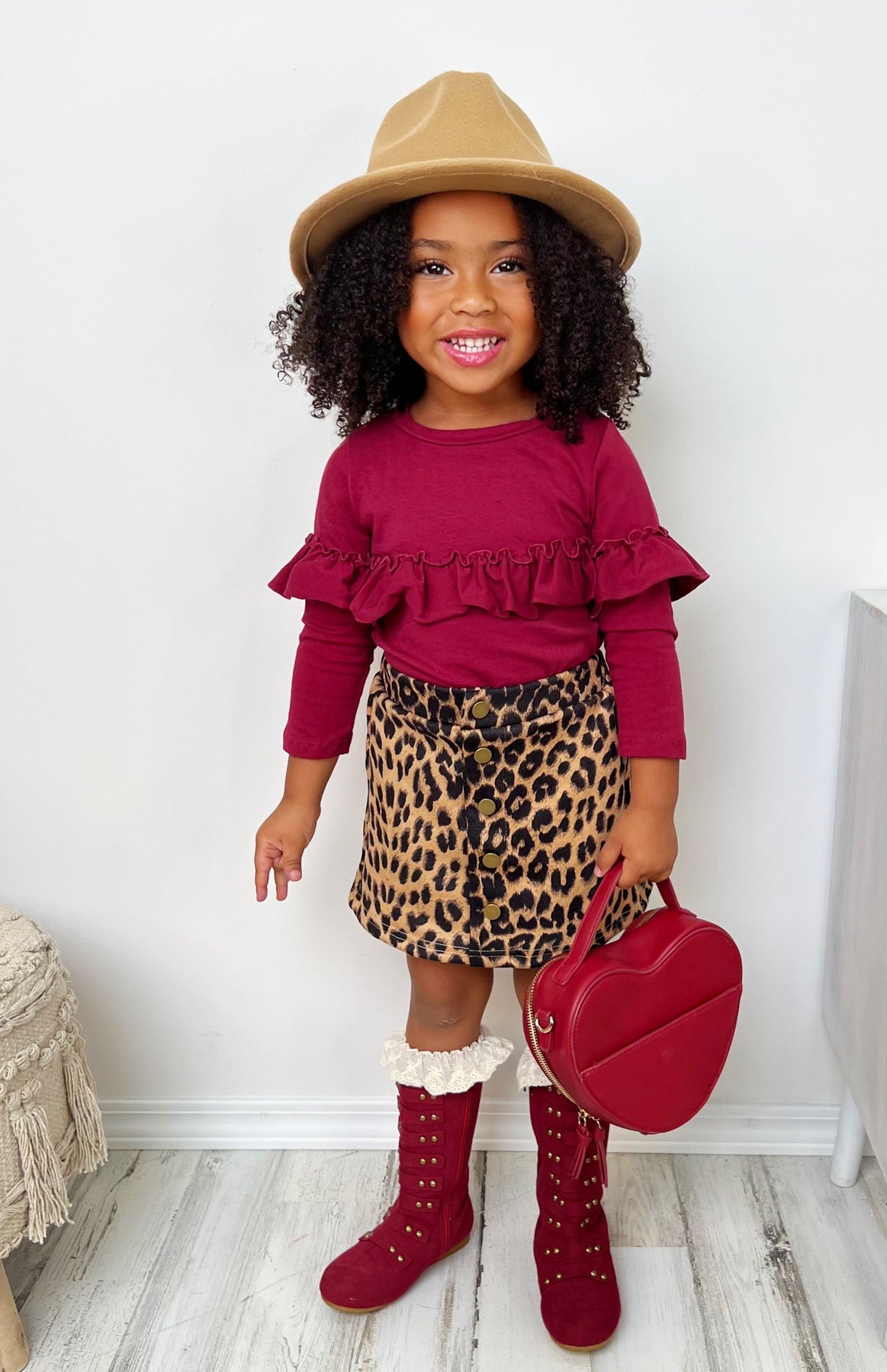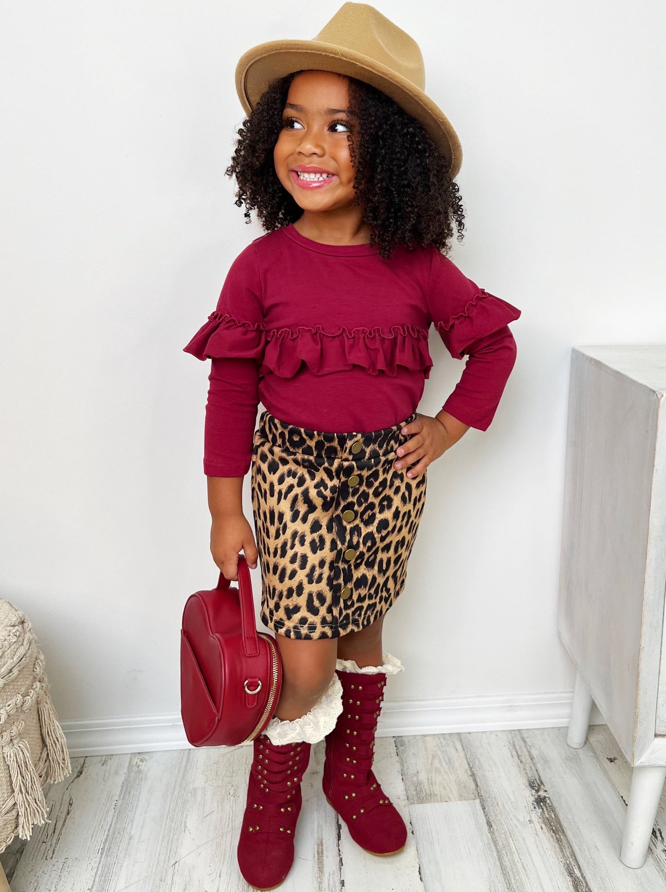 Little girls long-sleeve top with center ruffle trim and animal print faux-button skirt - Girls Fall Casual Set