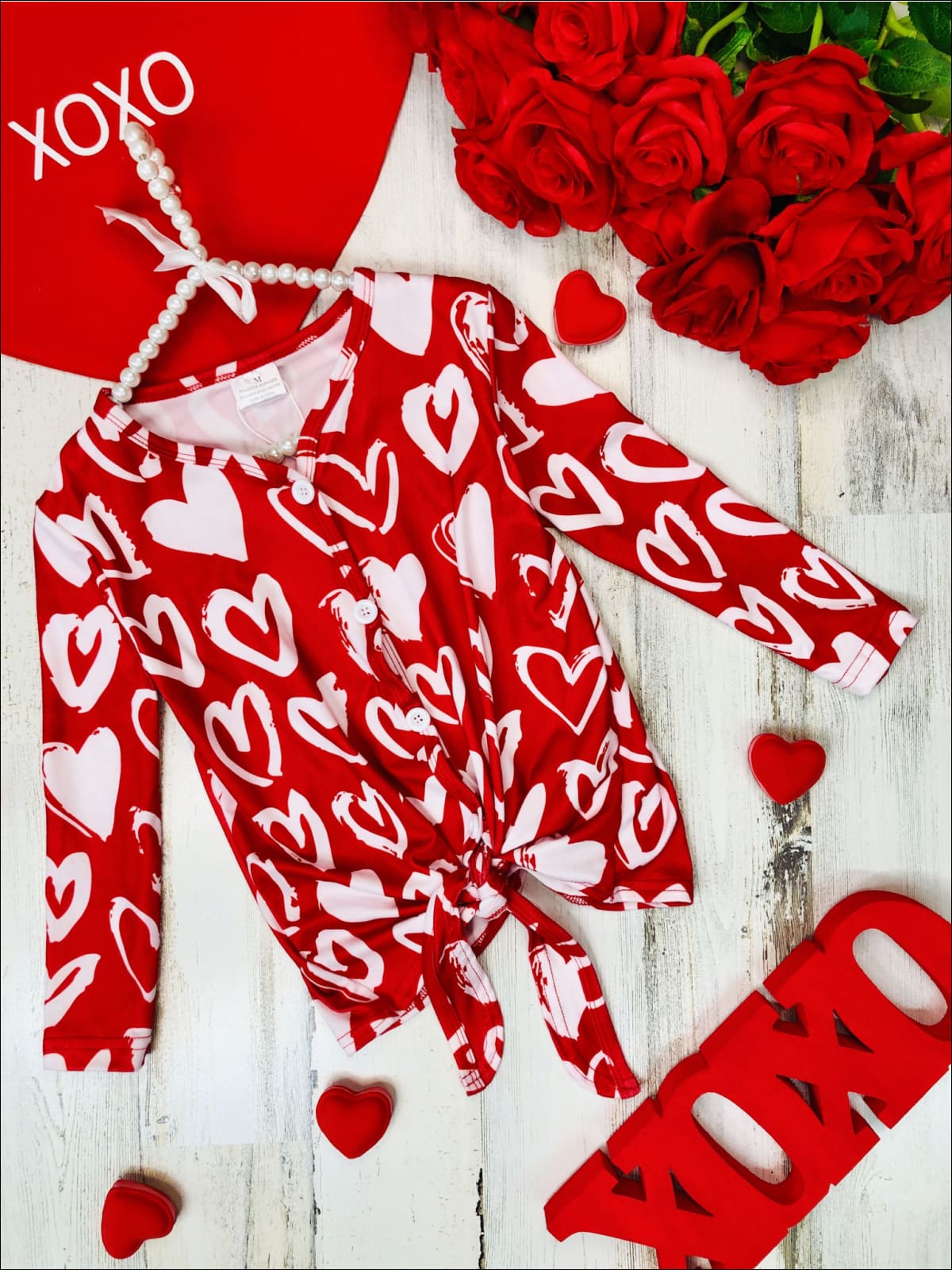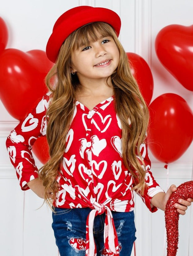 - Top features a heart print, buttons down the center and a tie knot at the hem