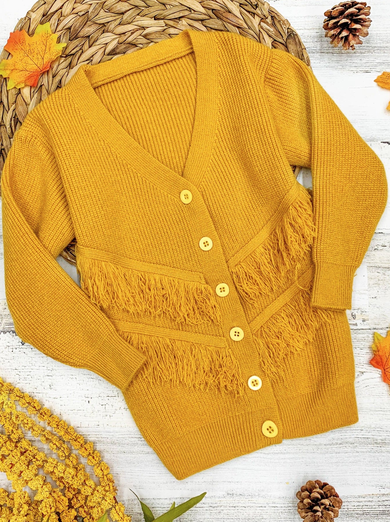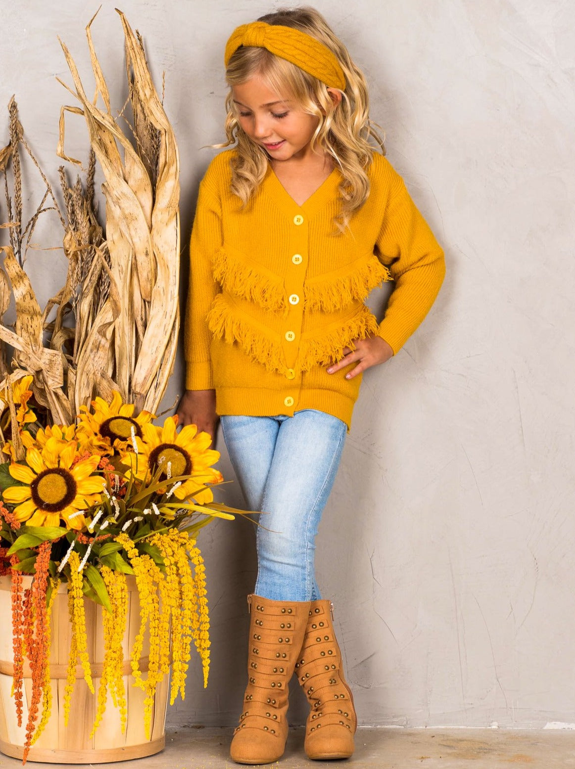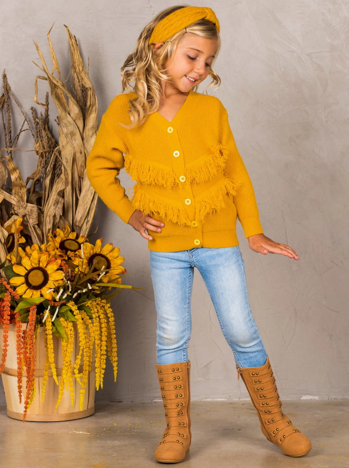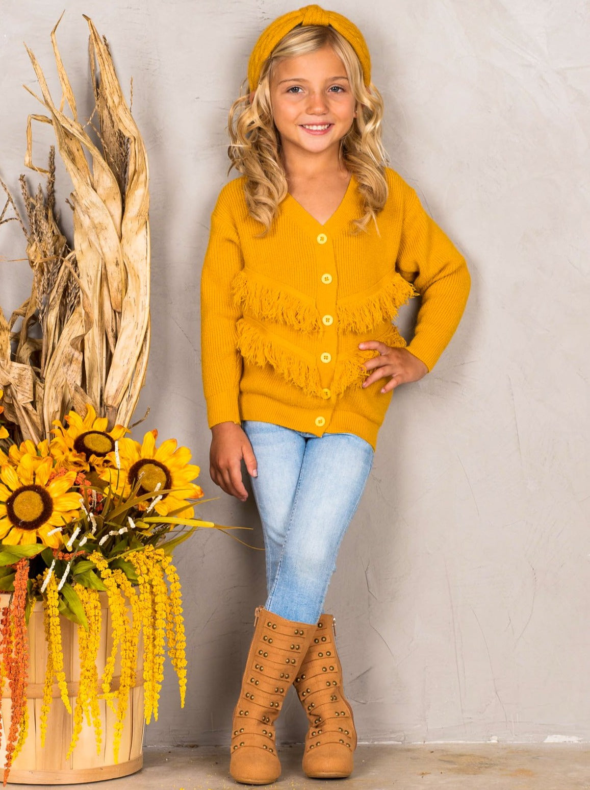 Cozy up your cutie's closet with this trend-right cardigan accented by double frayed V design and crafted from soft, fuzzy fabric. She’ll stay warm while still showing off her innate sense of style with this casual cardigan boasting a lived-in look.