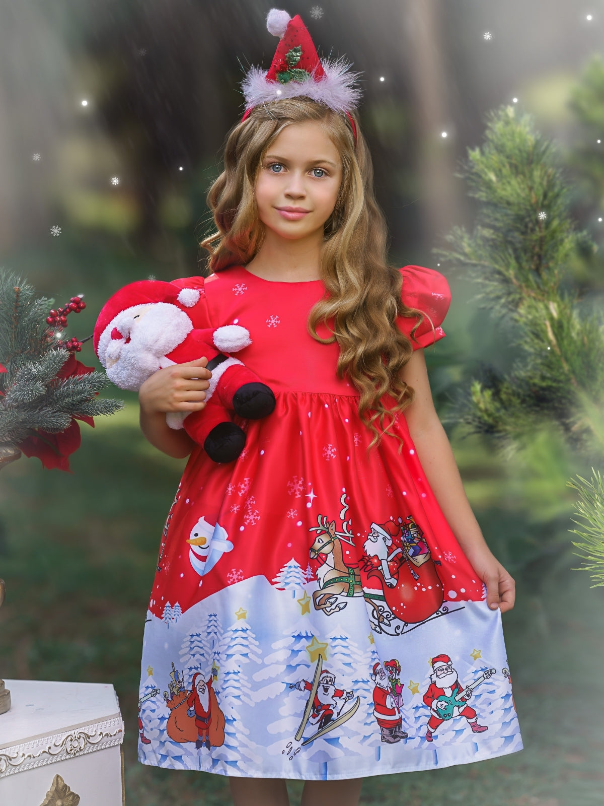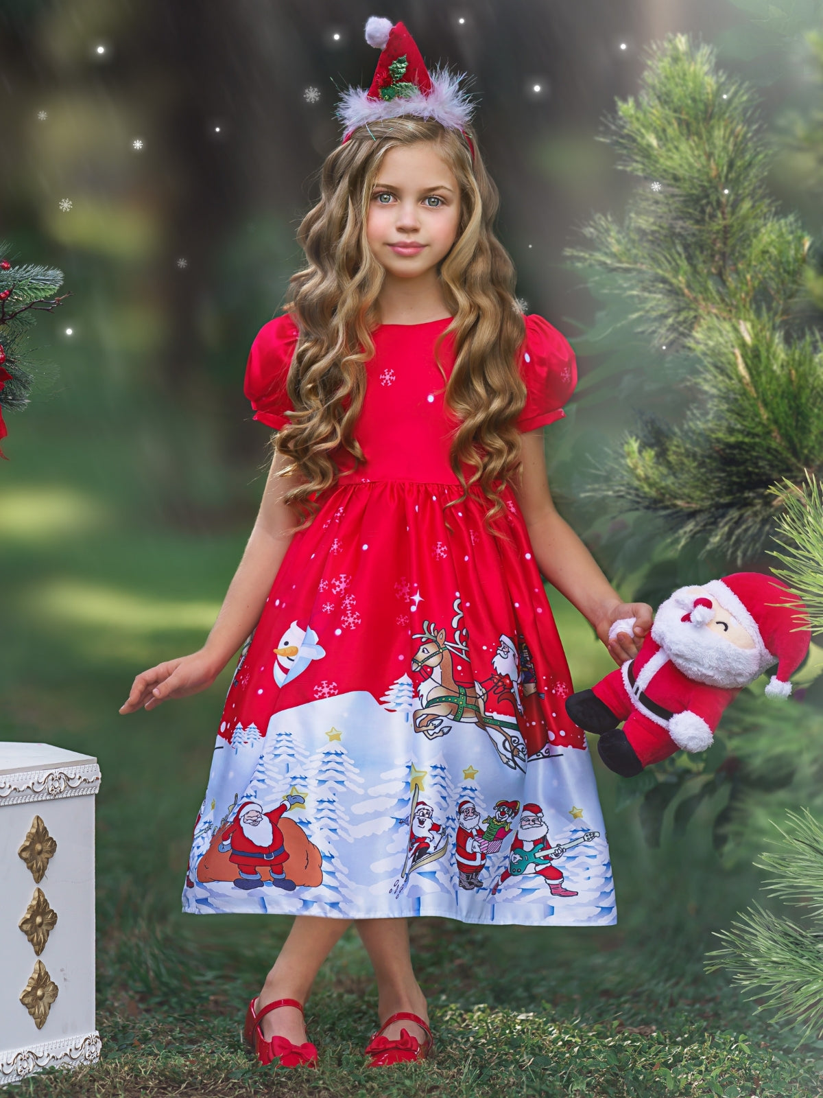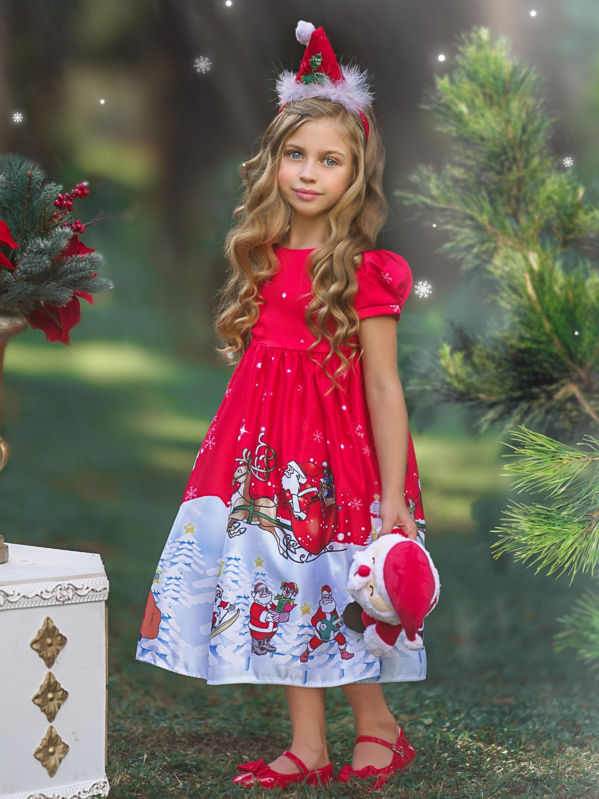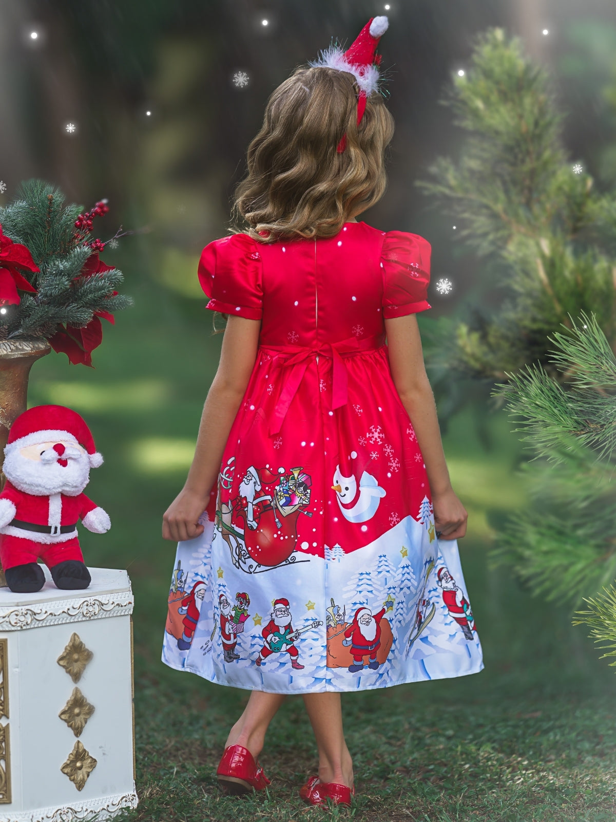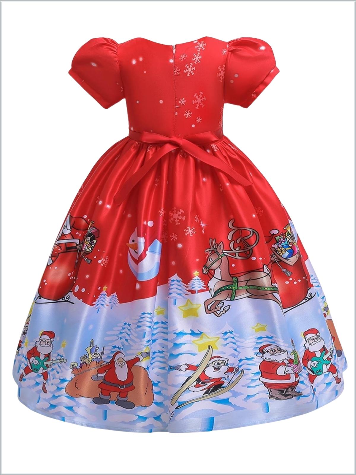 • Short puff sleeves dress with 360-degree Santa's sleigh and snow graphic print skirt, and back zipper/bow finish