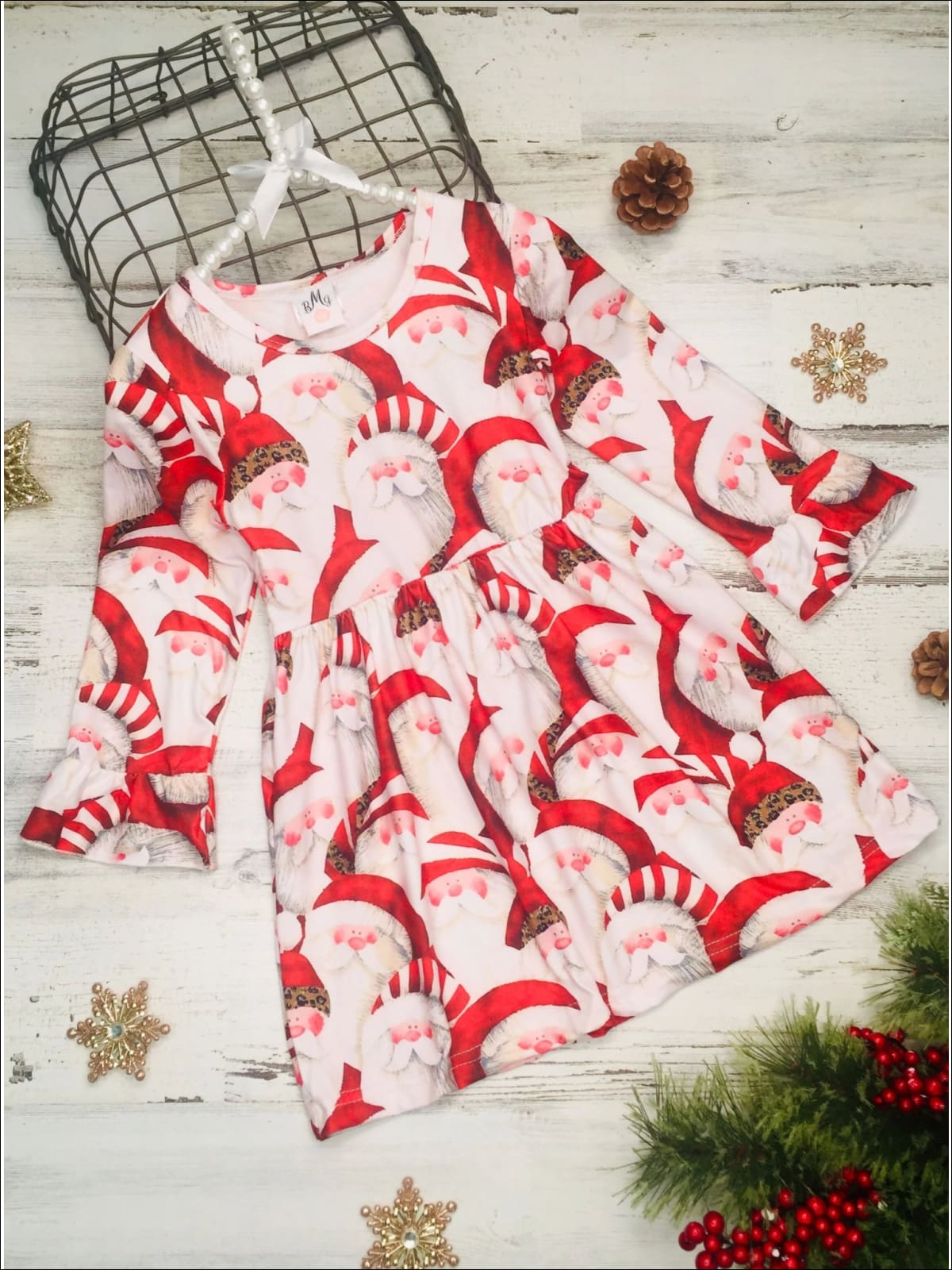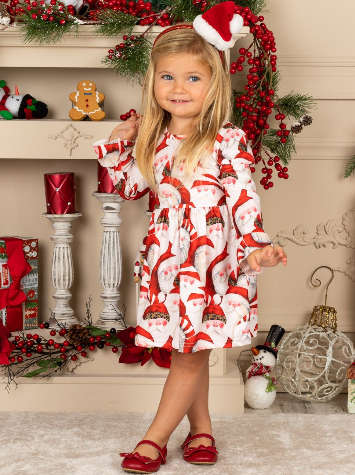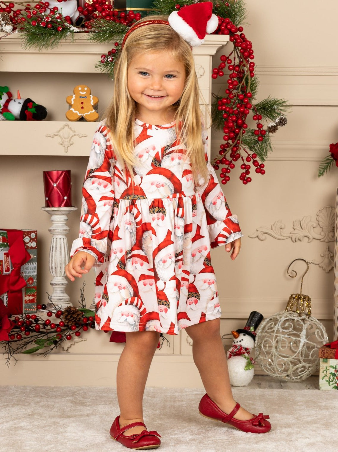Take a photo with Santa in this soft cotton dress. With a darling Santa print, you will see why this Christmas dress becomes her fave.