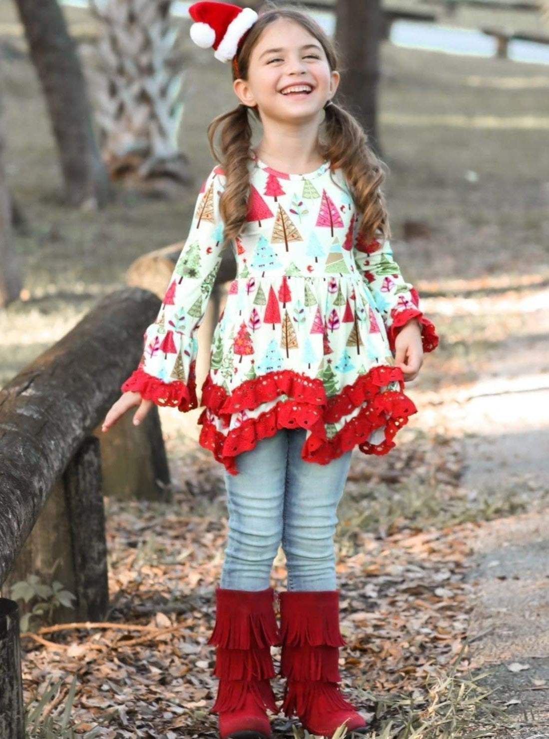 Girls Christmas Tree Tunic with Red Ruffles - Girls Christmas Top