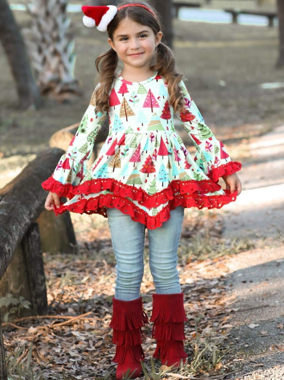 She will be caroling all the way home in this Christmas tree tunic with red ruffles. Let your little fashionista mix and match this magical piece with her bottoms and watch it become her favorite this holiday season!