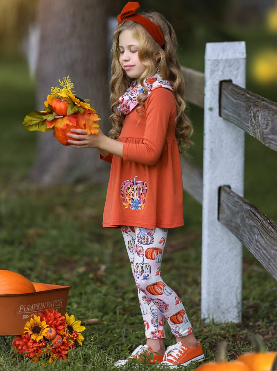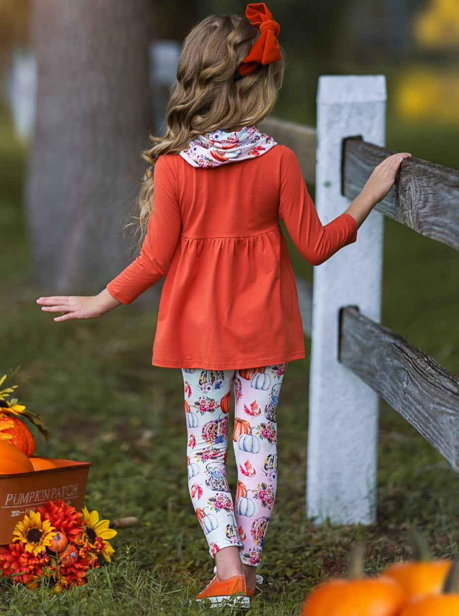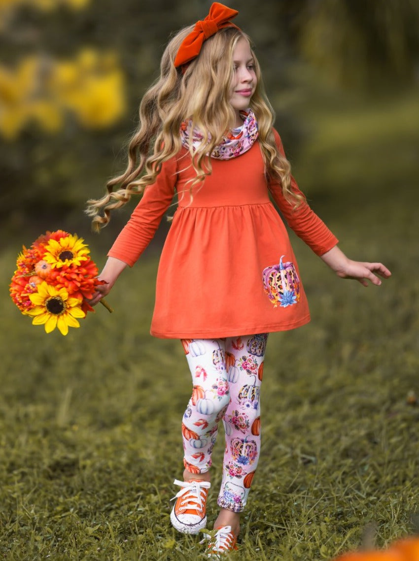 Long-sleeve orange ruffled tunic with mixed print pumpkin applique and pumpkin print leggings and a matching infinity wrap scarf