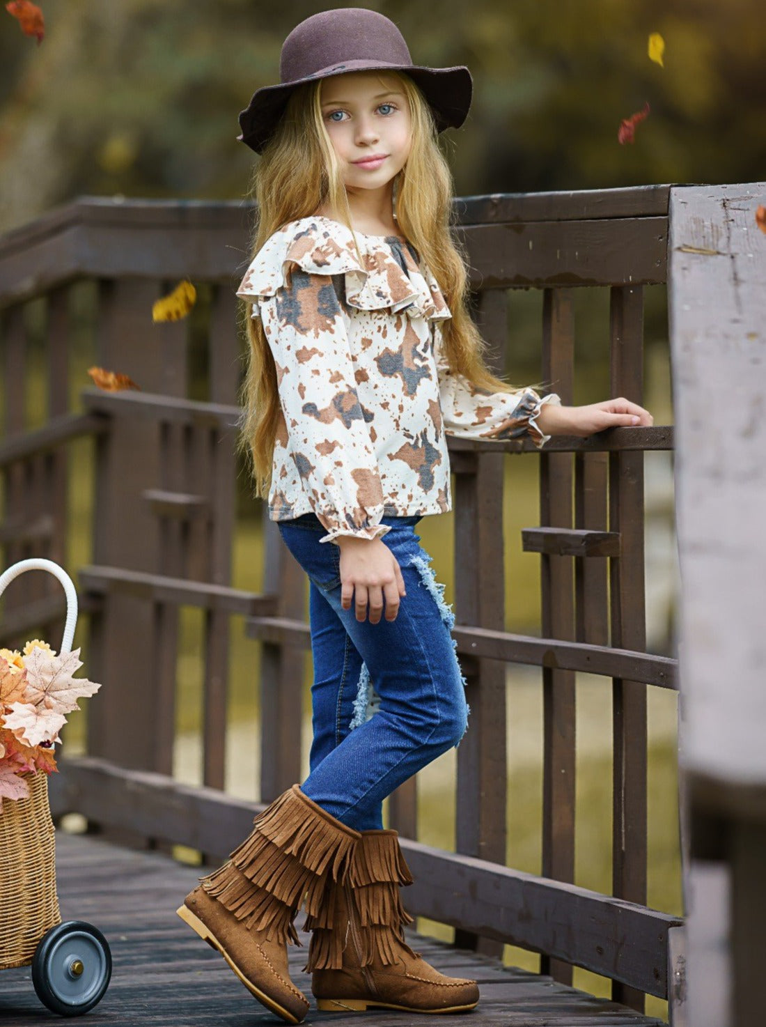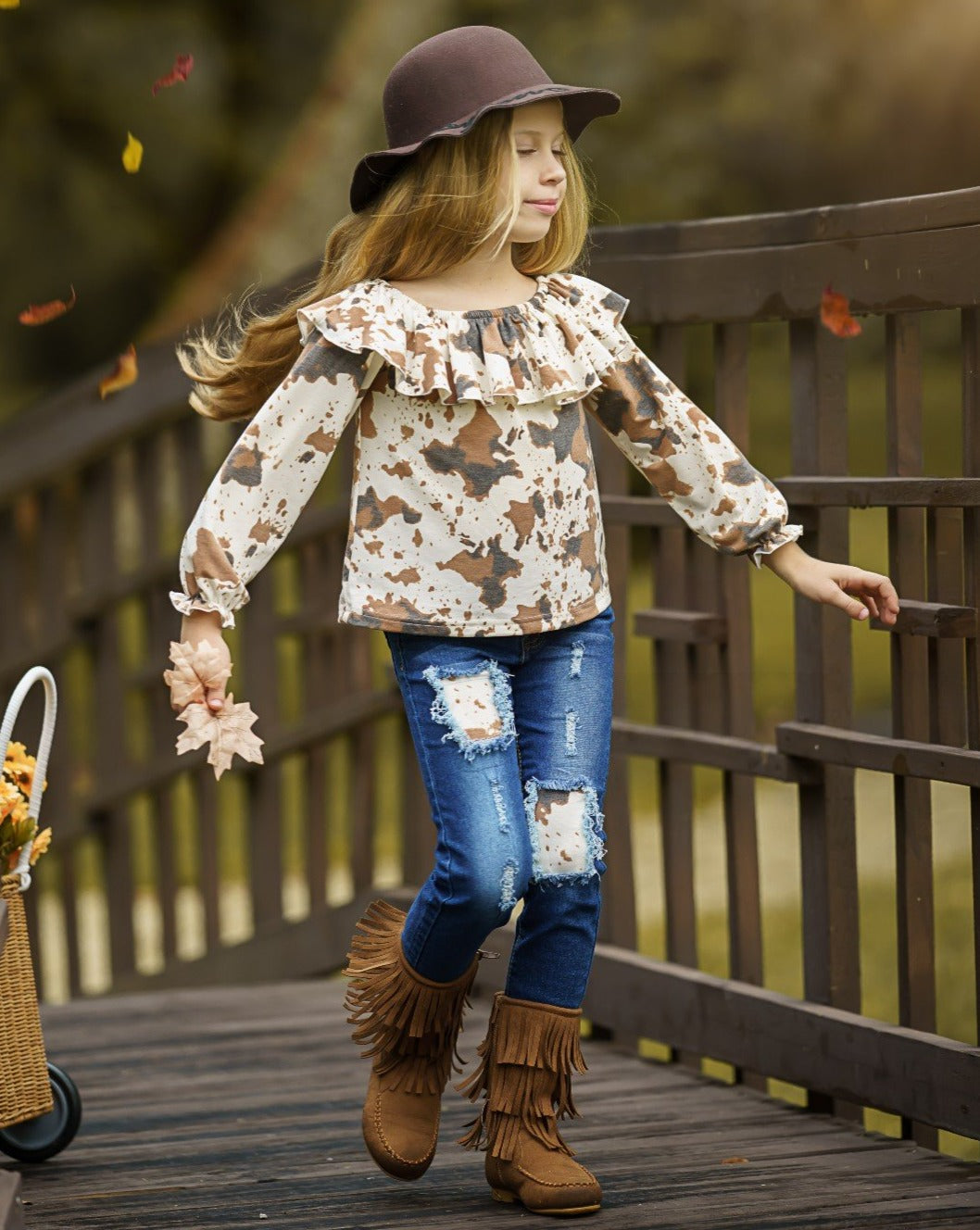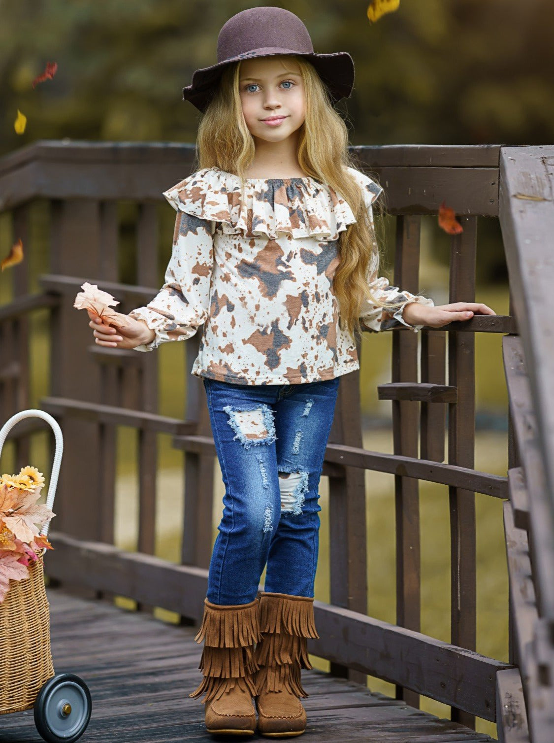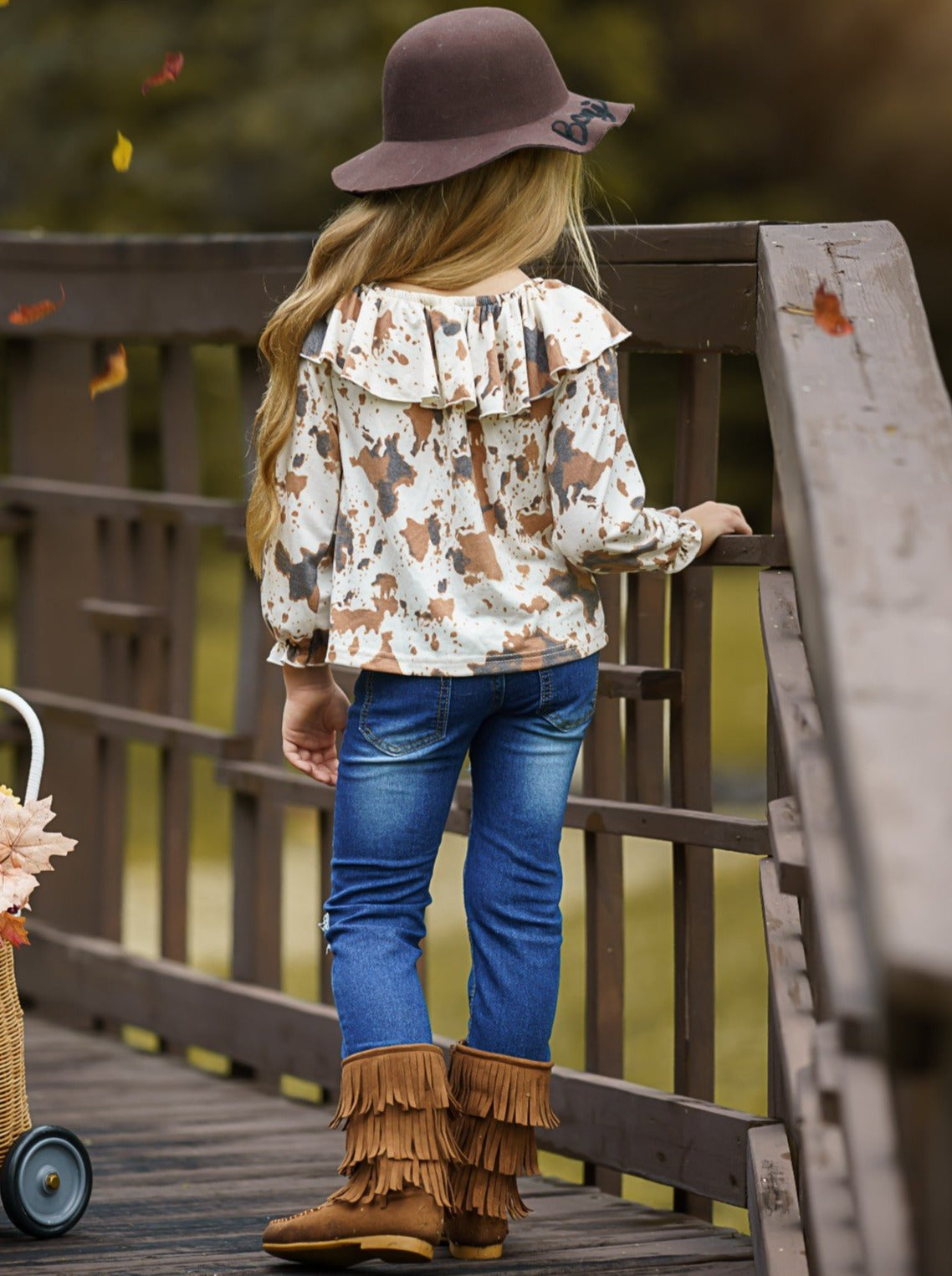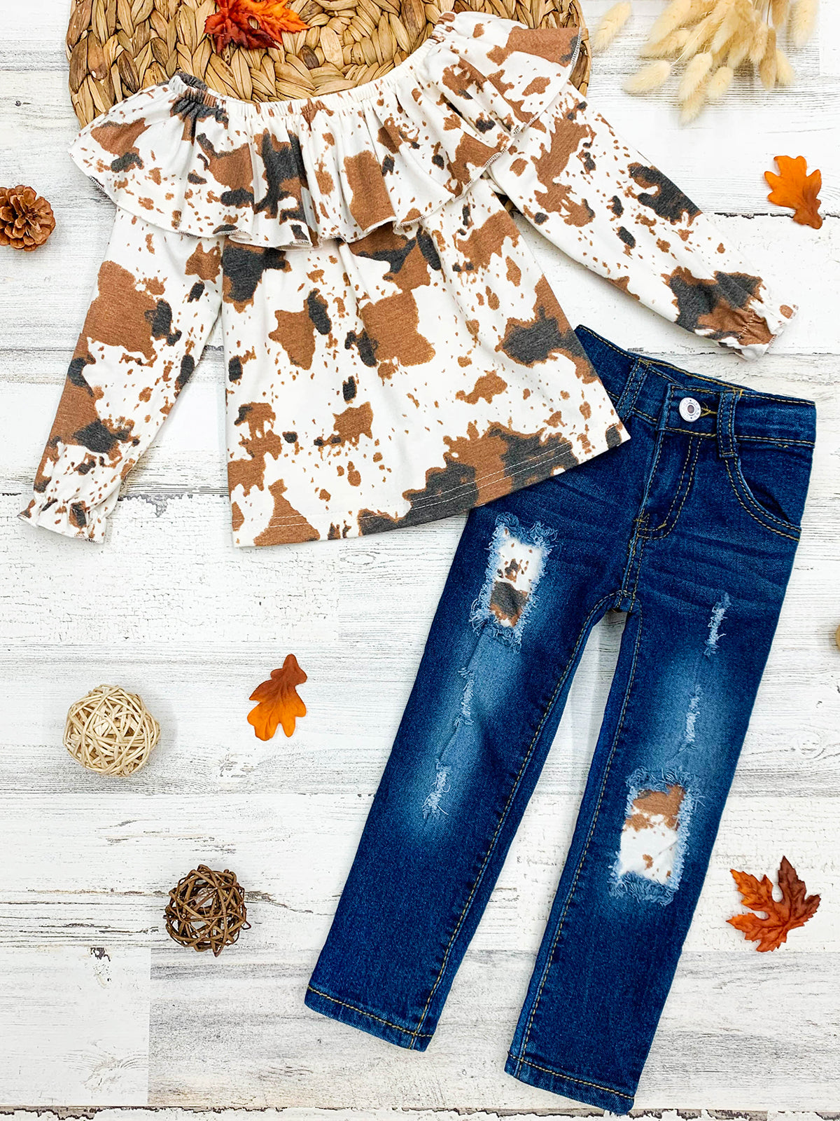 Getty-up and let's go in our cute cow print patched jeans set. Sweet ruffle details and trendy denim flair make it a must-have for the fall season